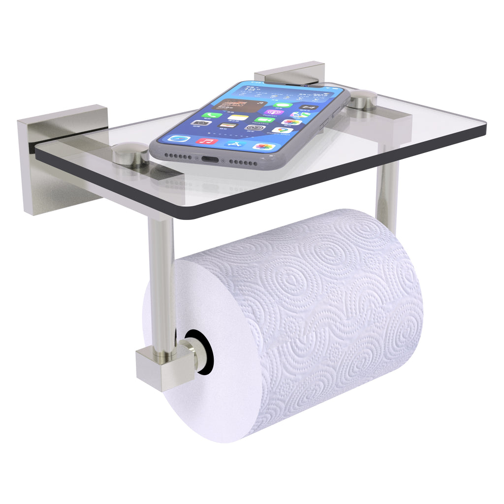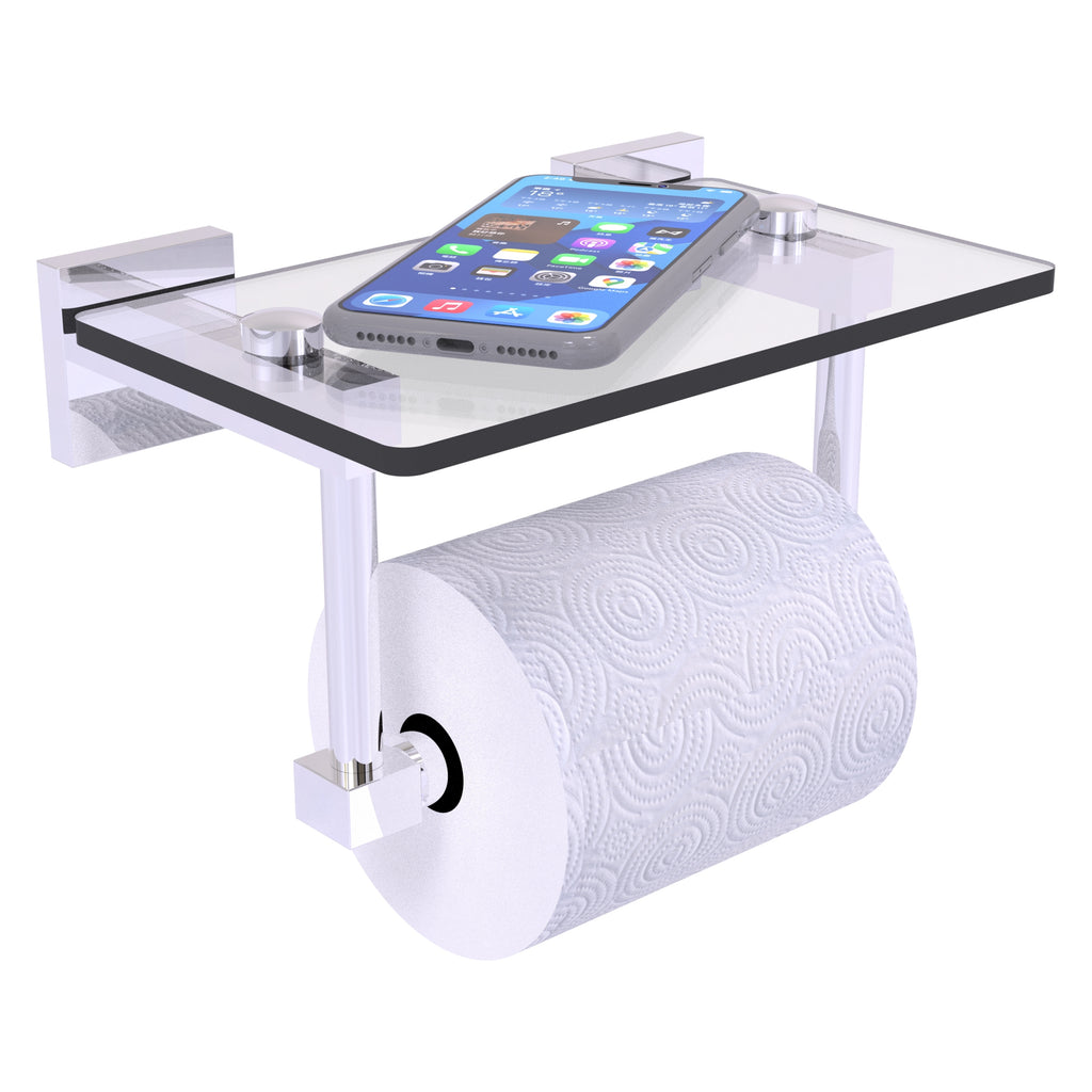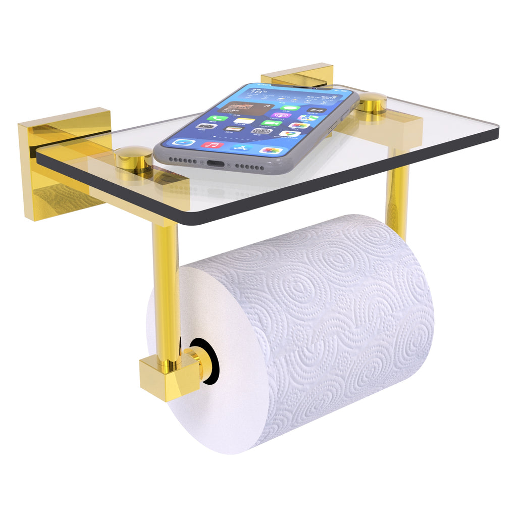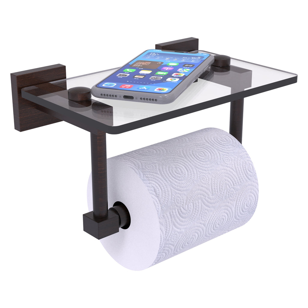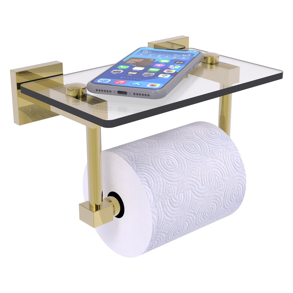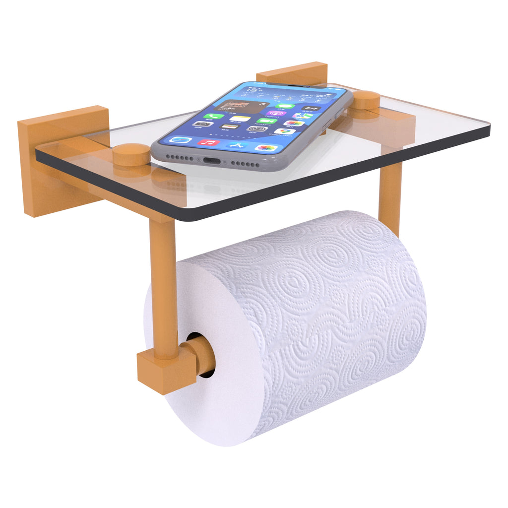 Upgrade your bathroom with the contemporary square design toilet paper holder with a glass shelf. This innovative design not only holds your toilet paper, but also provides a compact glass shelf above the roll holder, perfect for placing your phone or other personal items. The 5'' x 8'' wide glass shelf is the ideal size for the commode area and adds a touch of elegance to your bathroom. Made of solid brass and available in a variety of designer finishes, this toilet paper holder is built to last a lifetime. Get your contemporary square design toilet paper holder with a glass shelf today and enjoy its many benefits.