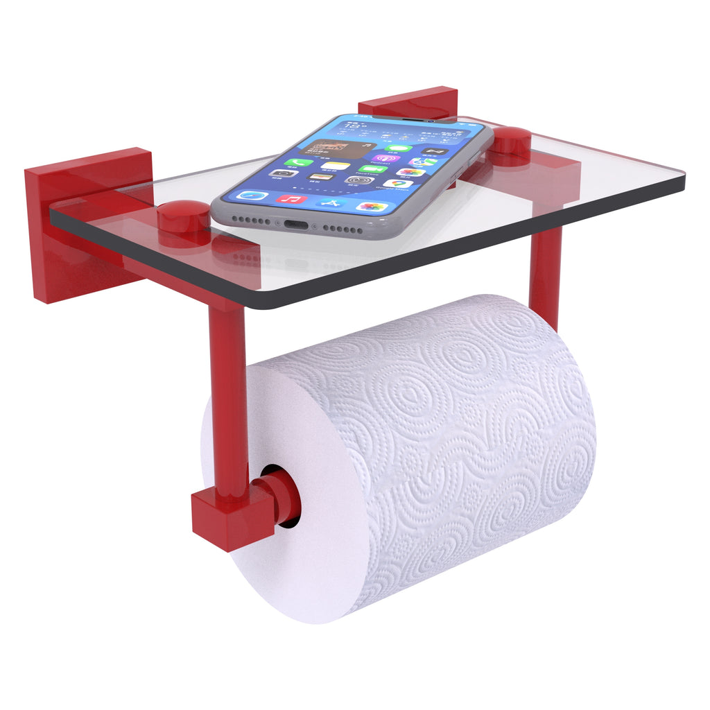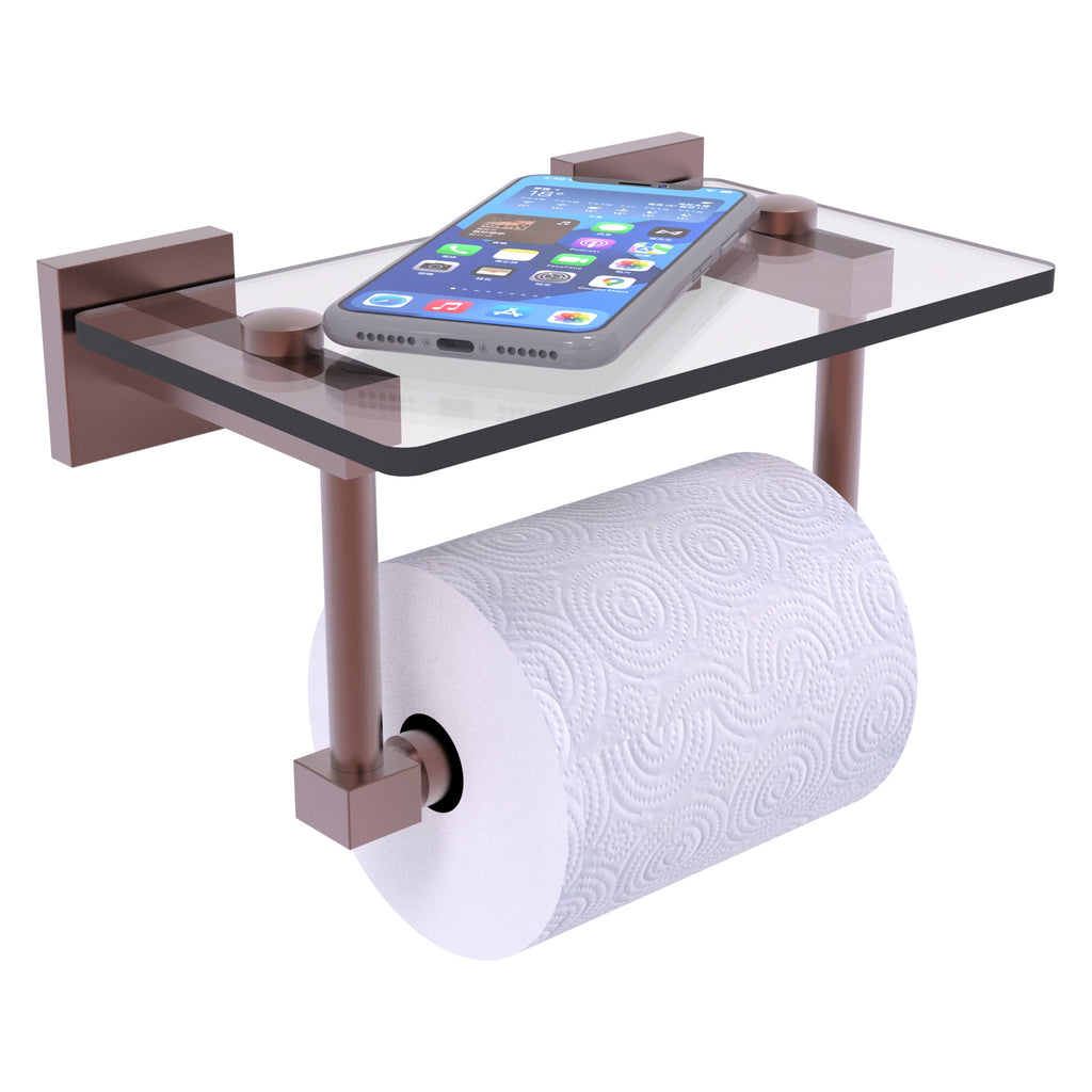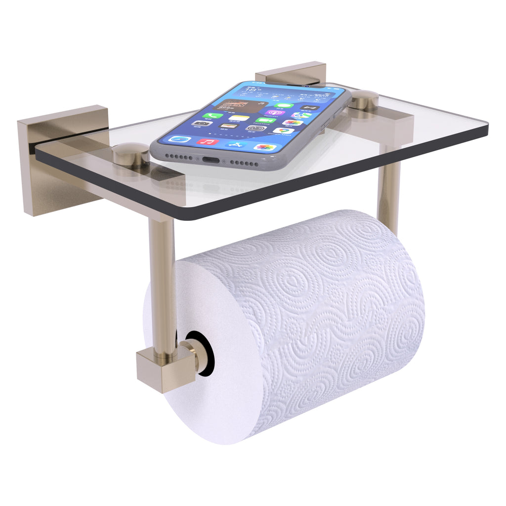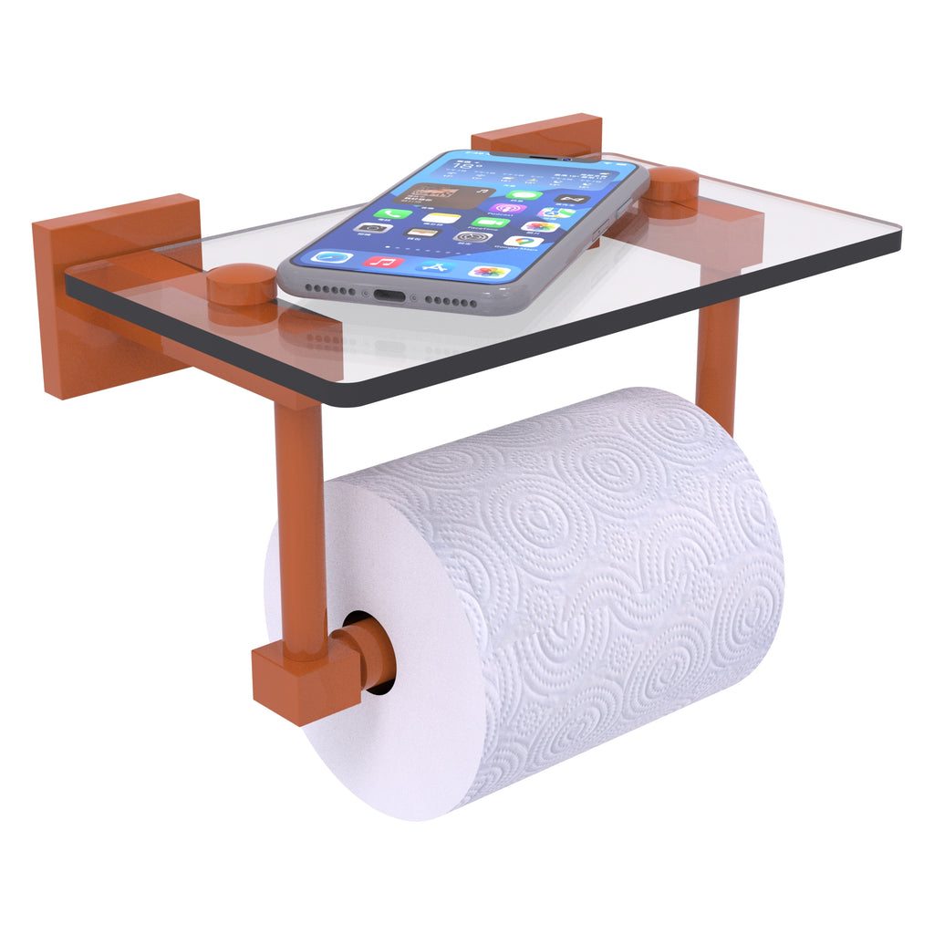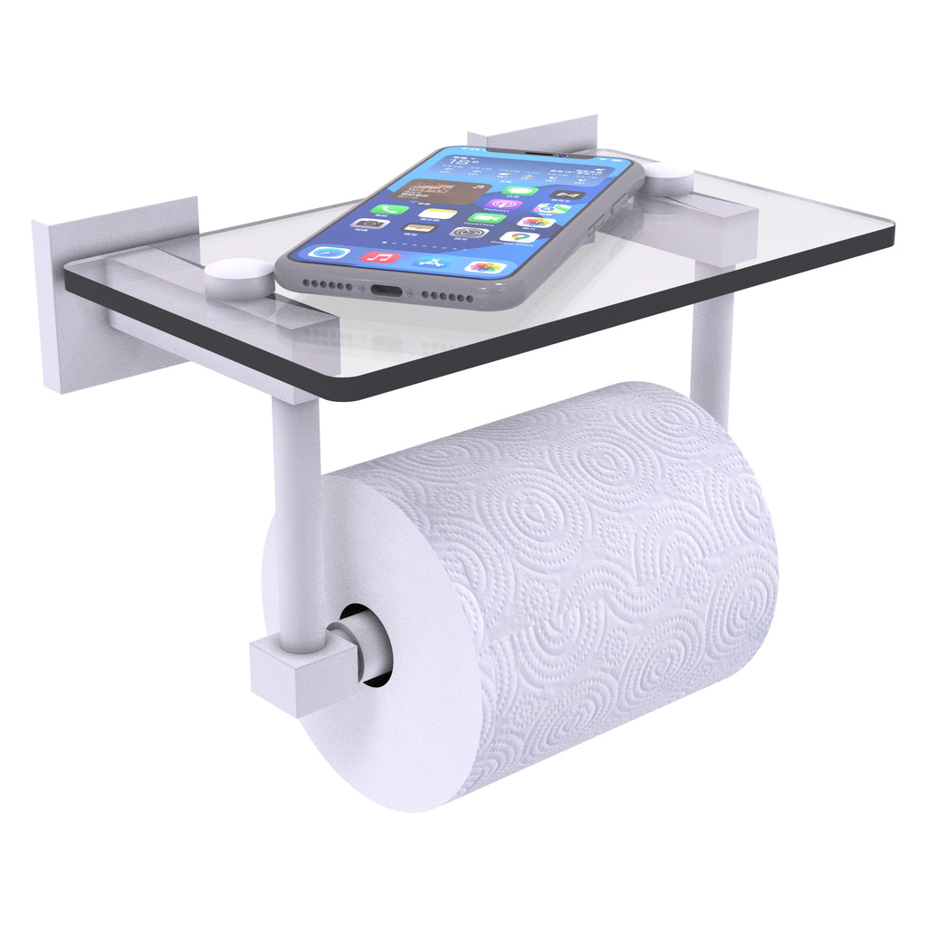 Upgrade your bathroom with the contemporary square design toilet paper holder with a glass shelf. This innovative design not only holds your toilet paper, but also provides a compact glass shelf above the roll holder, perfect for placing your phone or other personal items. The 5'' x 8'' wide glass shelf is the ideal size for the commode area and adds a touch of elegance to your bathroom. Made of solid brass and available in a variety of designer finishes, this toilet paper holder is built to last a lifetime. Get your contemporary square design toilet paper holder with a glass shelf today and enjoy its many benefits.