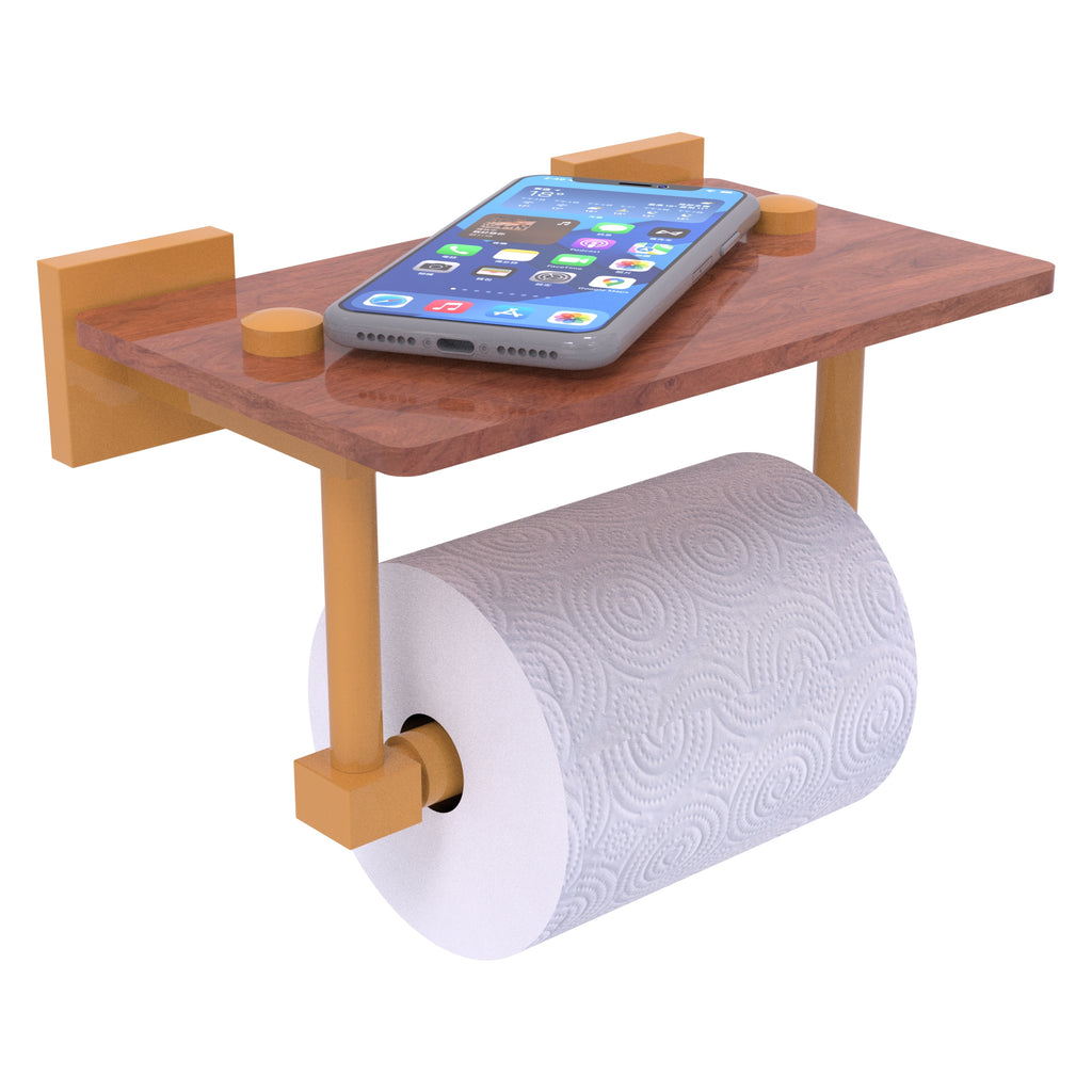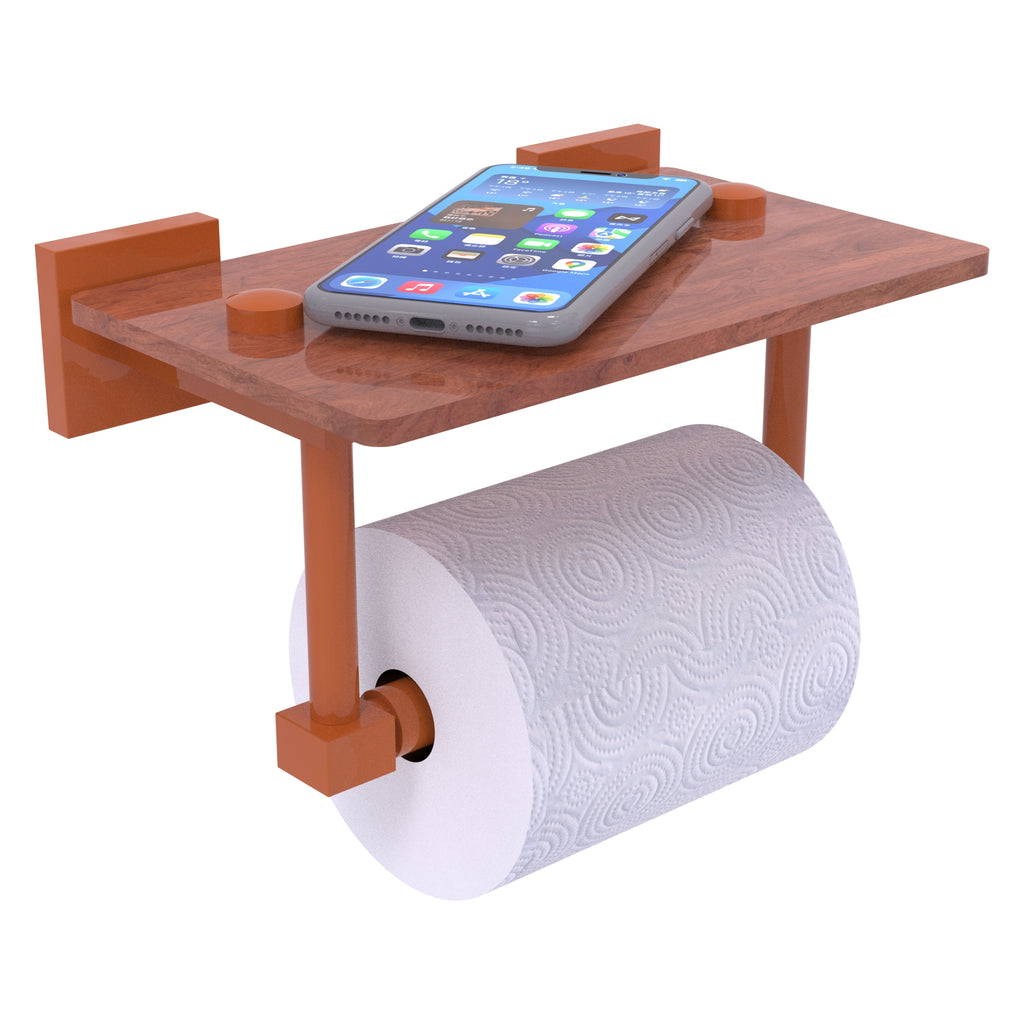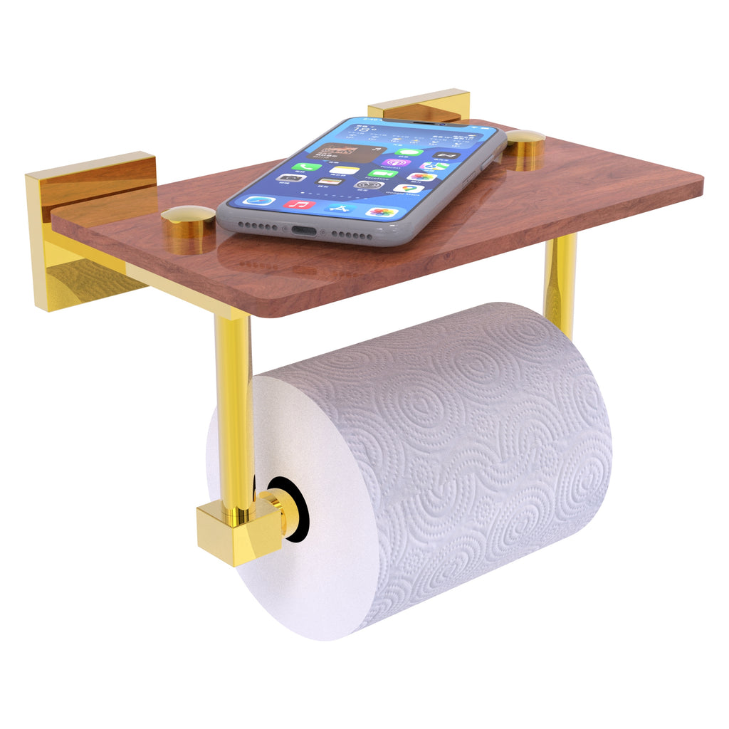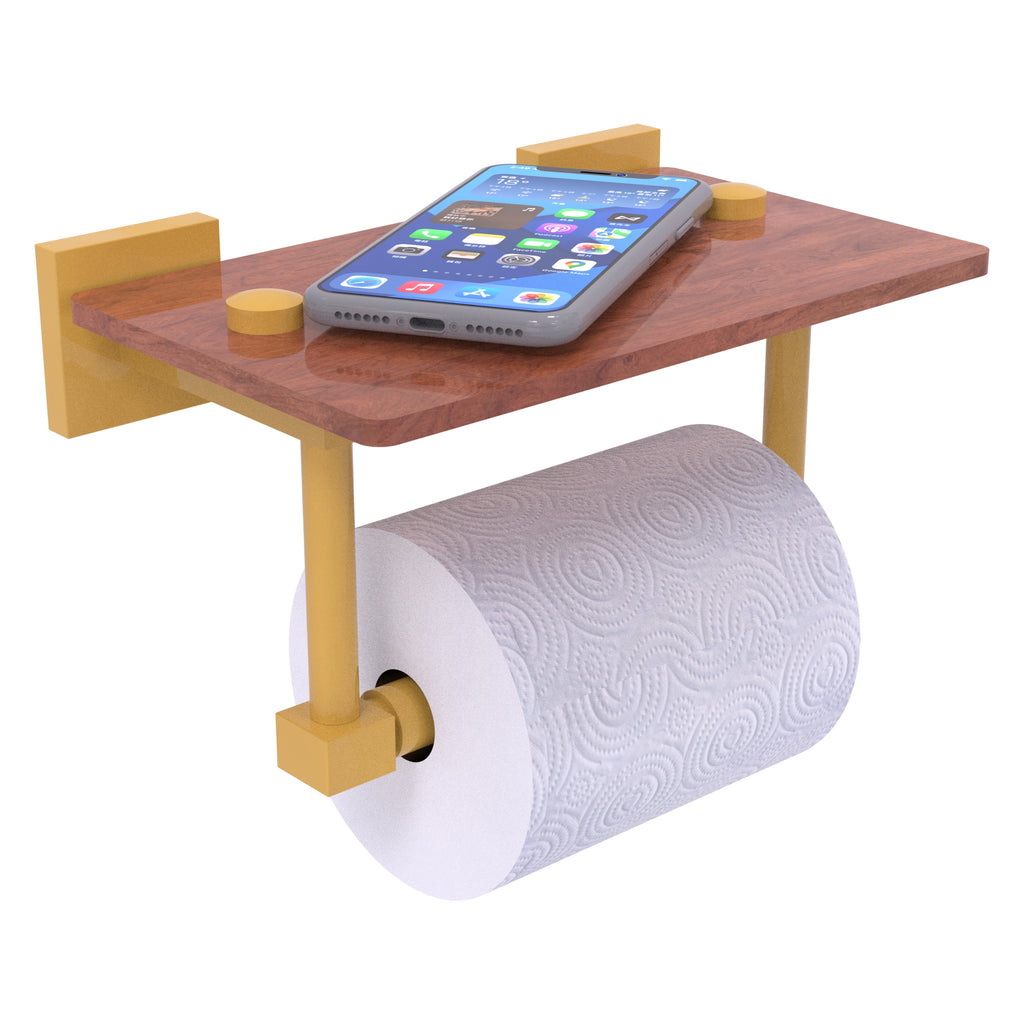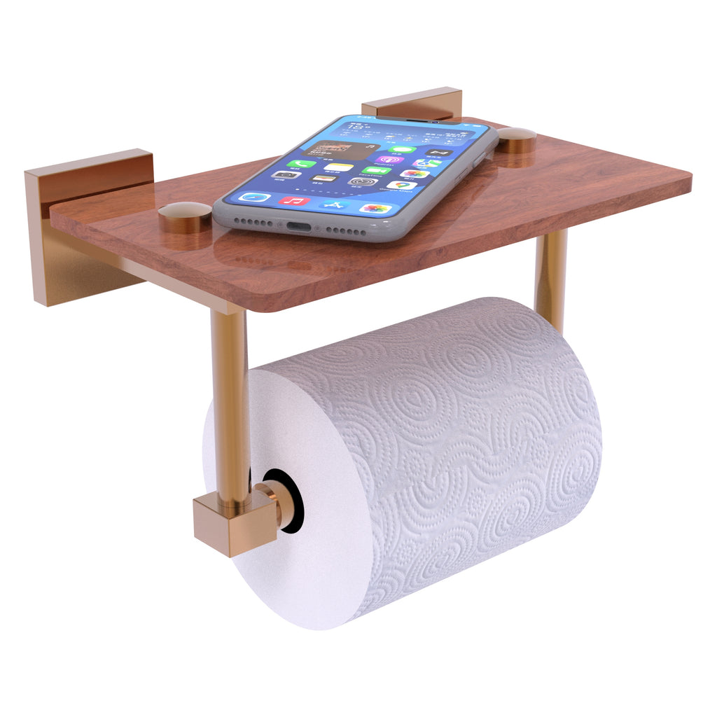 Elevate your bathroom decor with the contemporary square design toilet paper holder with a hardwood shelf. This unique design not only holds your toilet paper but also provides a compact hardwood shelf above the roll holder, perfect for holding your phone or other personal items. The hardwood shelf adds a touch of natural beauty to your bathroom and is the ideal size for the commode area. Made of solid brass and available in a variety of designer finishes, this toilet paper holder is built to last a lifetime. Say goodbye to boring and basic toilet paper holders and upgrade to one that adds convenience and style to your bathroom.