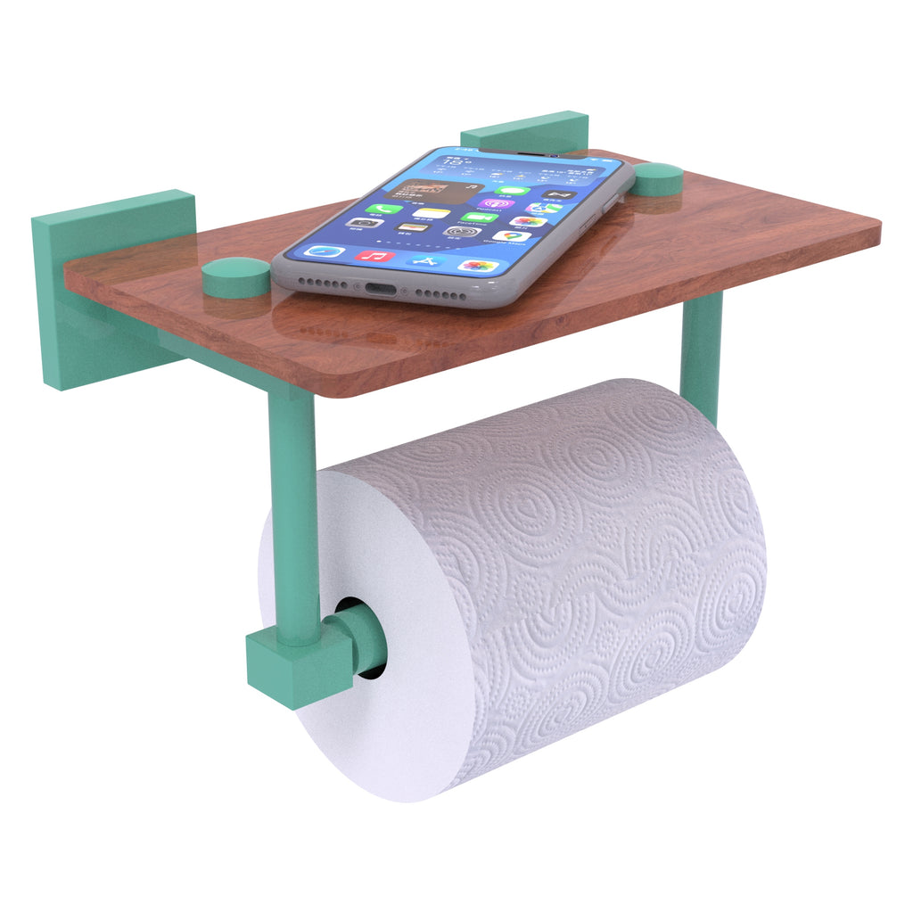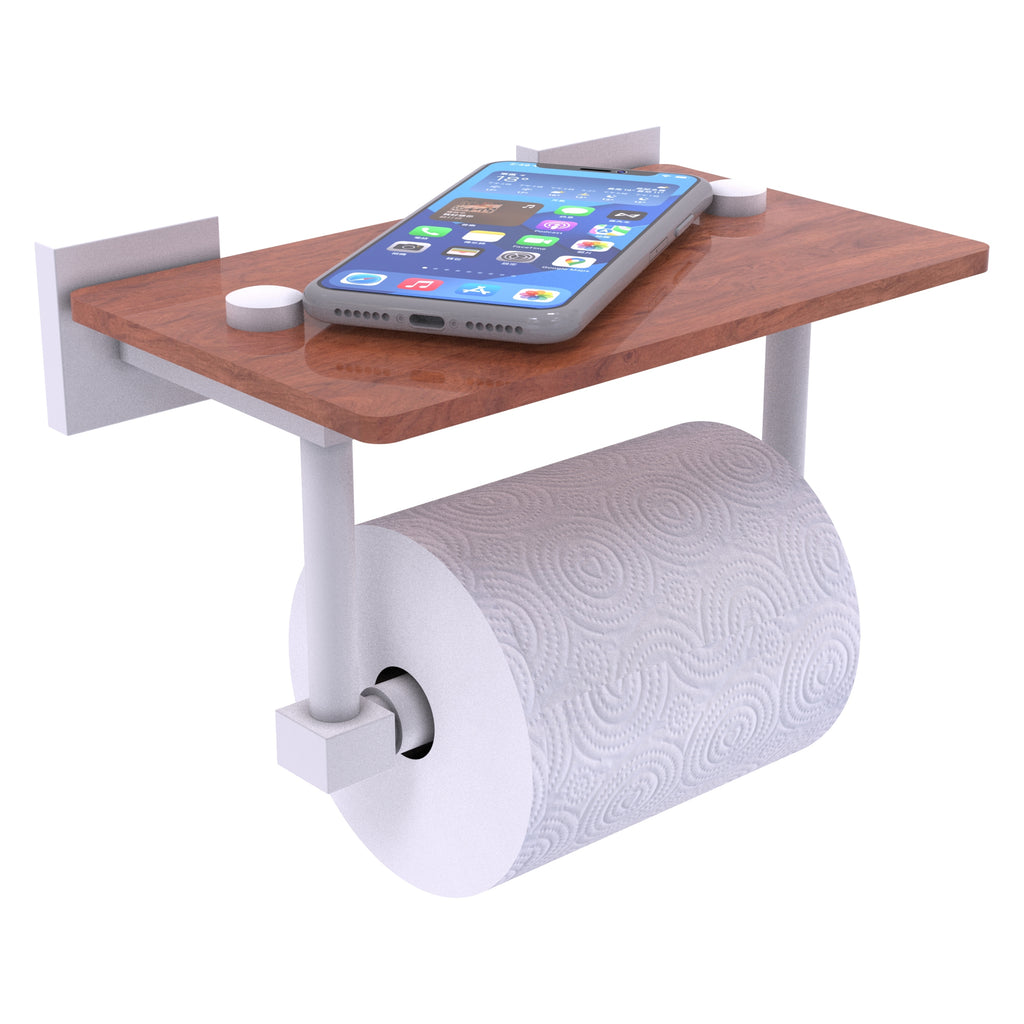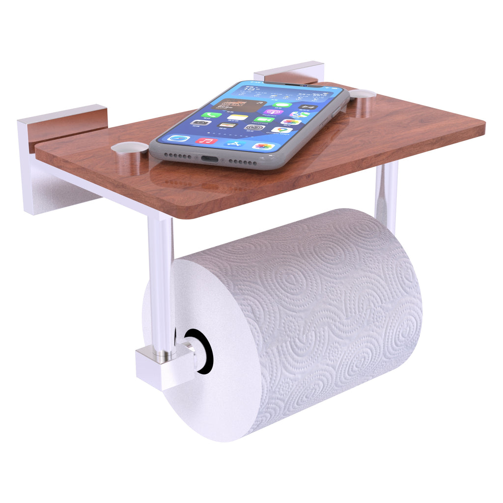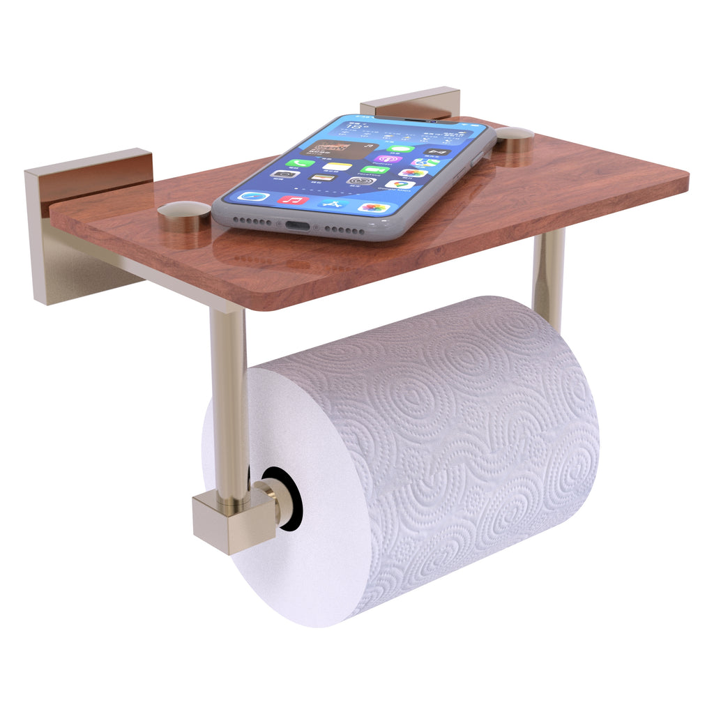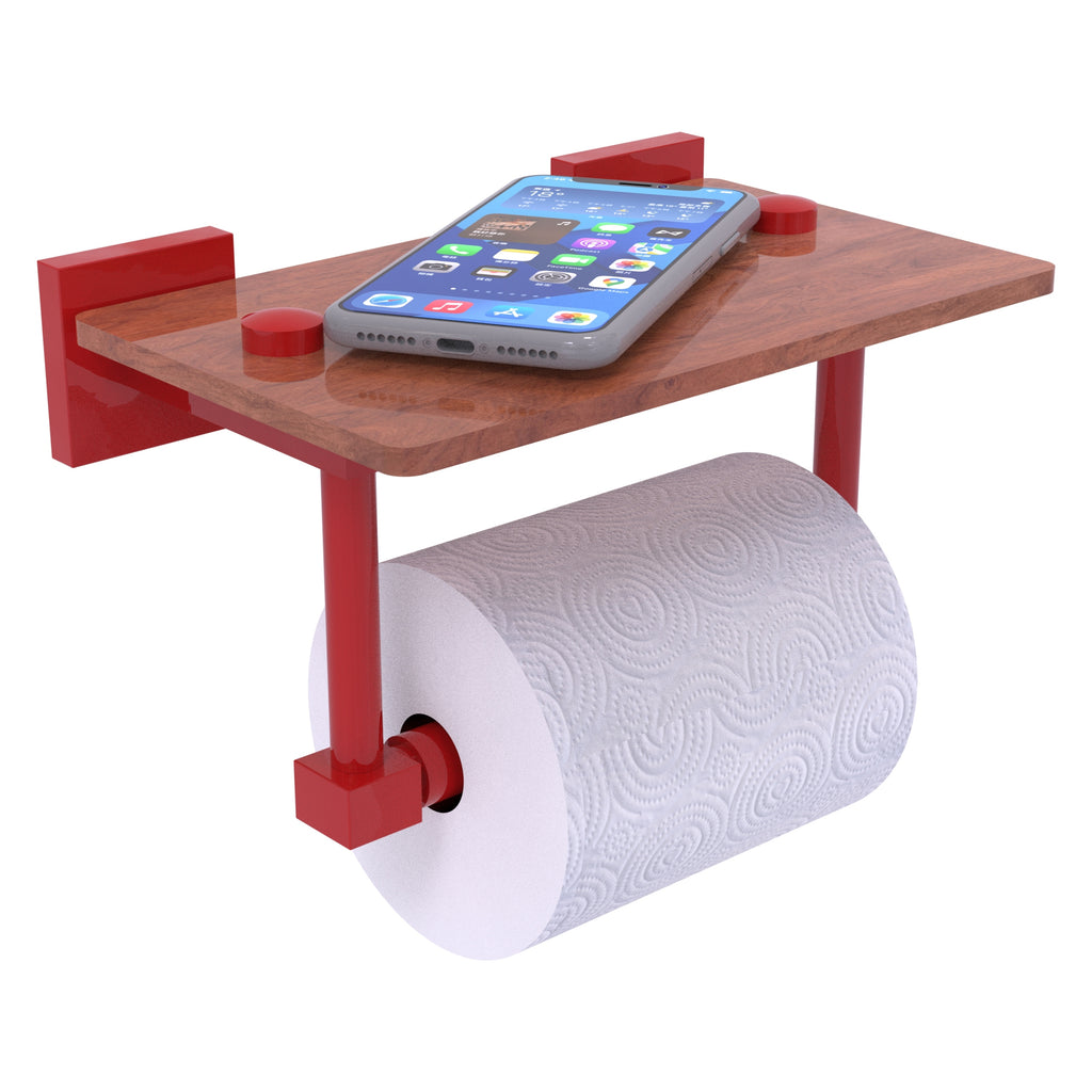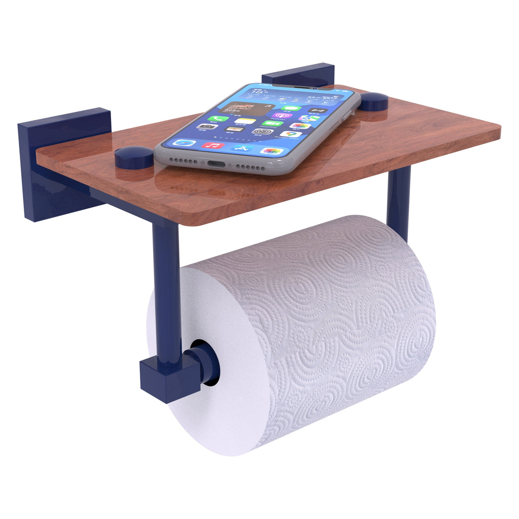 Elevate your bathroom decor with the contemporary square design toilet paper holder with a hardwood shelf. This unique design not only holds your toilet paper but also provides a compact hardwood shelf above the roll holder, perfect for holding your phone or other personal items. The hardwood shelf adds a touch of natural beauty to your bathroom and is the ideal size for the commode area. Made of solid brass and available in a variety of designer finishes, this toilet paper holder is built to last a lifetime. Say goodbye to boring and basic toilet paper holders and upgrade to one that adds convenience and style to your bathroom.