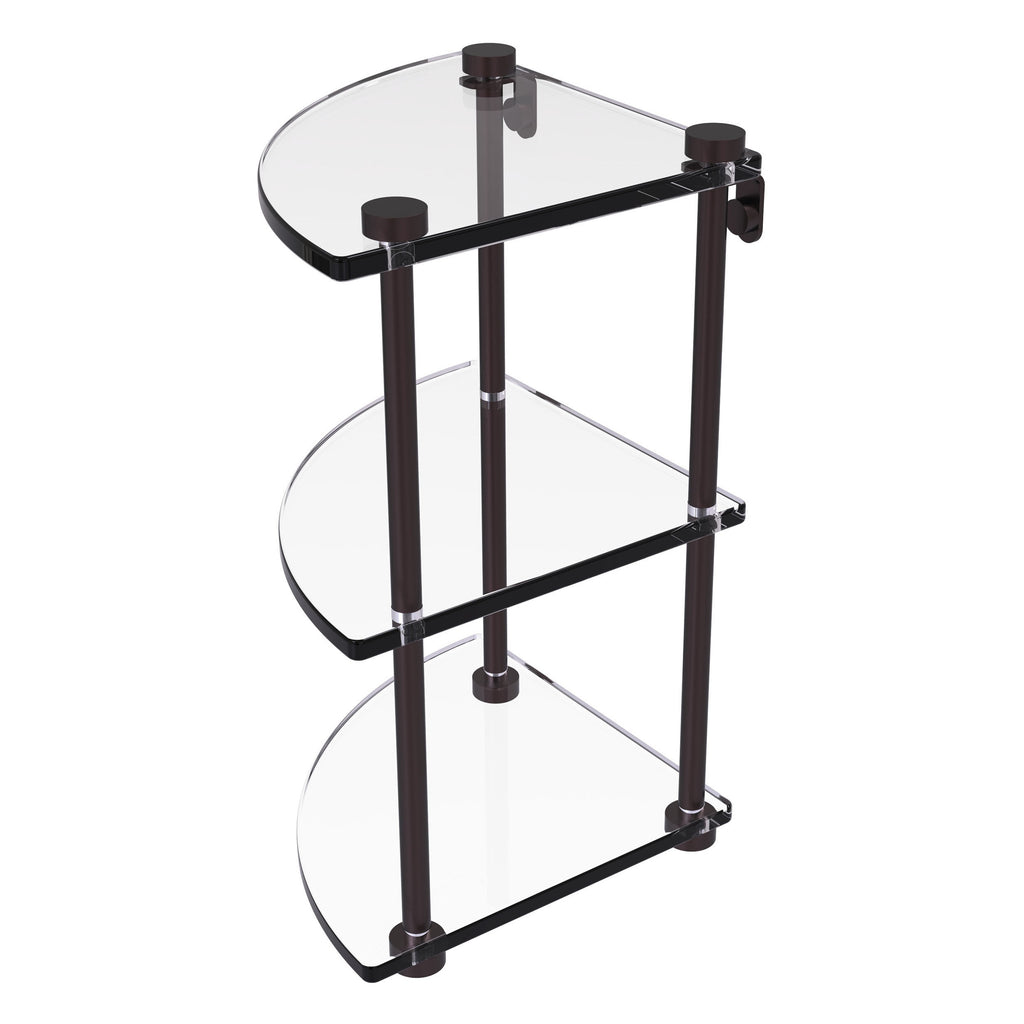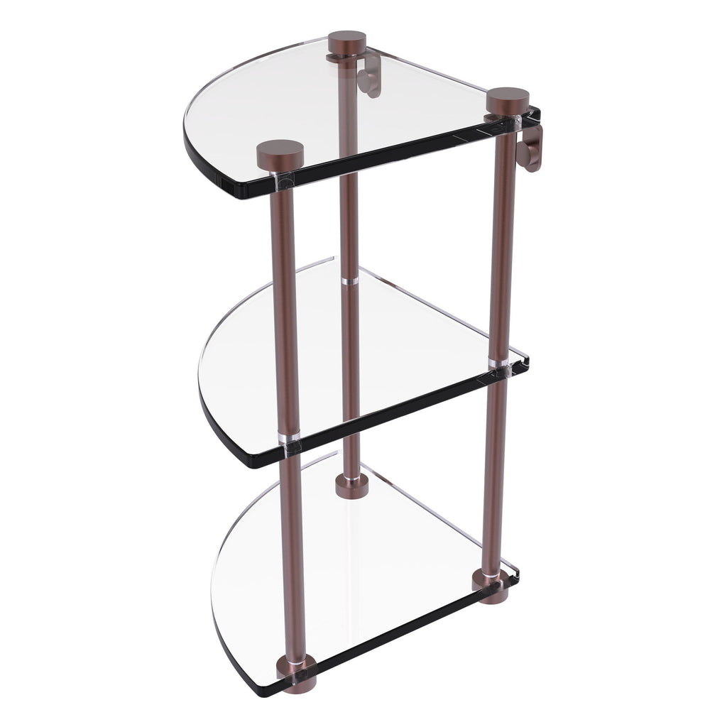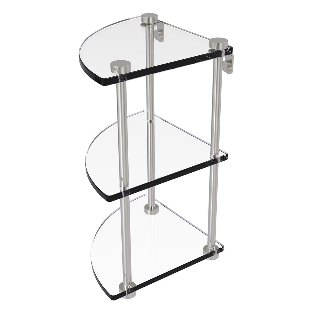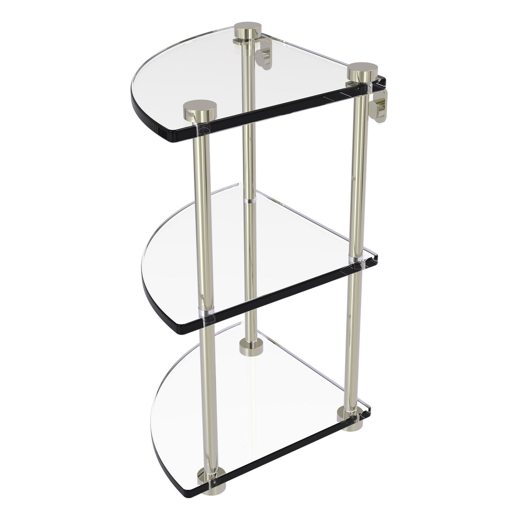 Add space and organization to your bathroom with this simple, contemporary design 3-tier glass vanity corner shelf. Featuring tempered, beveled-edged glass and solid brass hardware this shelving unit is crafted for durability, strength and style. One of the many coordinating accessories in the Allied Brass collection of products, this subtle glass shelf unit is the perfect complement to your bathroom decor.