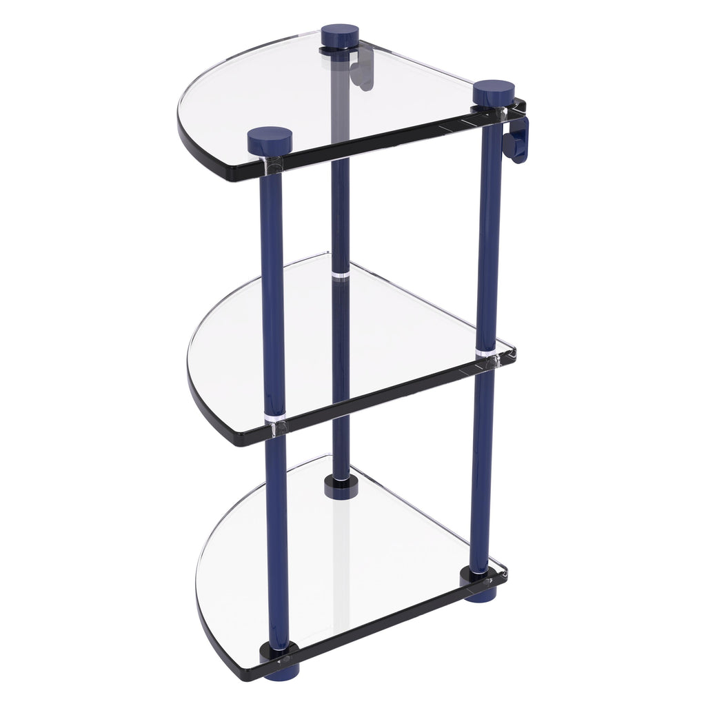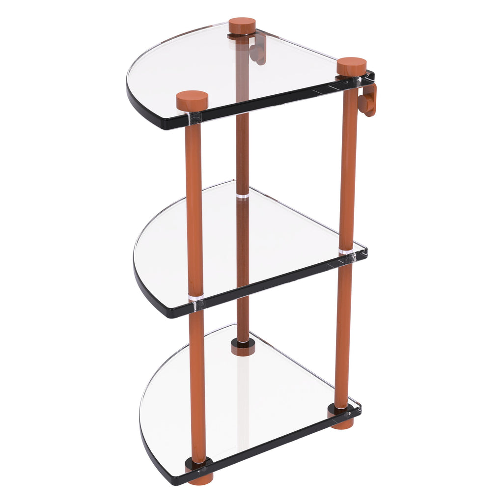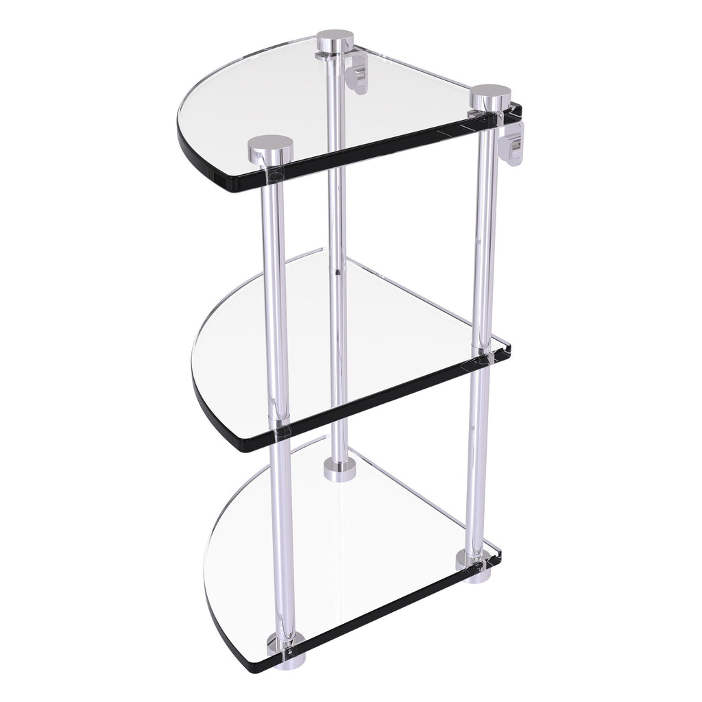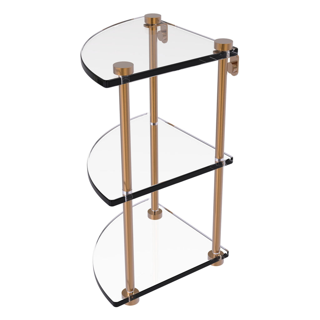 Add space and organization to your bathroom with this simple, contemporary design 3-tier glass vanity corner shelf. Featuring tempered, beveled-edged glass and solid brass hardware this shelving unit is crafted for durability, strength and style. One of the many coordinating accessories in the Allied Brass collection of products, this subtle glass shelf unit is the perfect complement to your bathroom decor.