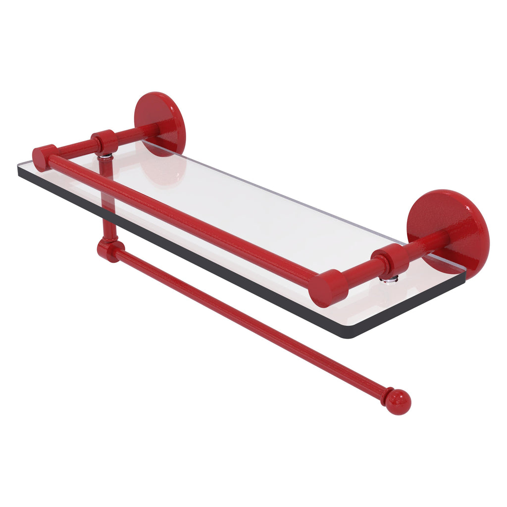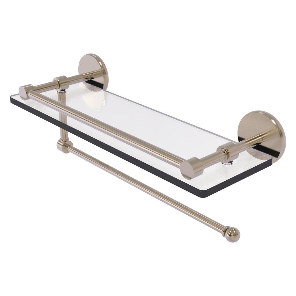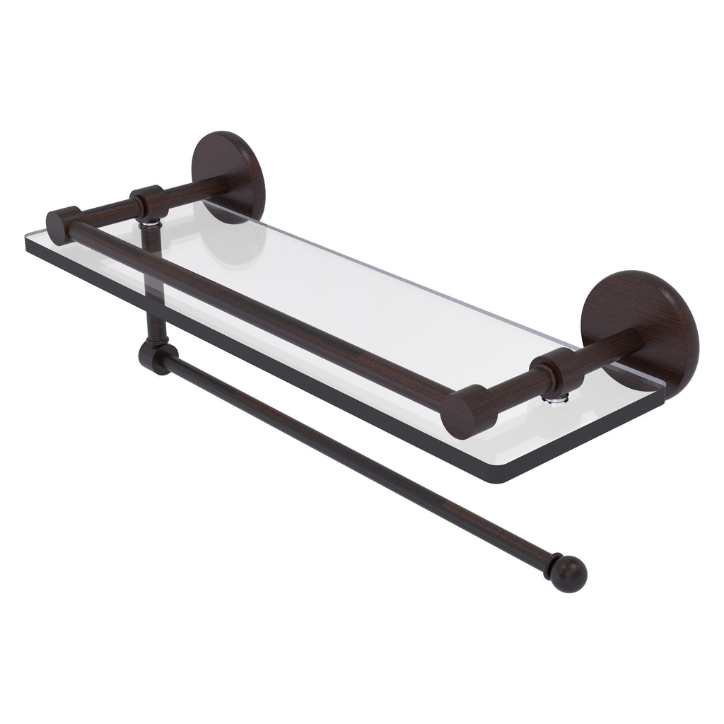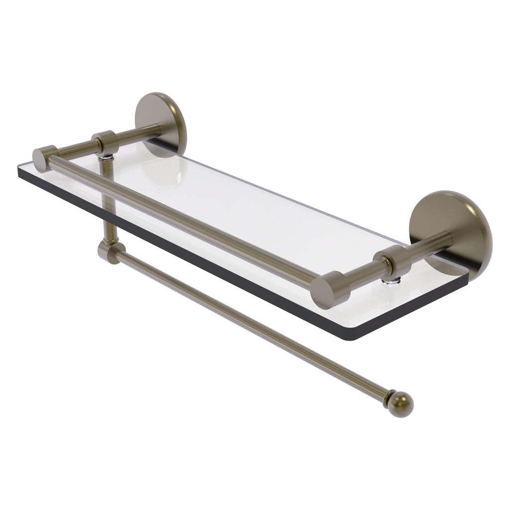 Maximize space and efficiency with this beautiful glass shelf and paper towel holder combination. Gallery rail will keep your items secure while the integrated paper towel holder provides a creative space for your roll. Made of solid brass and tempered