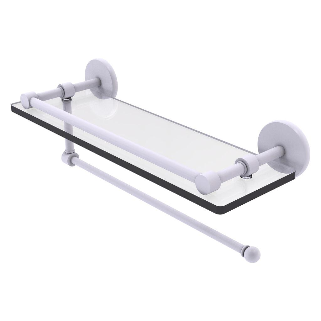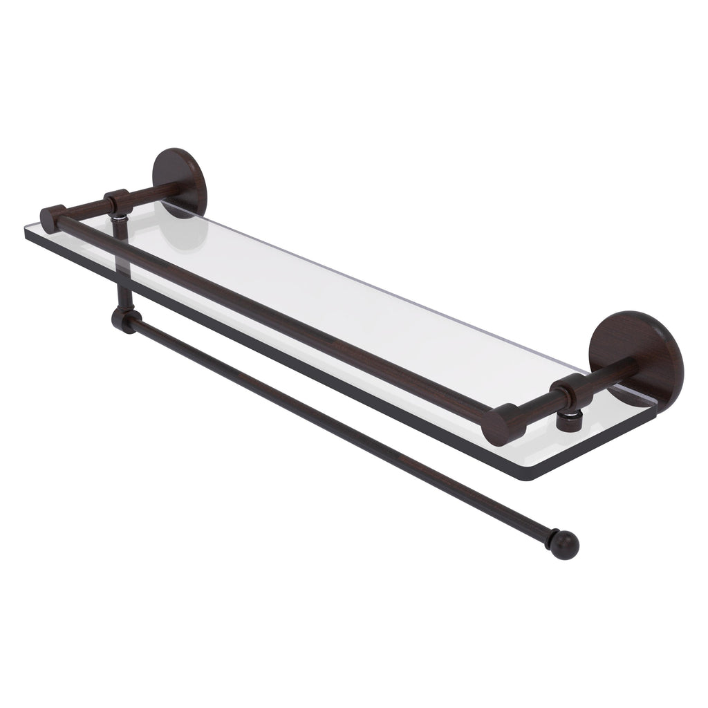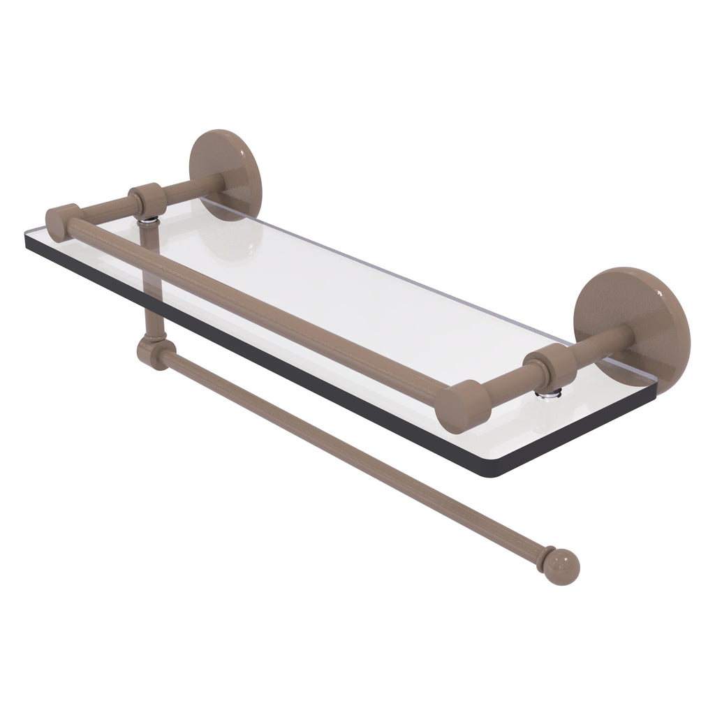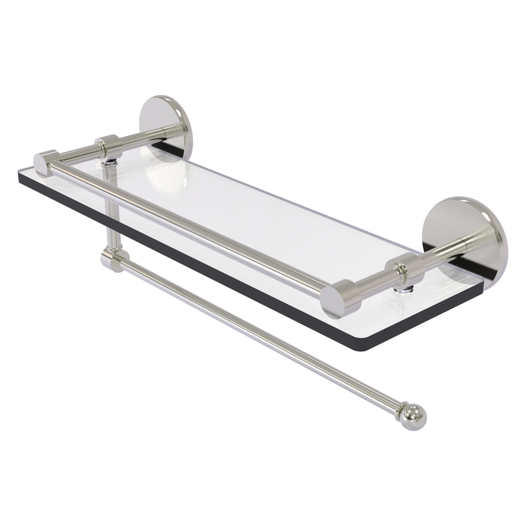 Maximize space and efficiency with this beautiful glass shelf and paper towel holder combination. Gallery rail will keep your items secure while the integrated paper towel holder provides a creative space for your roll. Made of solid brass and tempered