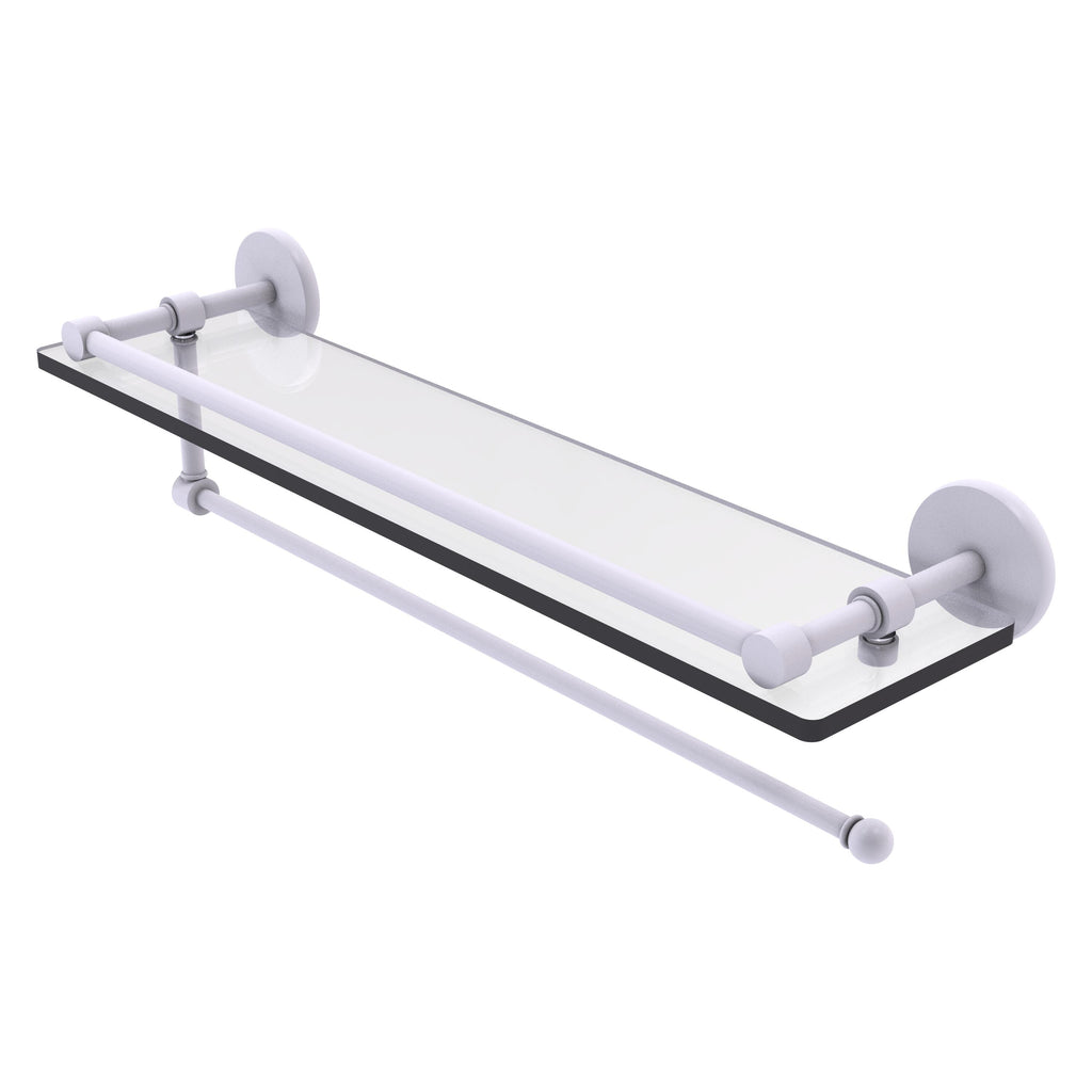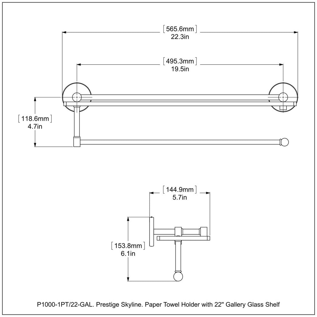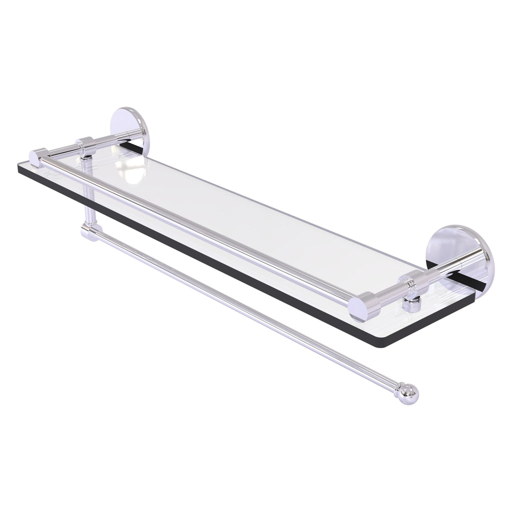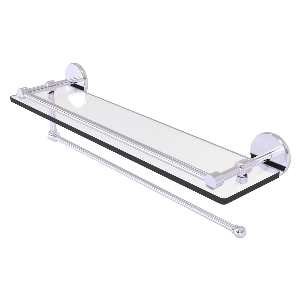 Maximize space and efficiency with this beautiful glass shelf and paper towel holder combination. Gallery rail will keep your items secure while the integrated paper towel holder provides a creative space for your roll. Made of solid brass and tempered