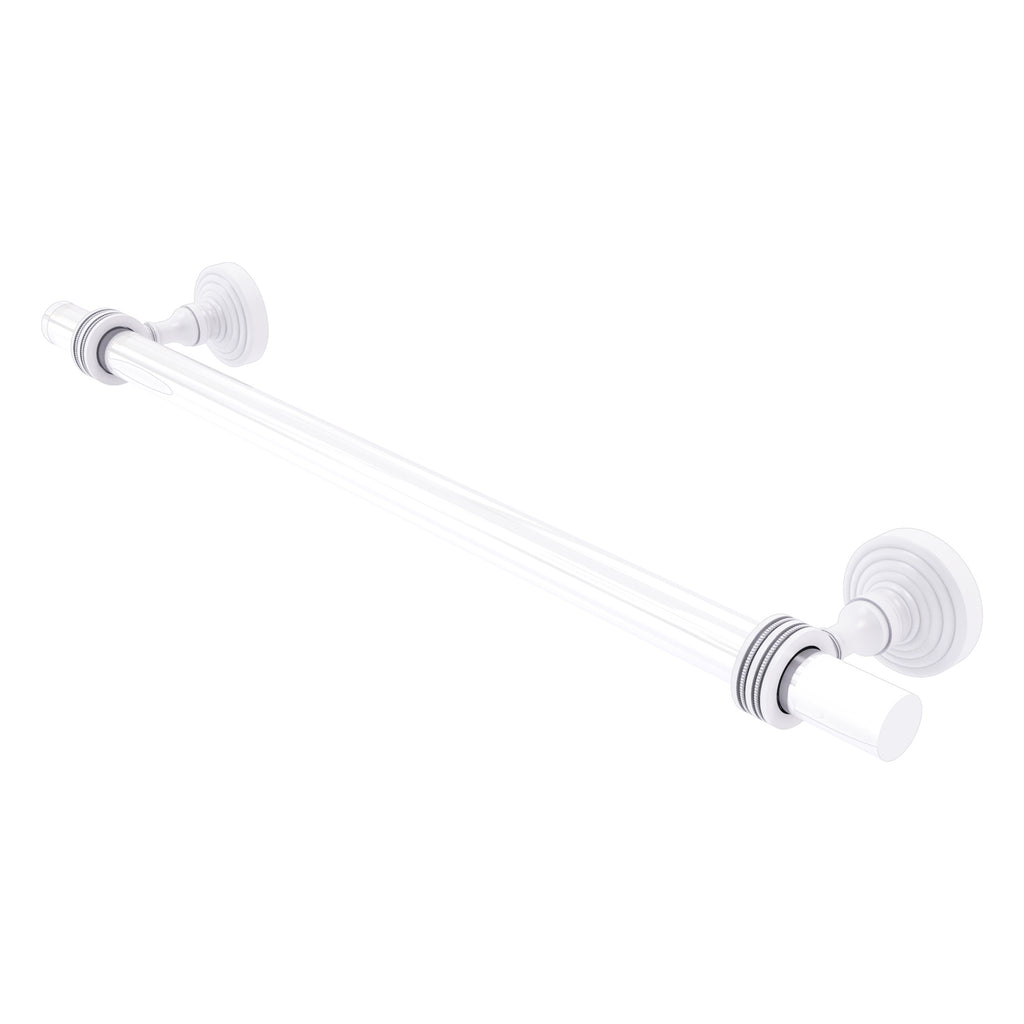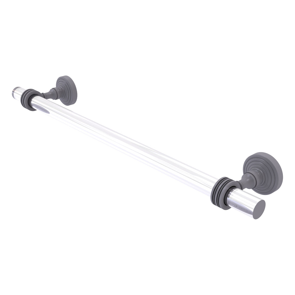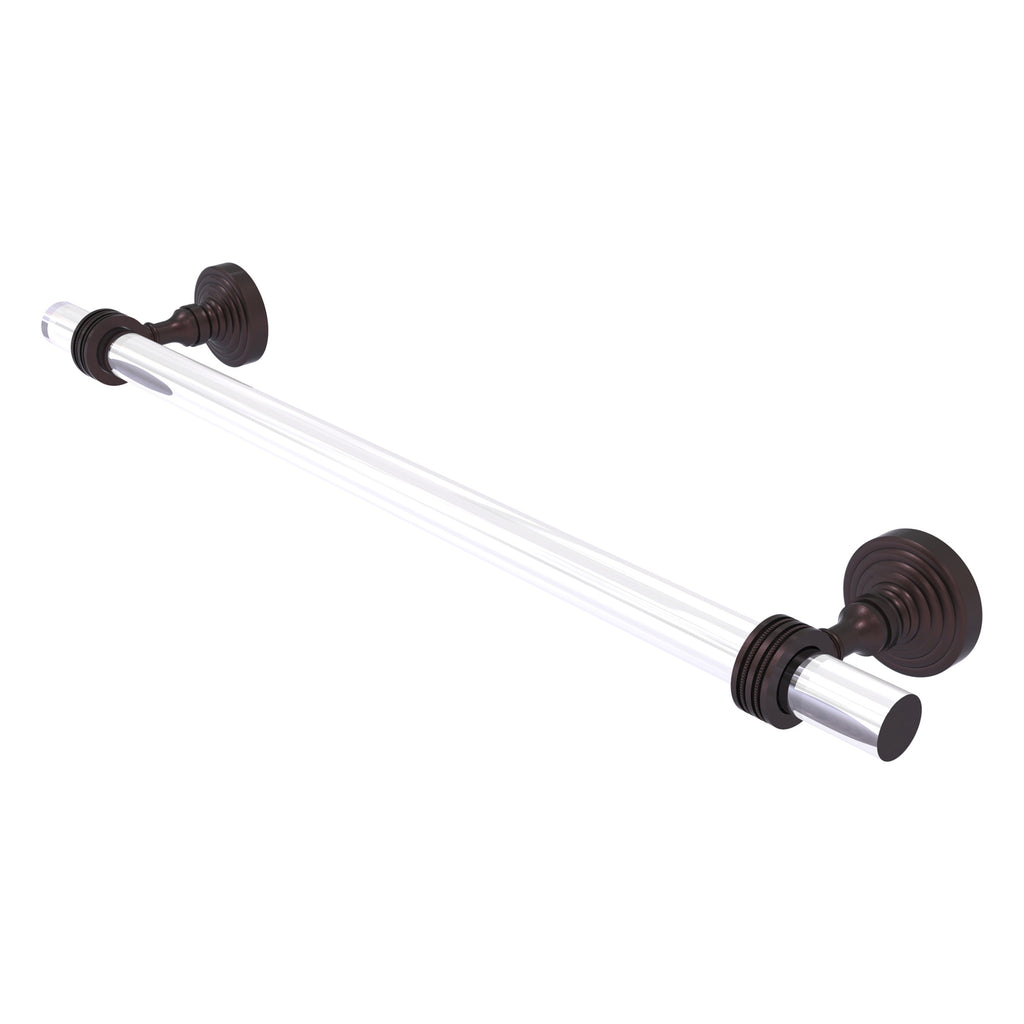 Brass and acrylic meet in this design that subtly shows off the strength of each material. This very elegant towel bar will complement--and show off--virtually any towel hung upon it. Finely crafted of solid brass with accents of clear acrylic create the unique design to add the finishing touch to your project. Towel bar is finished with our designer lifetime finishes to provide unparalleled performance.