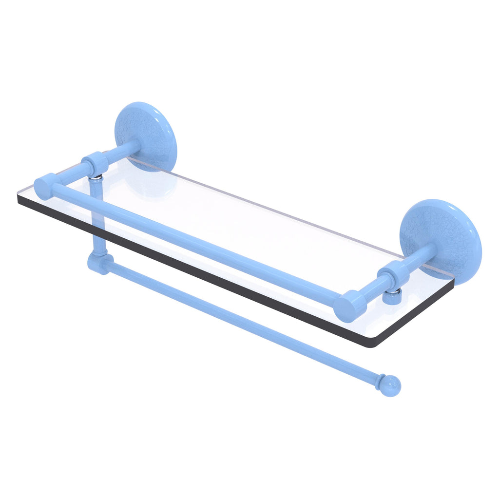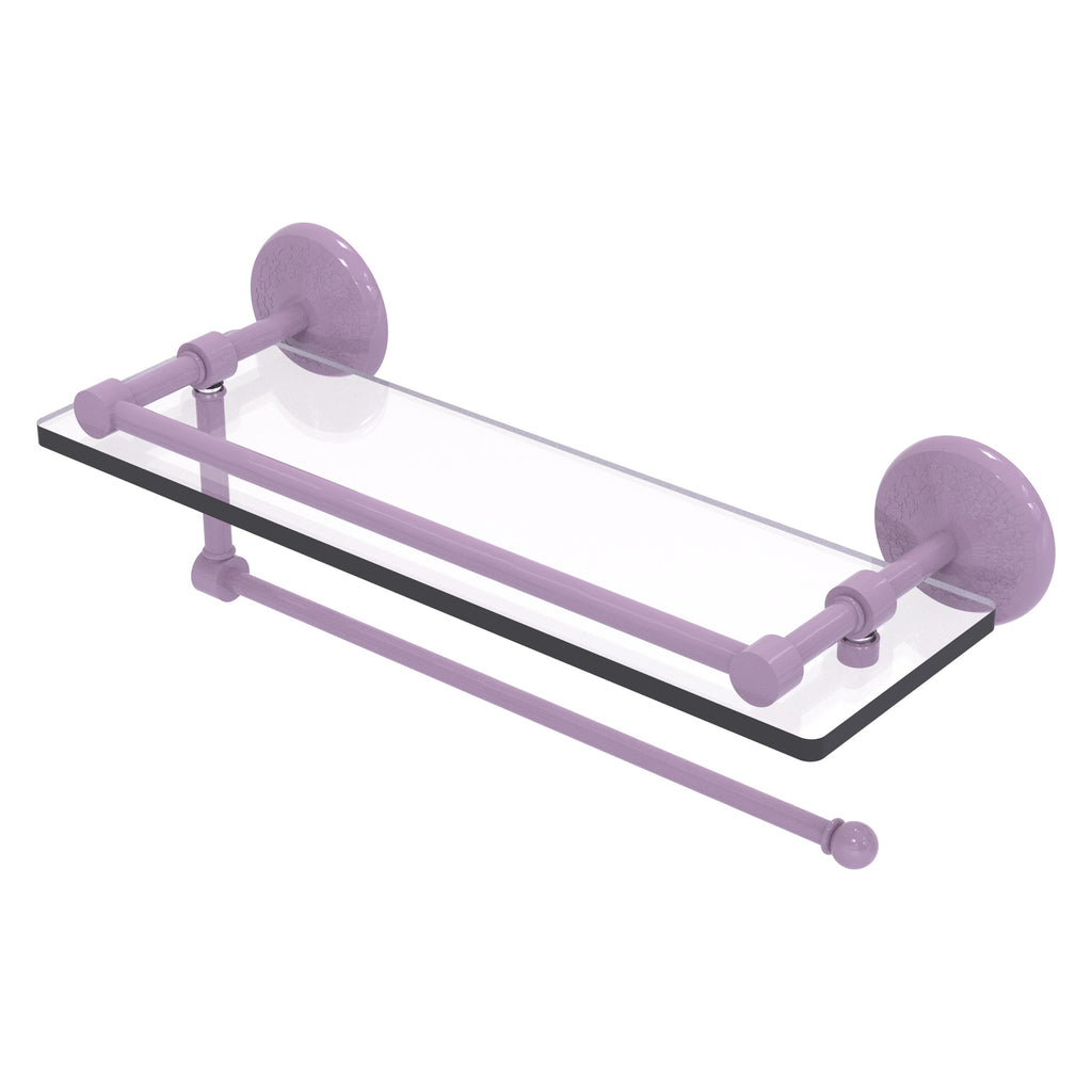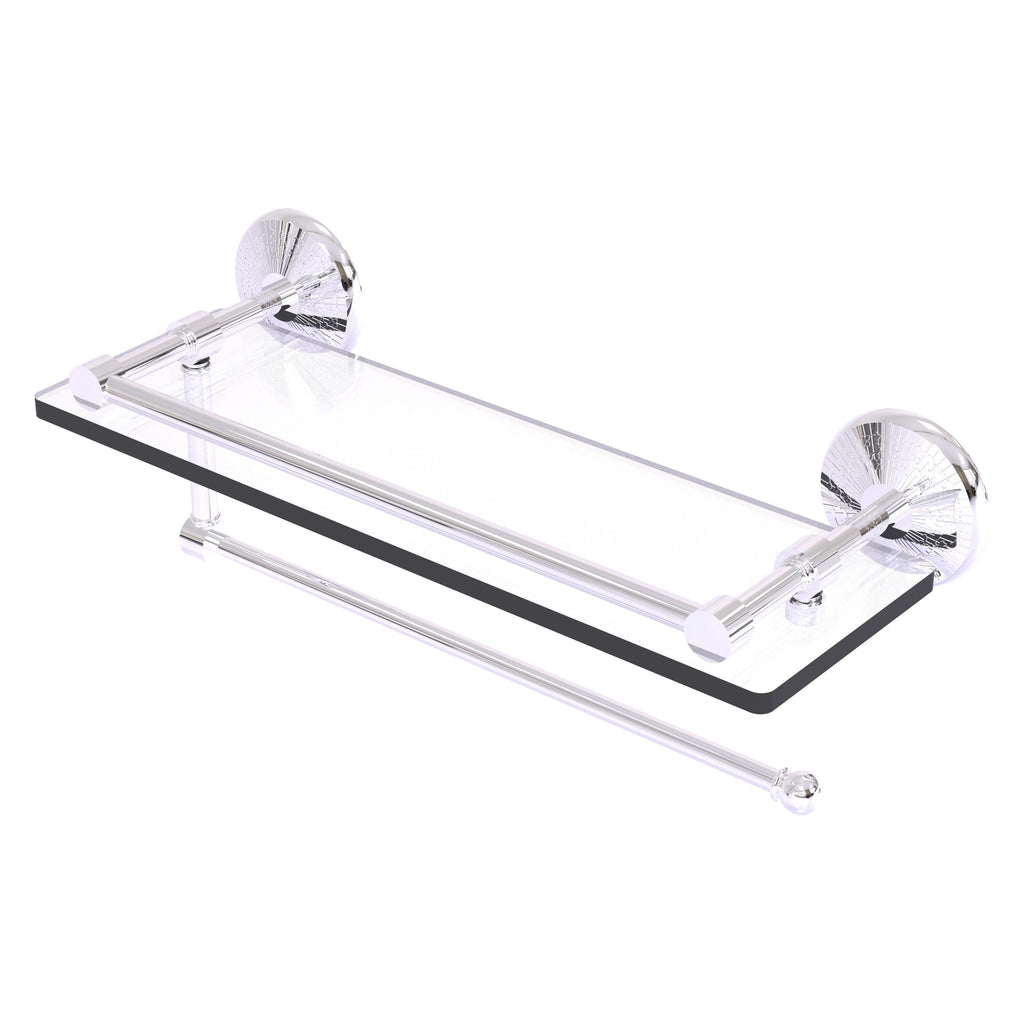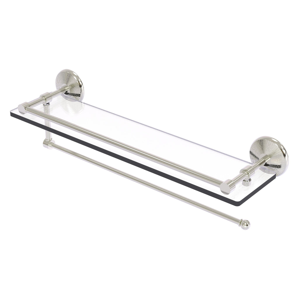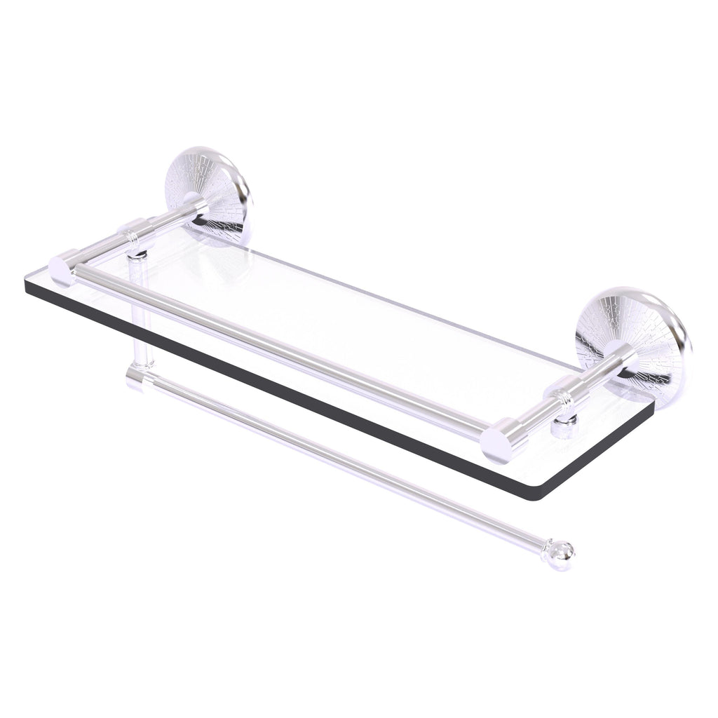 Maximize space and efficiency with this beautiful glass shelf and paper towel holder combination. Gallery rail will keep your items secure while the integrated paper towel holder provides a creative space for your roll. Made of solid brass and tempered