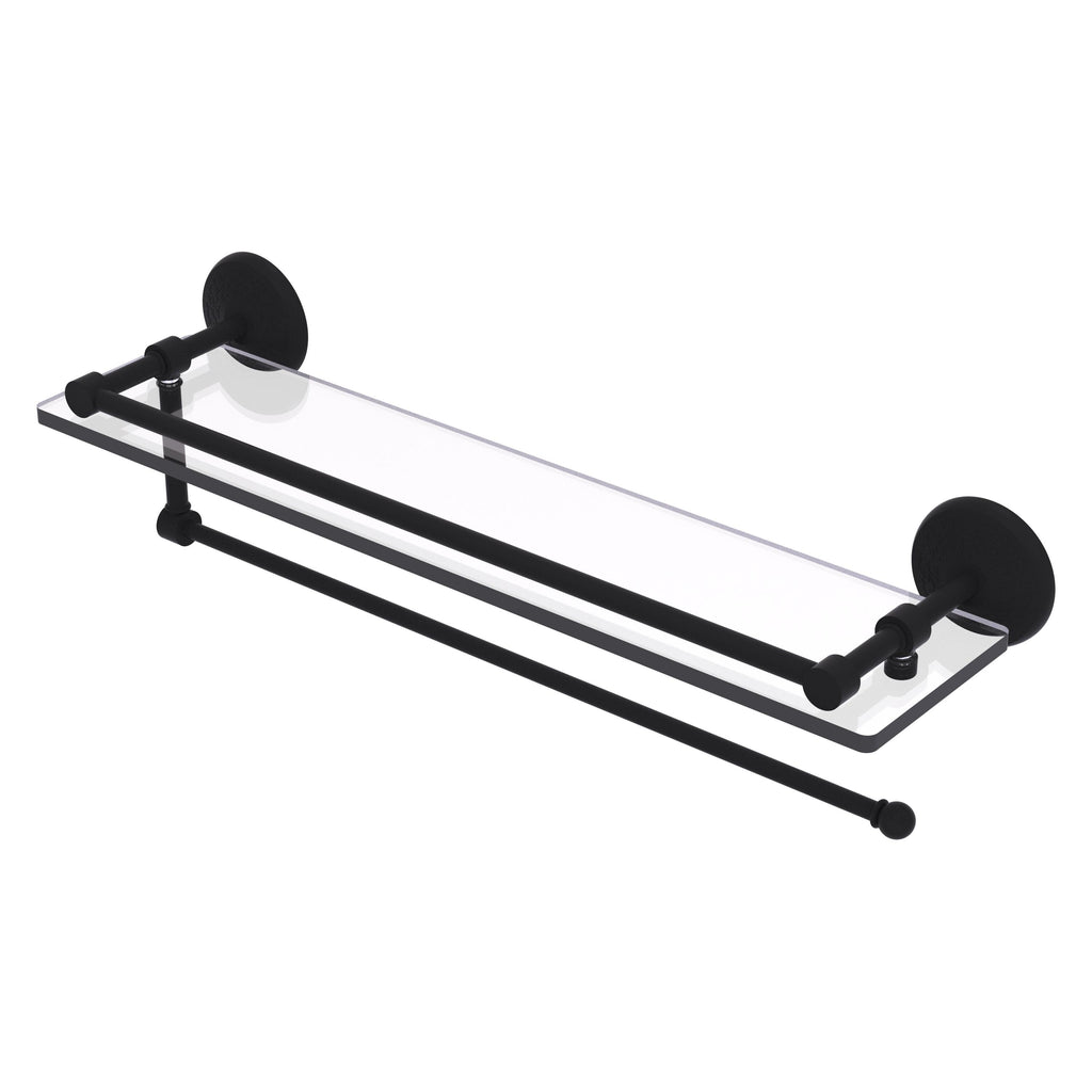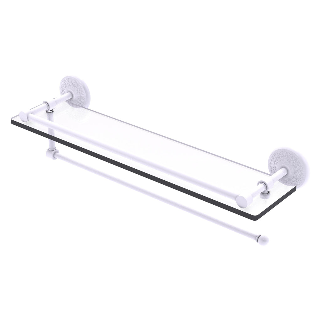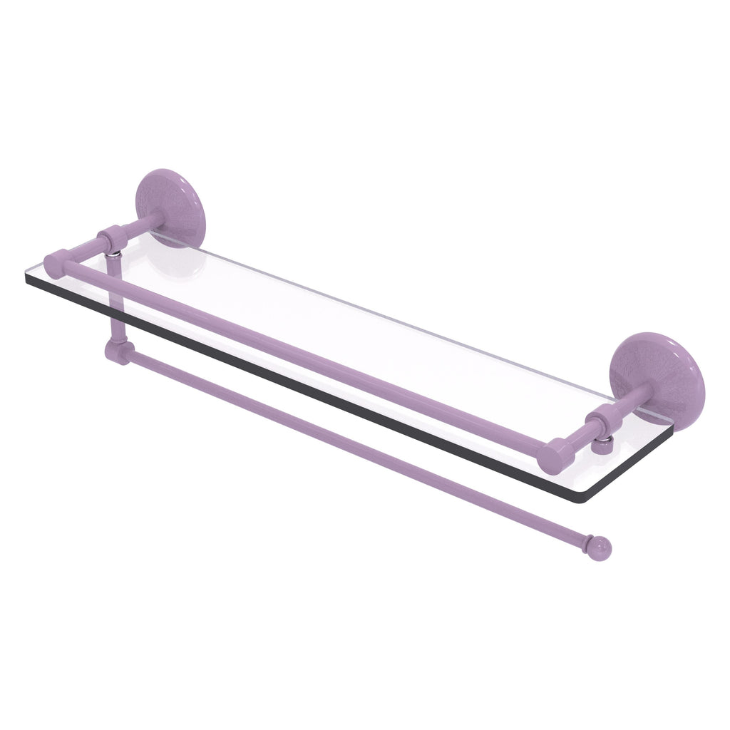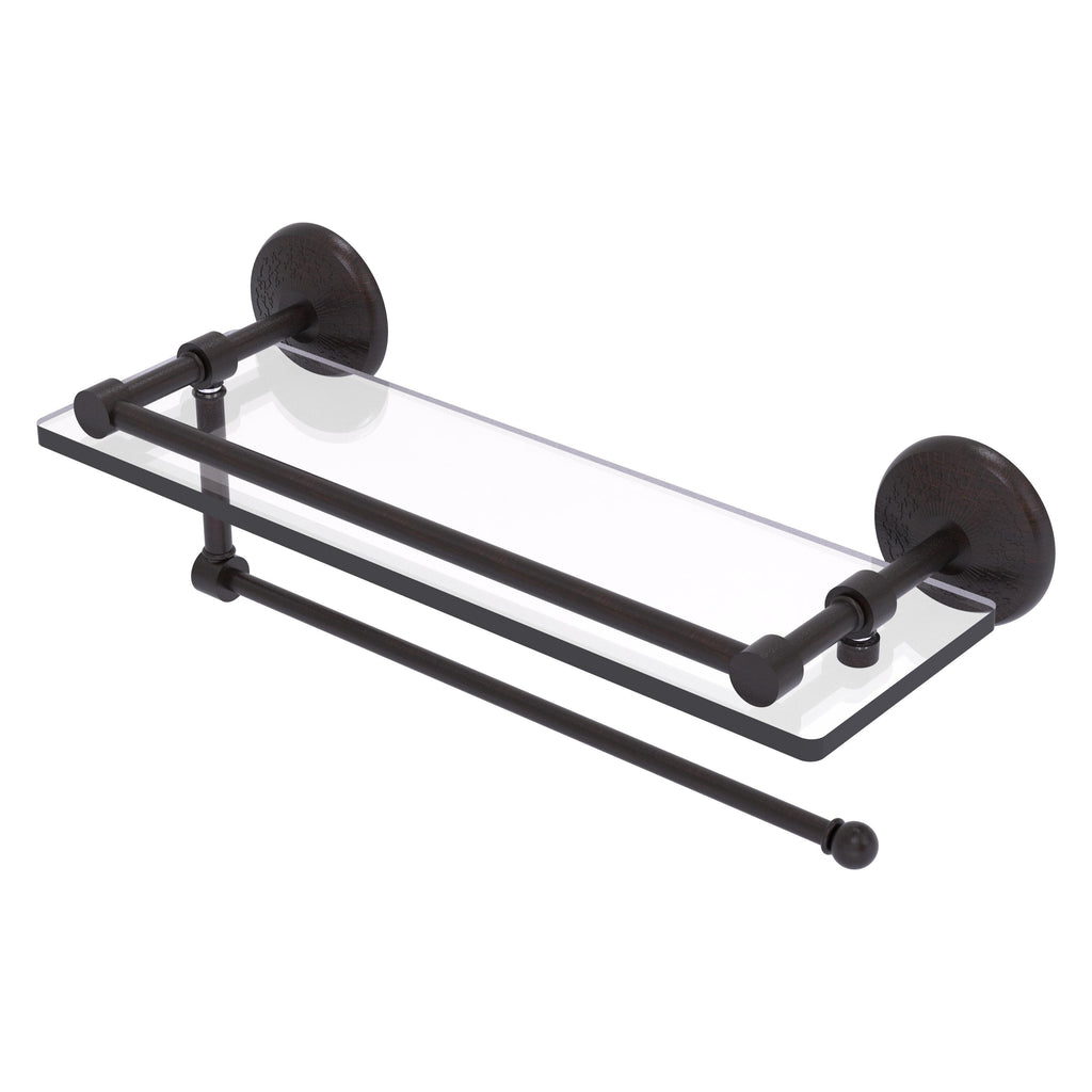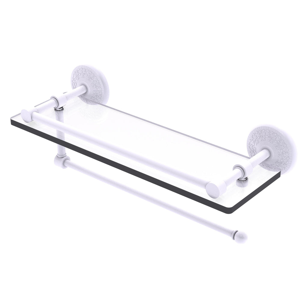Maximize space and efficiency with this beautiful glass shelf and paper towel holder combination. Gallery rail will keep your items secure while the integrated paper towel holder provides a creative space for your roll. Made of solid brass and tempered