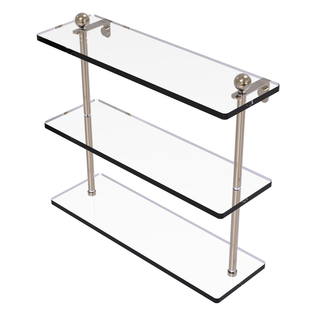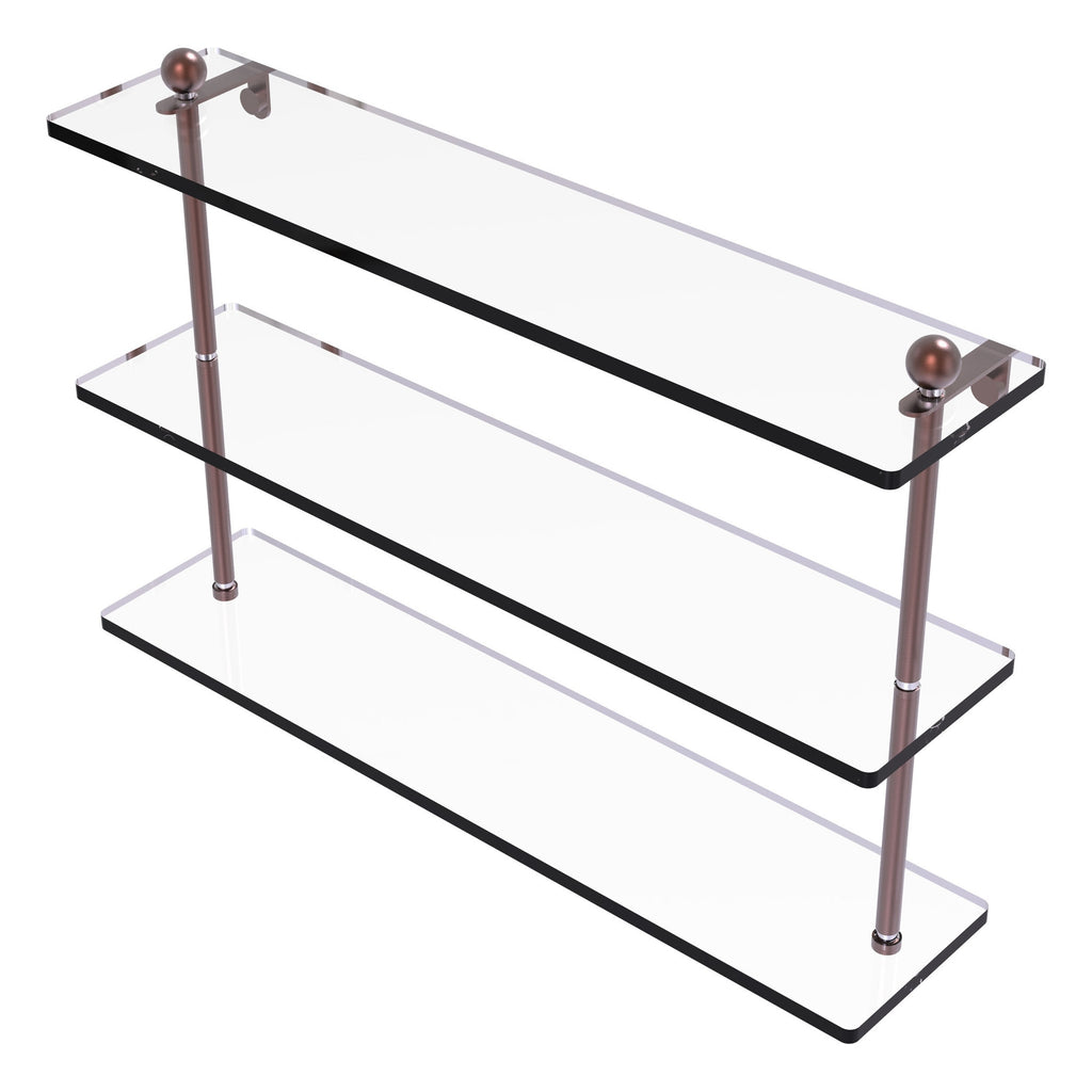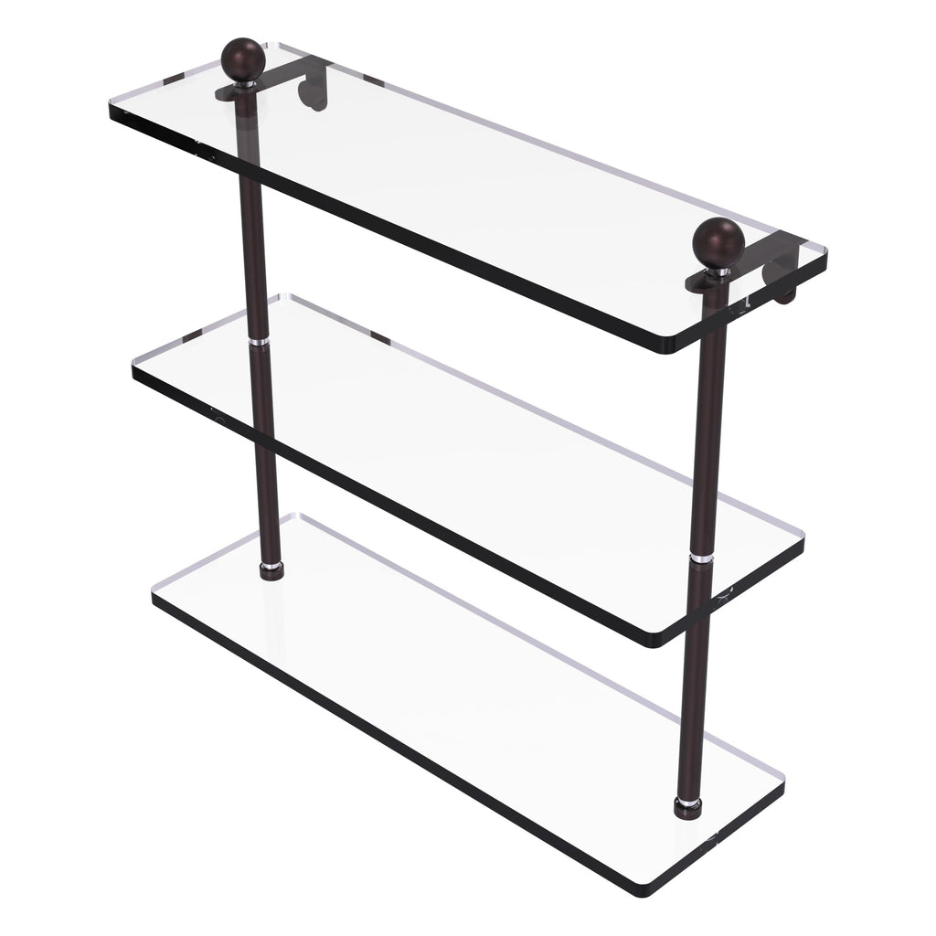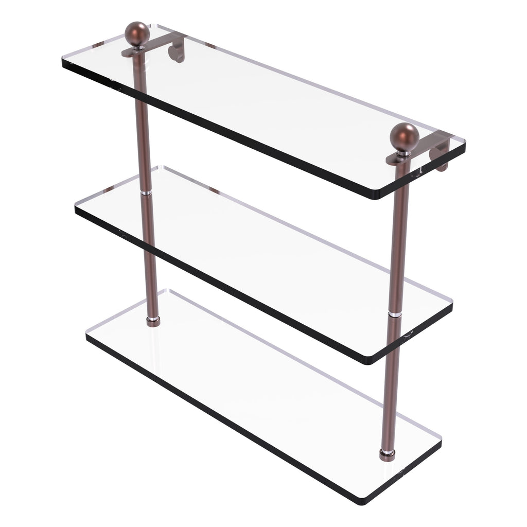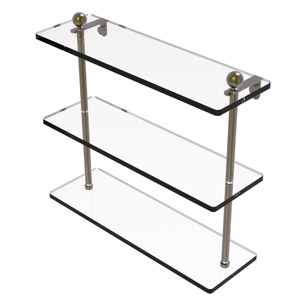 Add space and organization to your bathroom with this simple, contemporary design 3-tier glass vanity shelf. Featuring tempered, beveled-edged glass and solid brass hardware this shelving unit is crafted for durability, strength and style. One of the many coordinating accessories in the Allied Brass collection of products, this subtle glass shelf unit is the perfect complement to your bathroom decor.