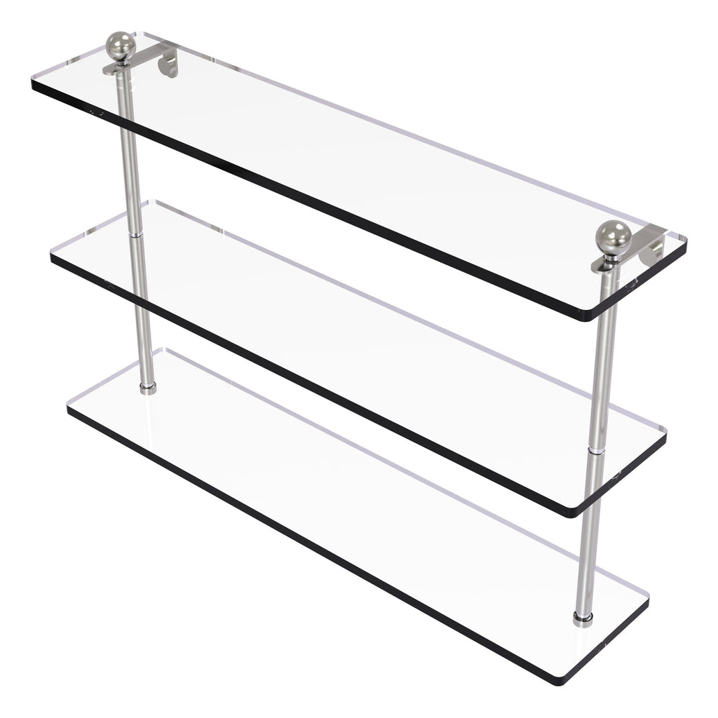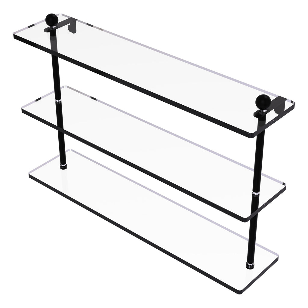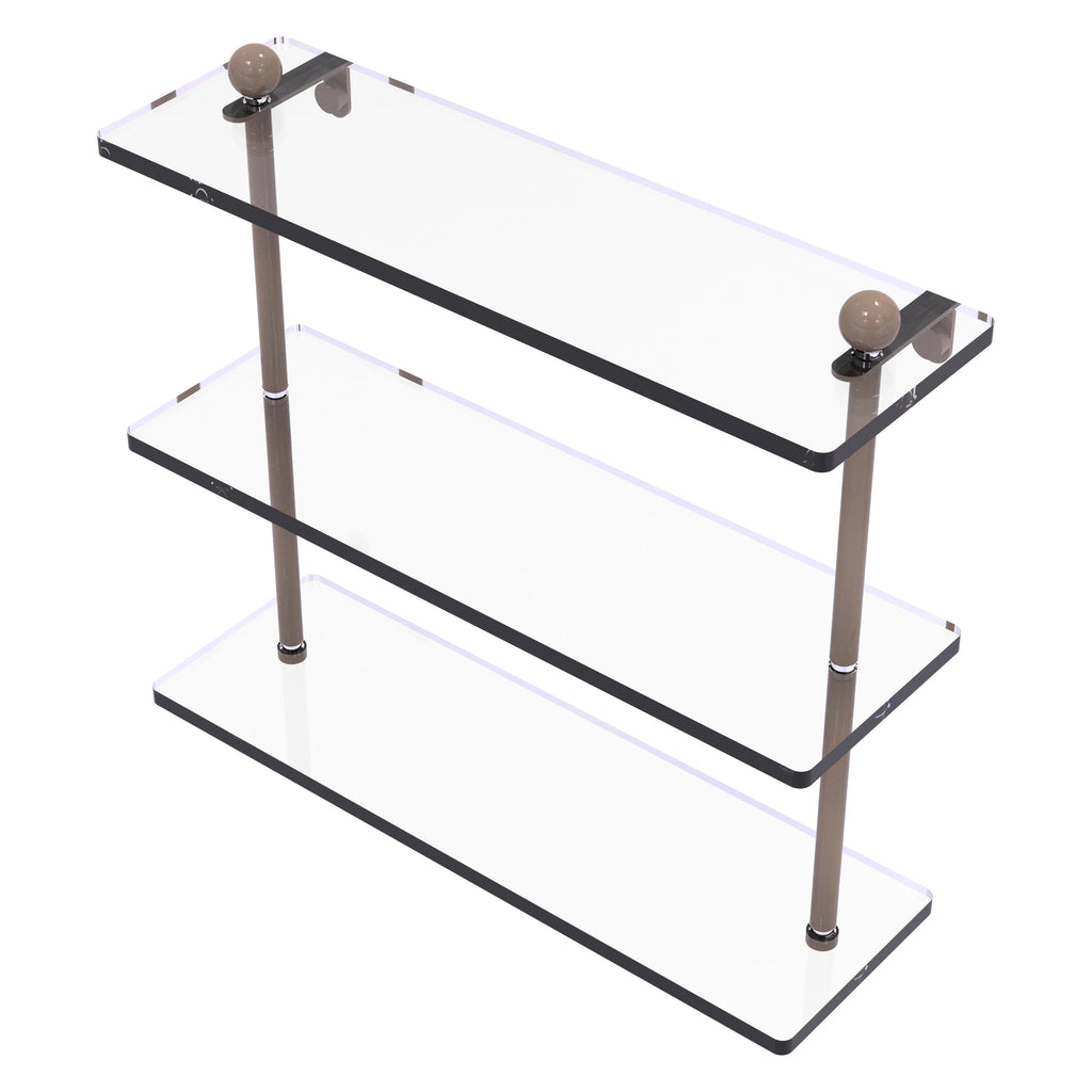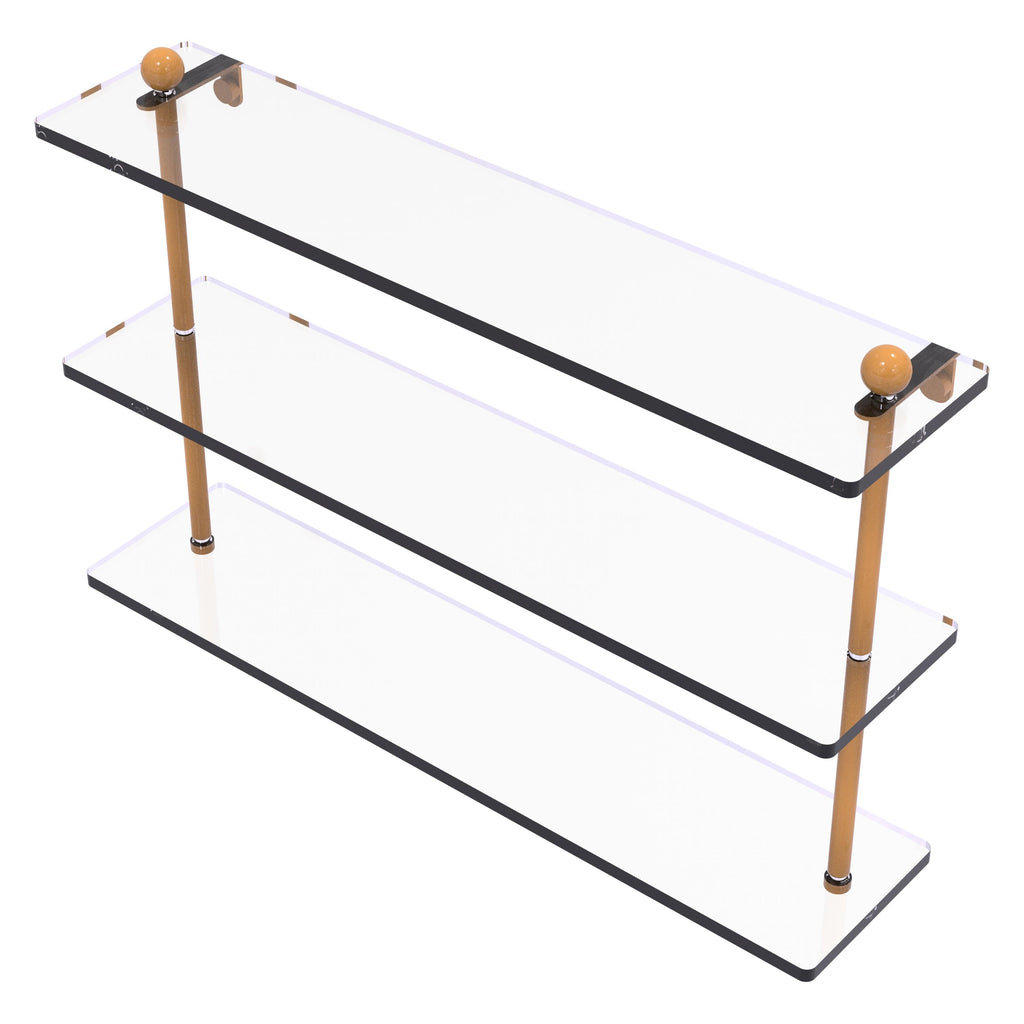 Add space and organization to your bathroom with this simple, contemporary design 3-tier glass vanity shelf. Featuring tempered, beveled-edged glass and solid brass hardware this shelving unit is crafted for durability, strength and style. One of the many coordinating accessories in the Allied Brass collection of products, this subtle glass shelf unit is the perfect complement to your bathroom decor.