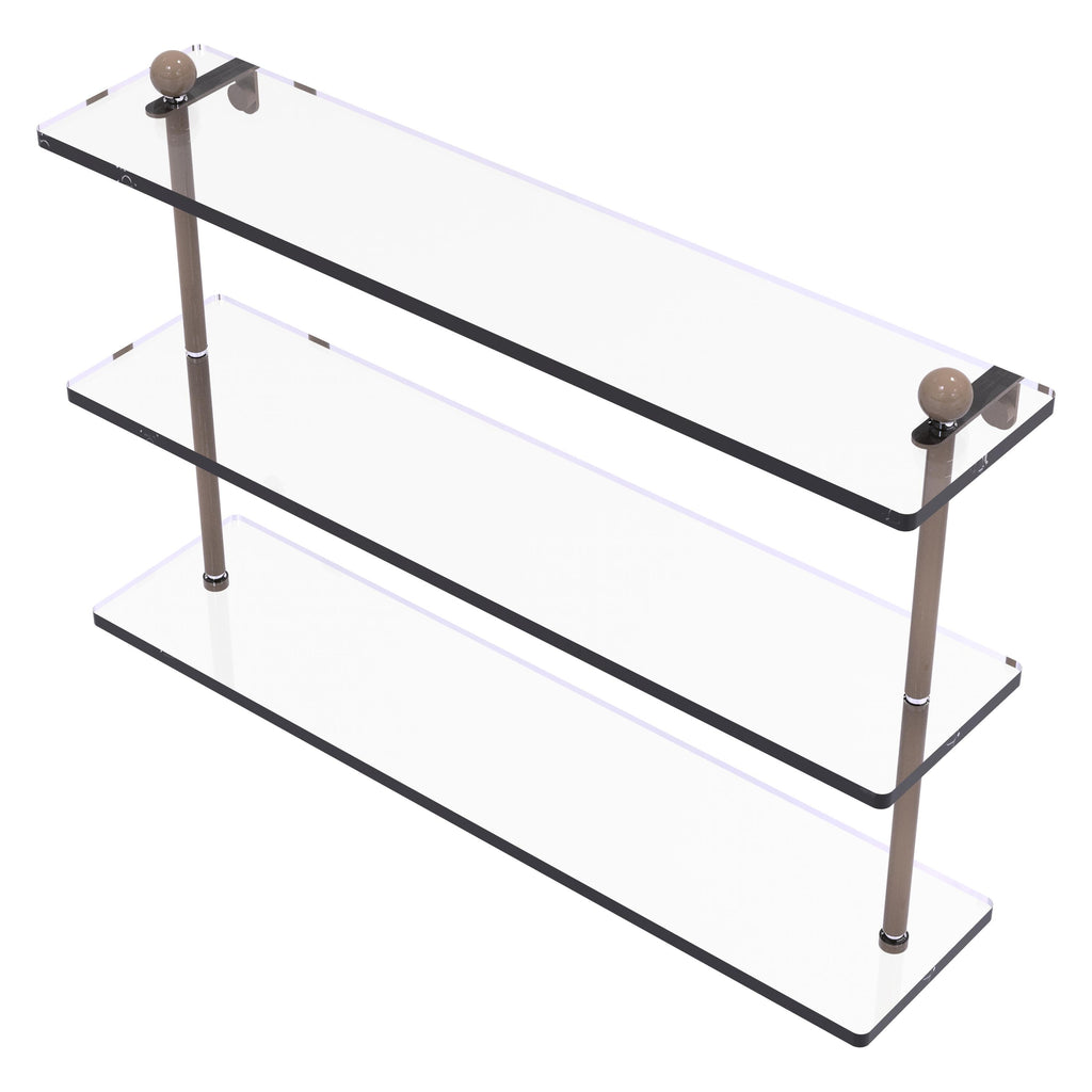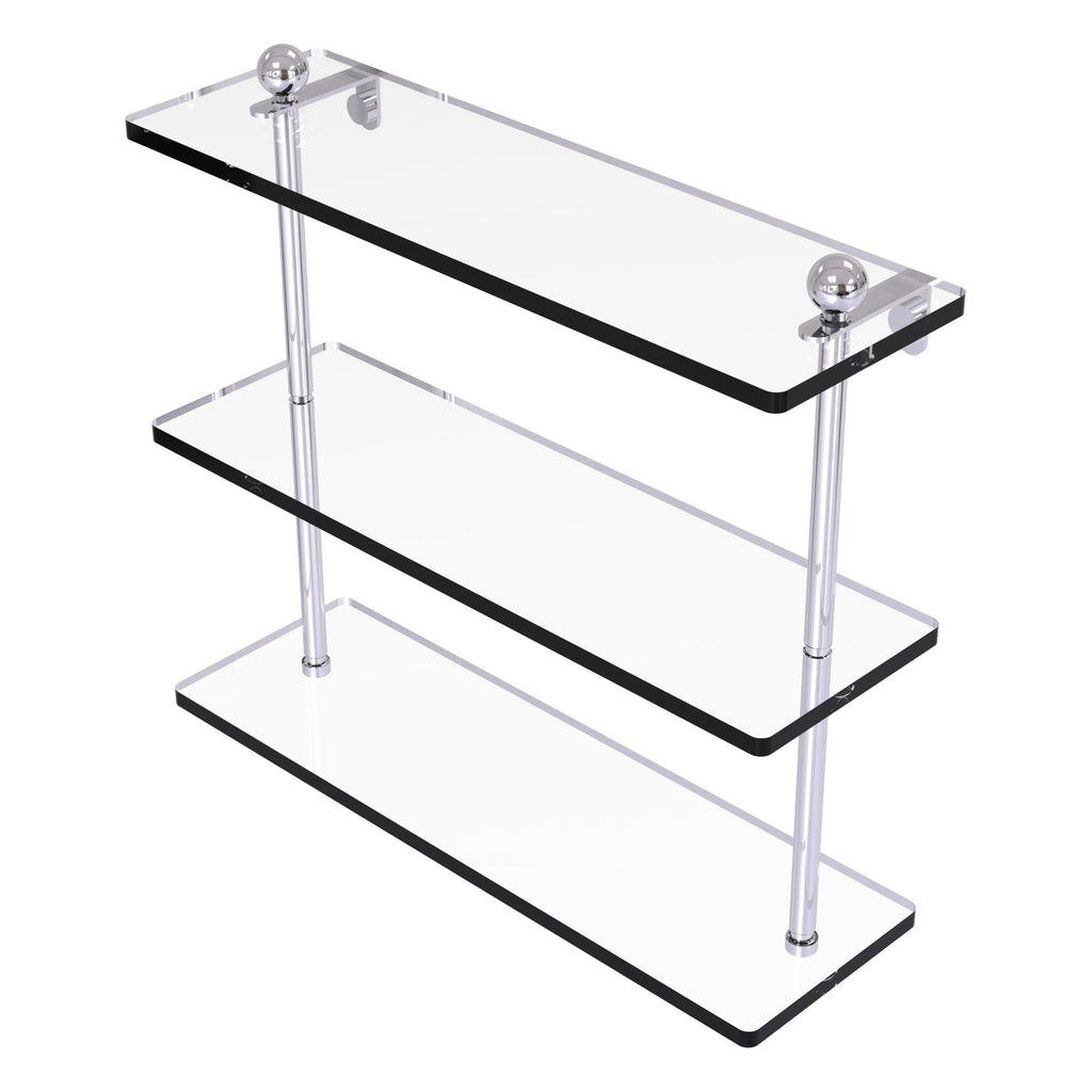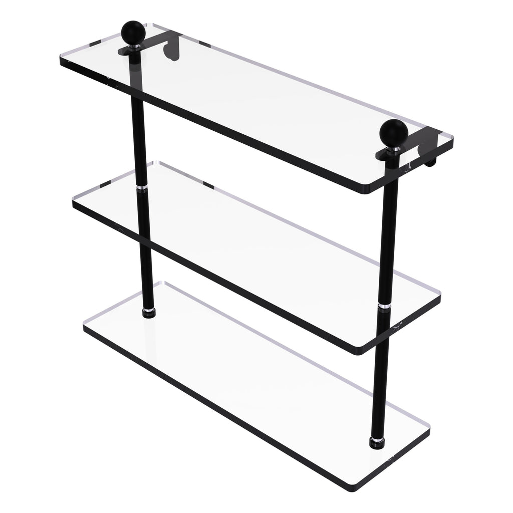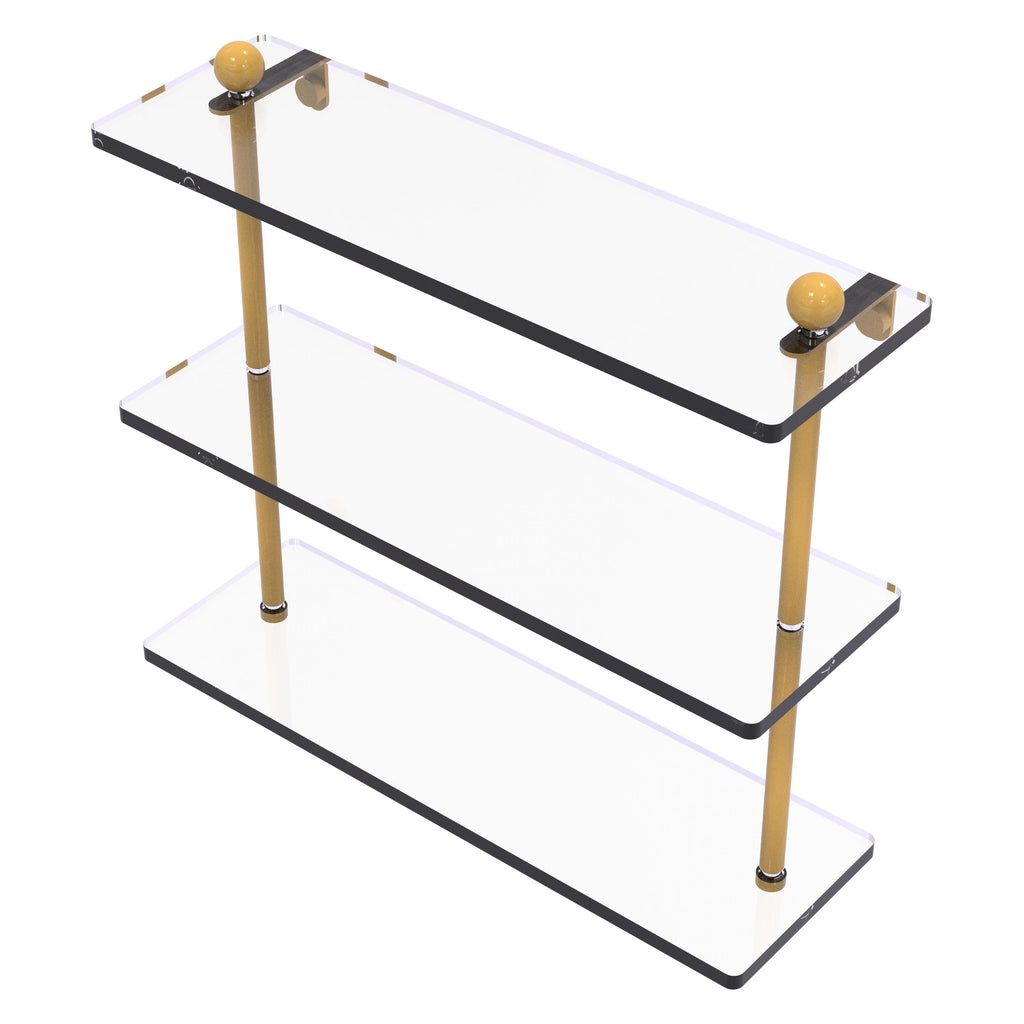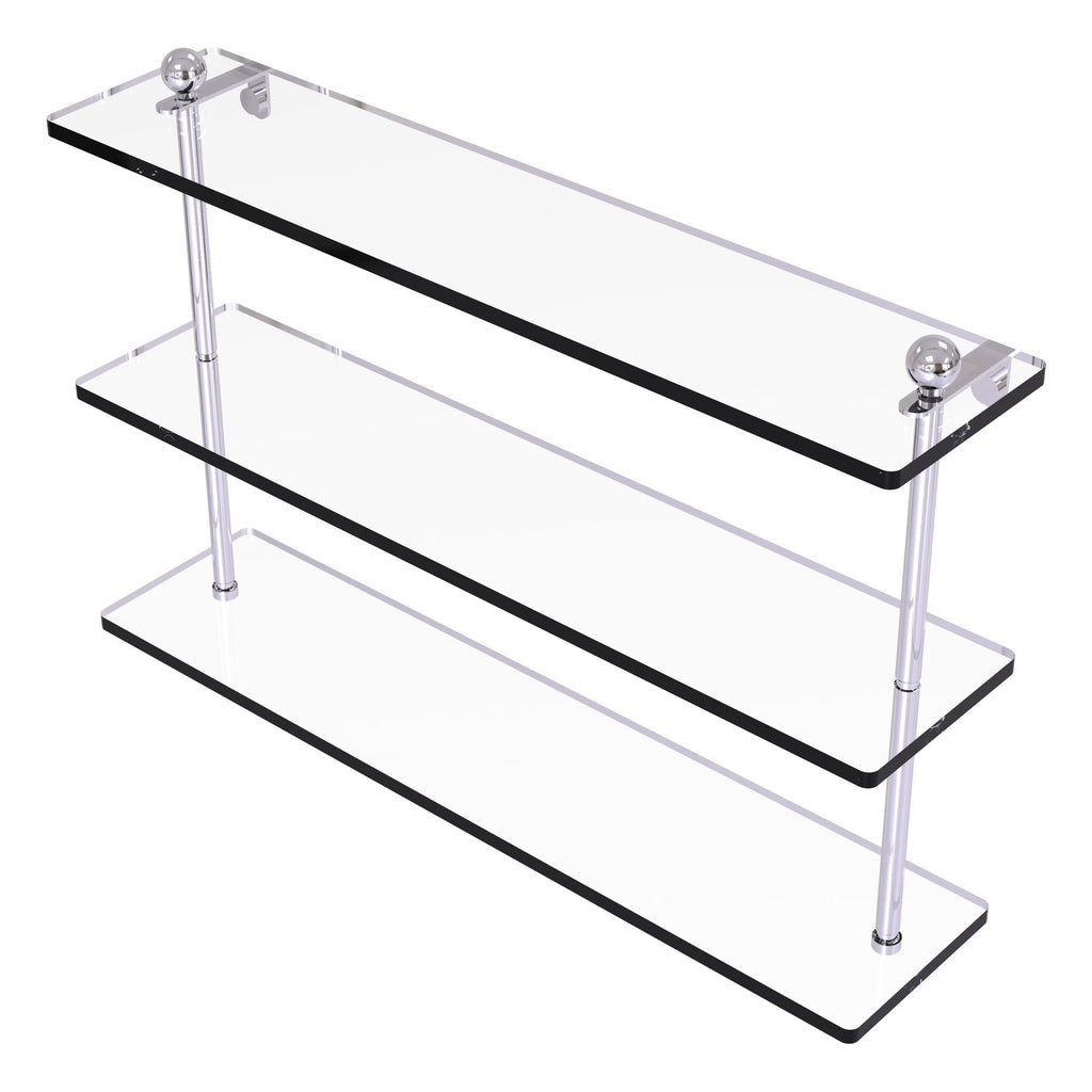 Add space and organization to your bathroom with this simple, contemporary design 3-tier glass vanity shelf. Featuring tempered, beveled-edged glass and solid brass hardware this shelving unit is crafted for durability, strength and style. One of the many coordinating accessories in the Allied Brass collection of products, this subtle glass shelf unit is the perfect complement to your bathroom decor.