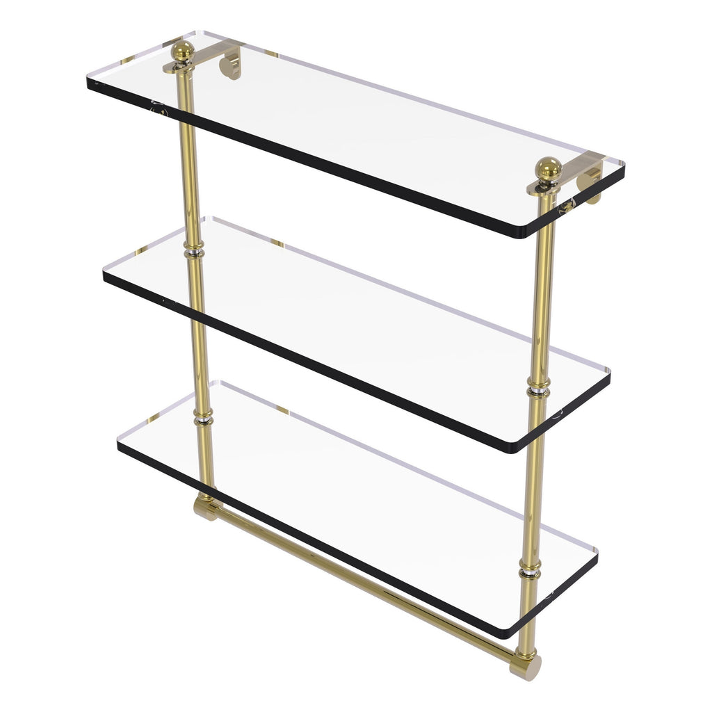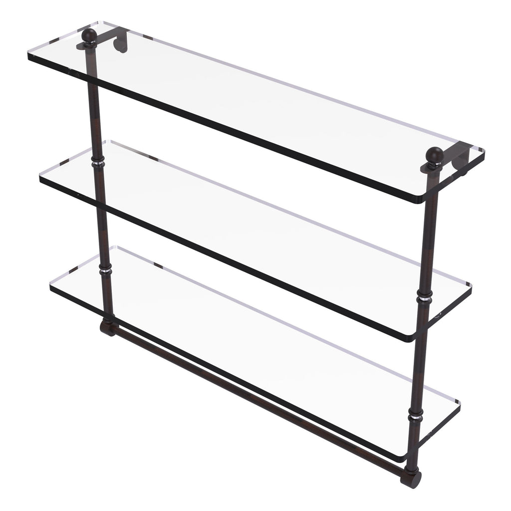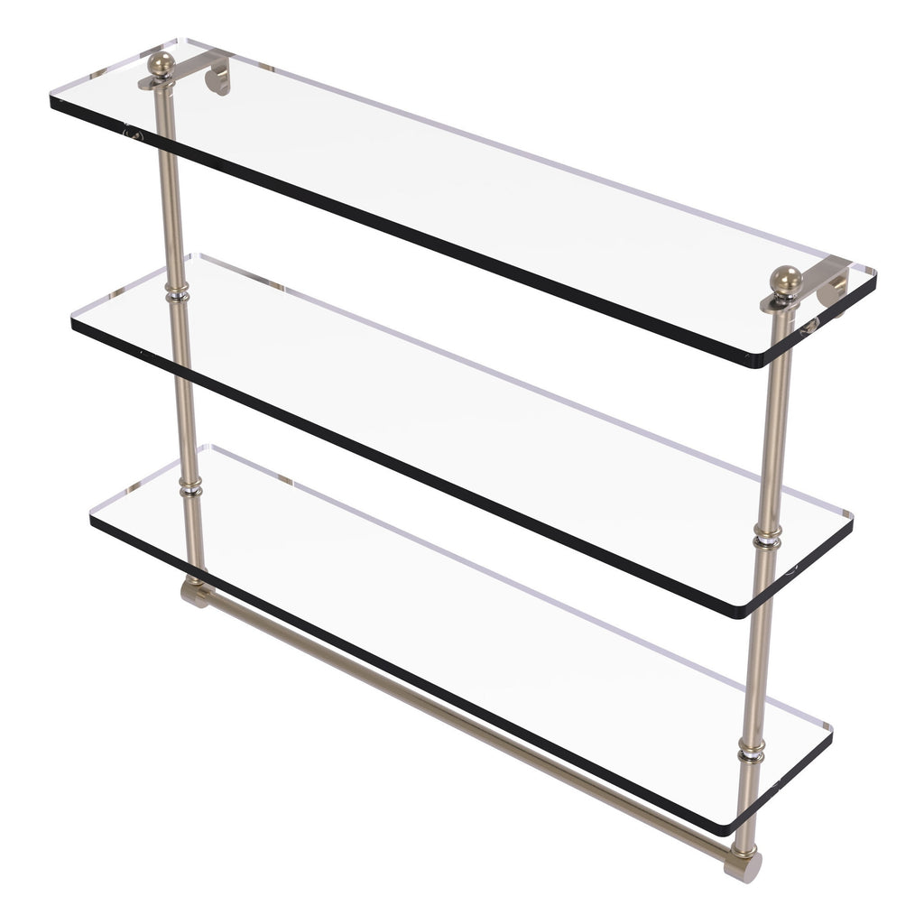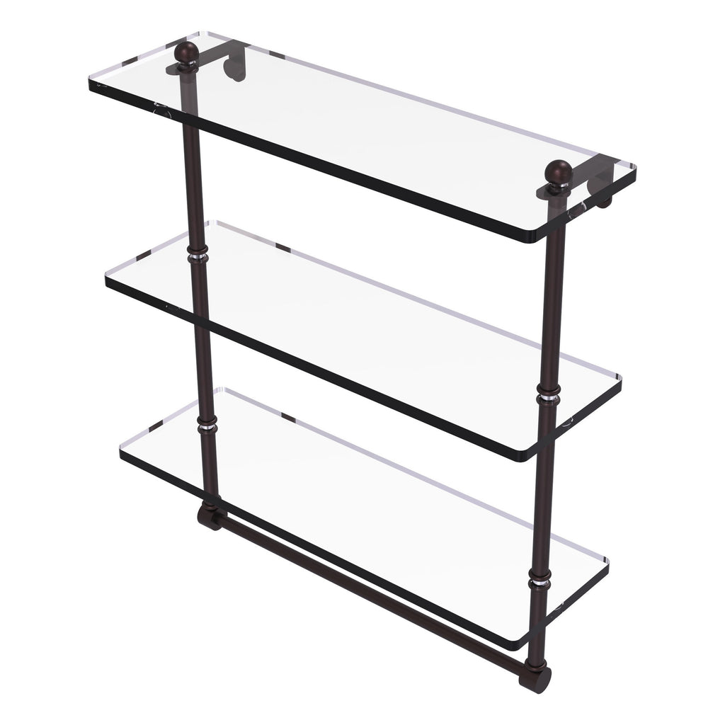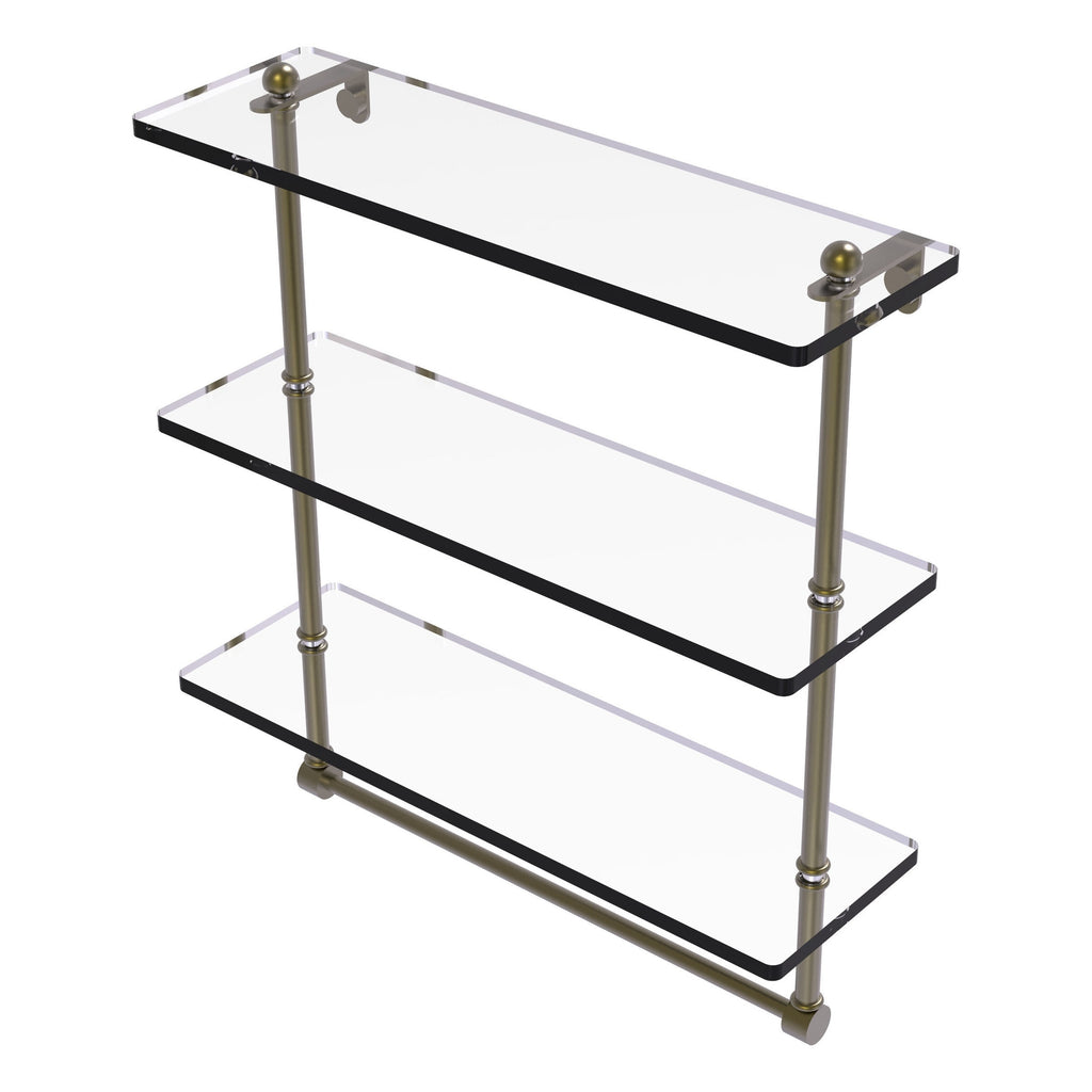 Add space and organization to your bathroom with this simple, contemporary style glass shelf. Featuring tempered, beveled-edged glass and solid brass hardware this shelf is crafted for durability, strength and style. Integrated towel bar provides space for your favorite decorative towels or for your everyday use. One of the many coordinating accessories in the Allied Brass Collection of products, this subtle glass shelf is the perfect complement to your bathroom decor.