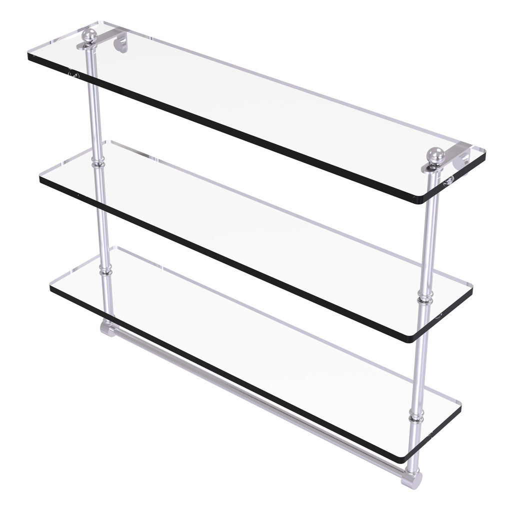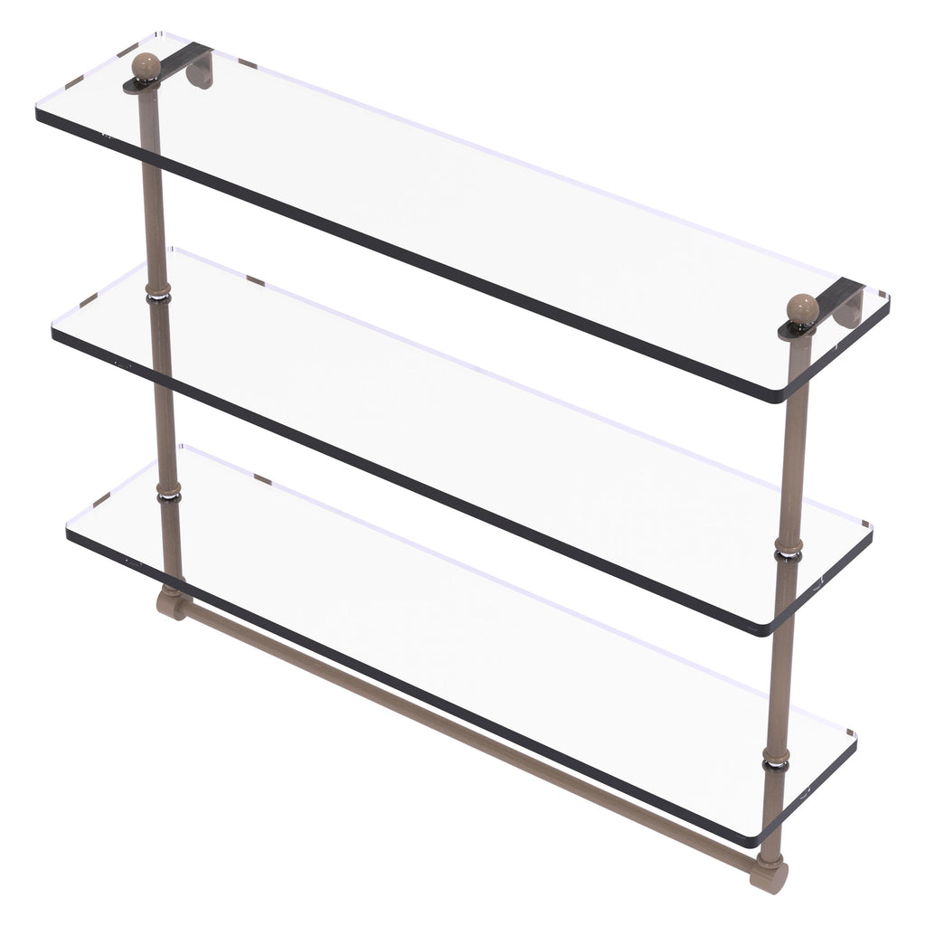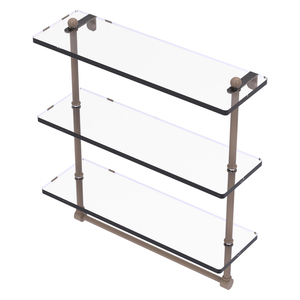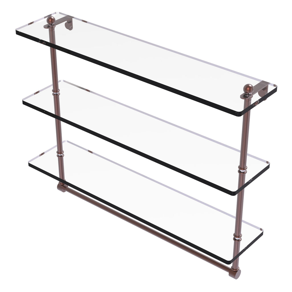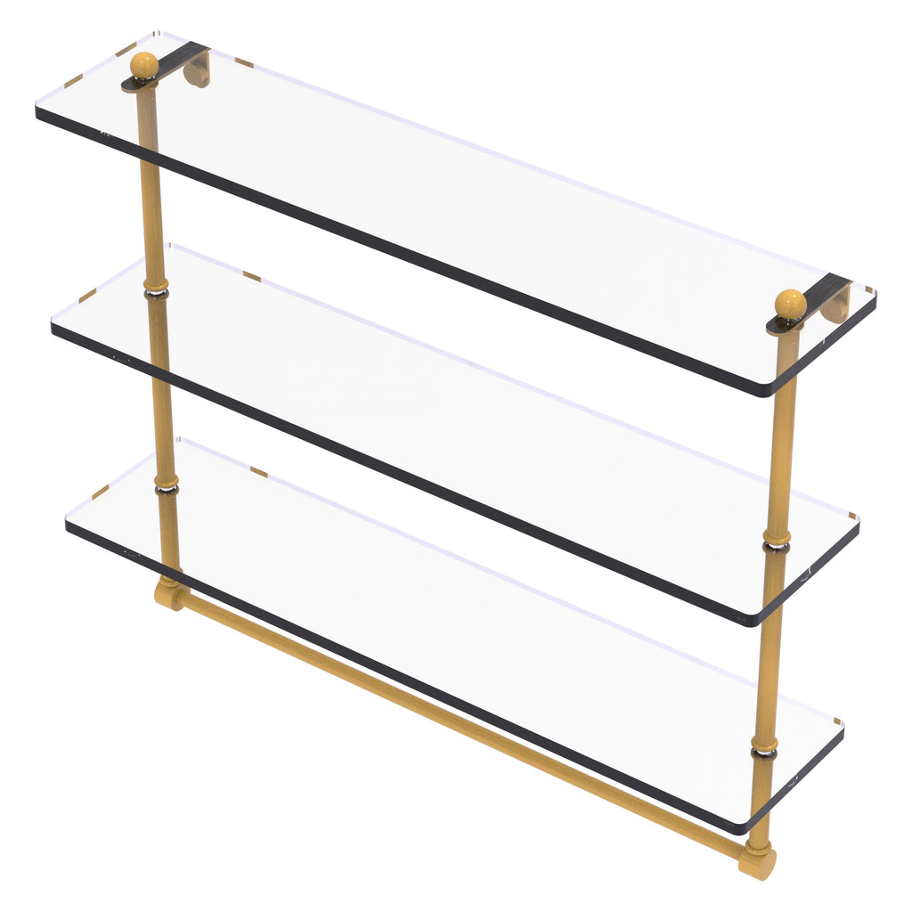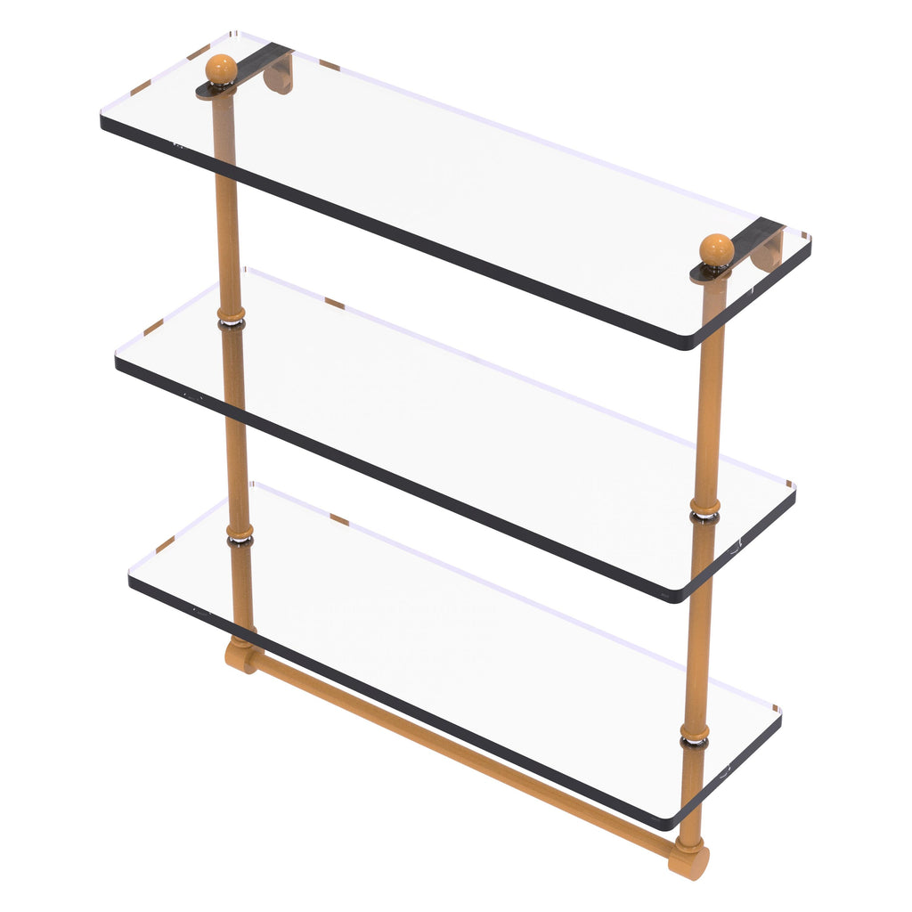 Add space and organization to your bathroom with this simple, contemporary style glass shelf. Featuring tempered, beveled-edged glass and solid brass hardware this shelf is crafted for durability, strength and style. Integrated towel bar provides space for your favorite decorative towels or for your everyday use. One of the many coordinating accessories in the Allied Brass Collection of products, this subtle glass shelf is the perfect complement to your bathroom decor.