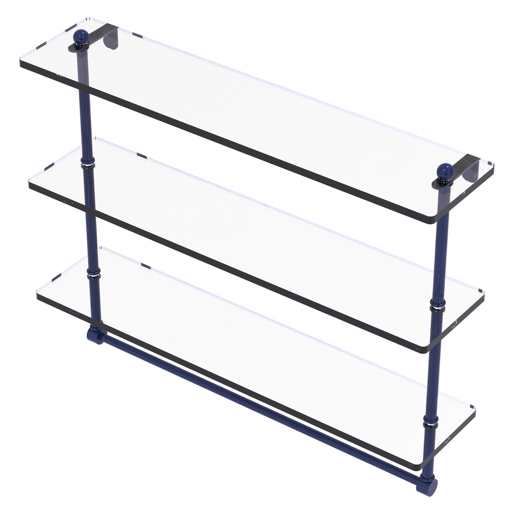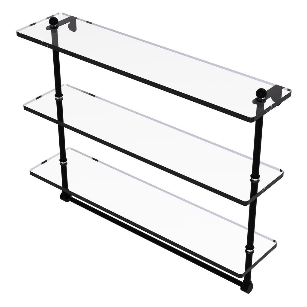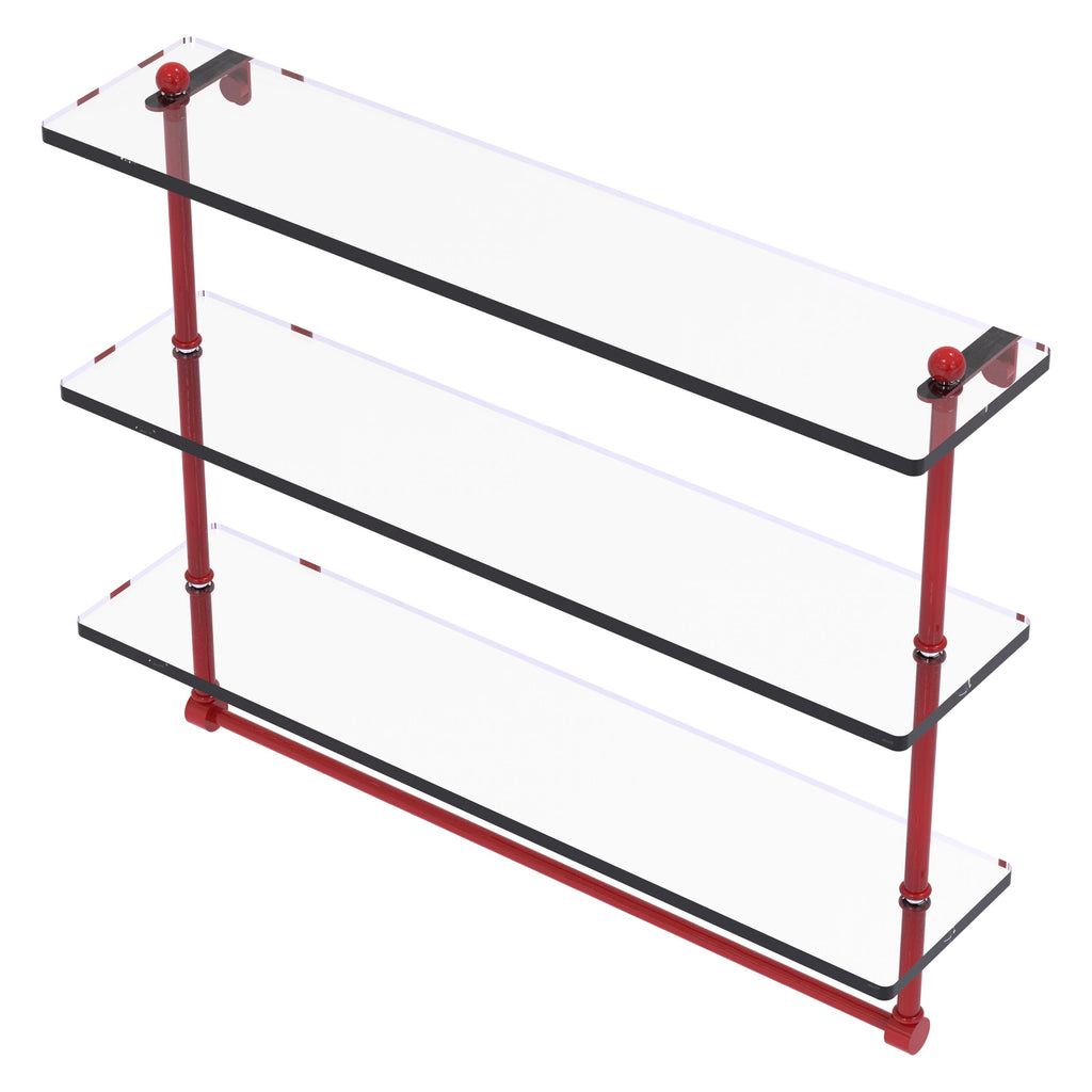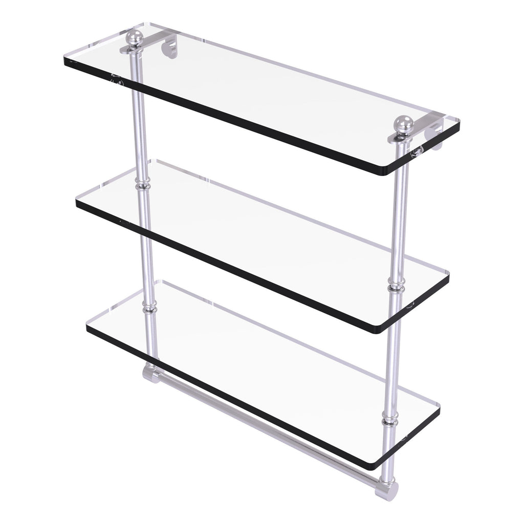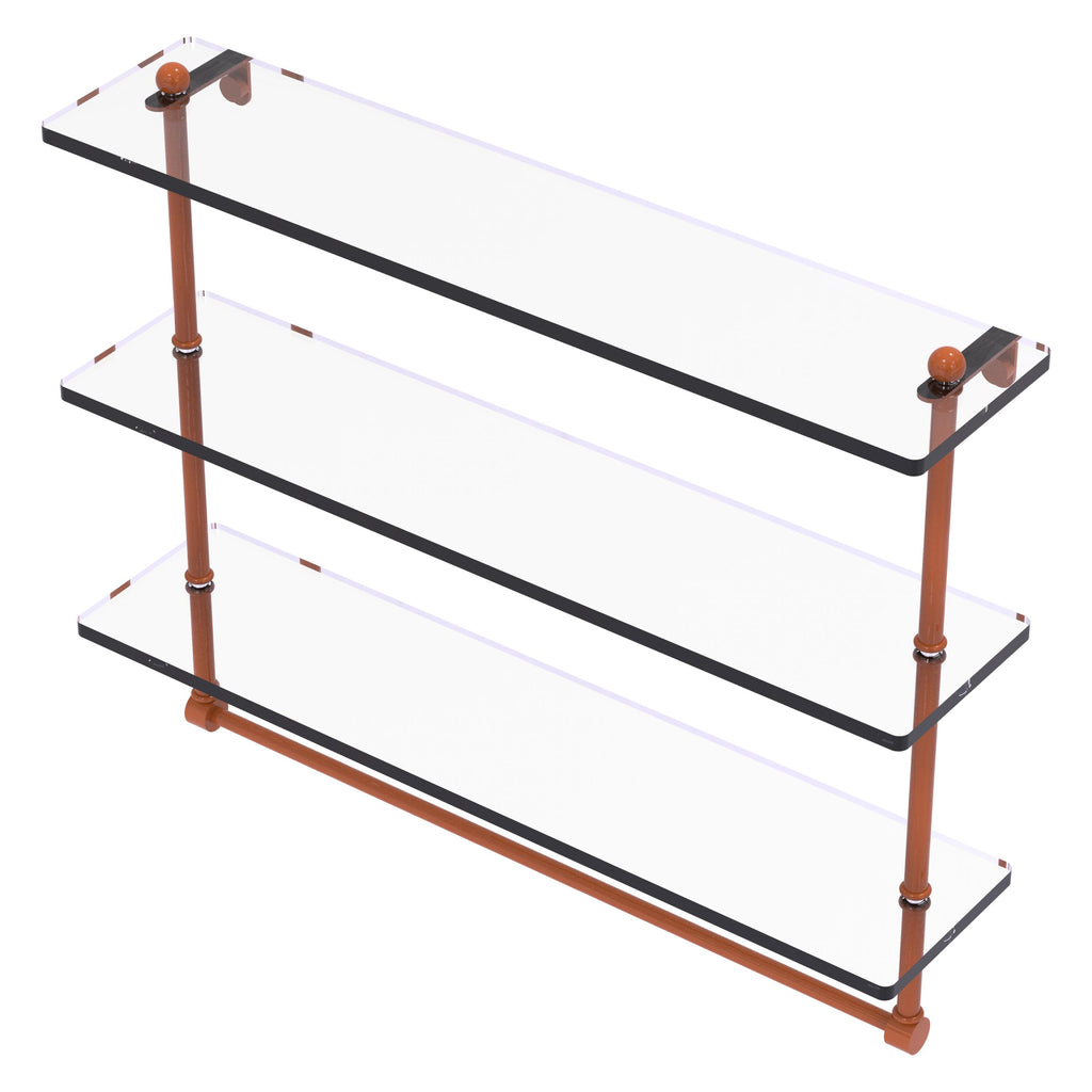 Add space and organization to your bathroom with this simple, contemporary style glass shelf. Featuring tempered, beveled-edged glass and solid brass hardware this shelf is crafted for durability, strength and style. Integrated towel bar provides space for your favorite decorative towels or for your everyday use. One of the many coordinating accessories in the Allied Brass Collection of products, this subtle glass shelf is the perfect complement to your bathroom decor.