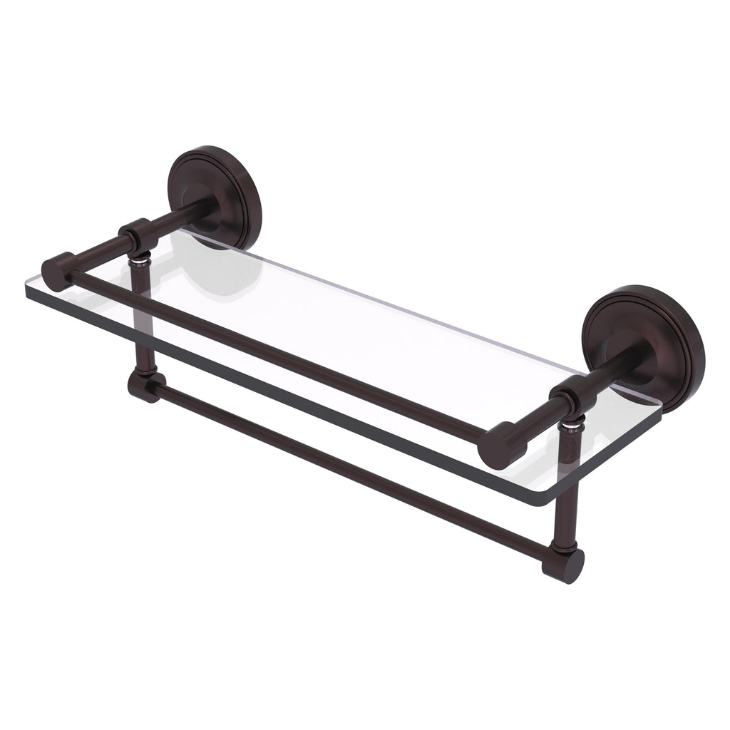 Add a flare of style to your décor with this decorative glass shelf. Shelf can be used anywhere in the home for a great space to store your products. Gallery rail will keep your items secure while the integrated towel bar provides a creative space for your towels. Tempered glass is 3/8 Inches thick and all of the hardware is made of solid brass and finished with the highest quality materials to provide a lifetime of beauty.