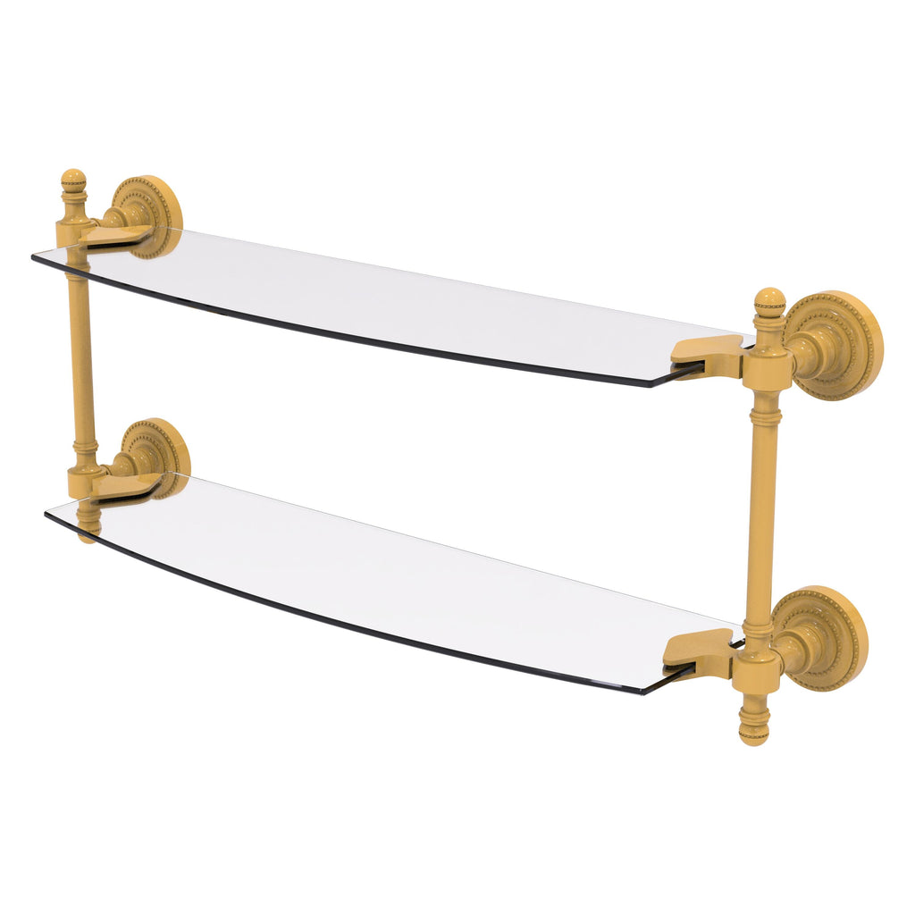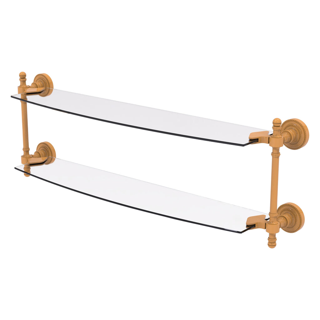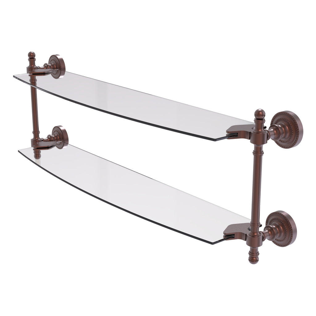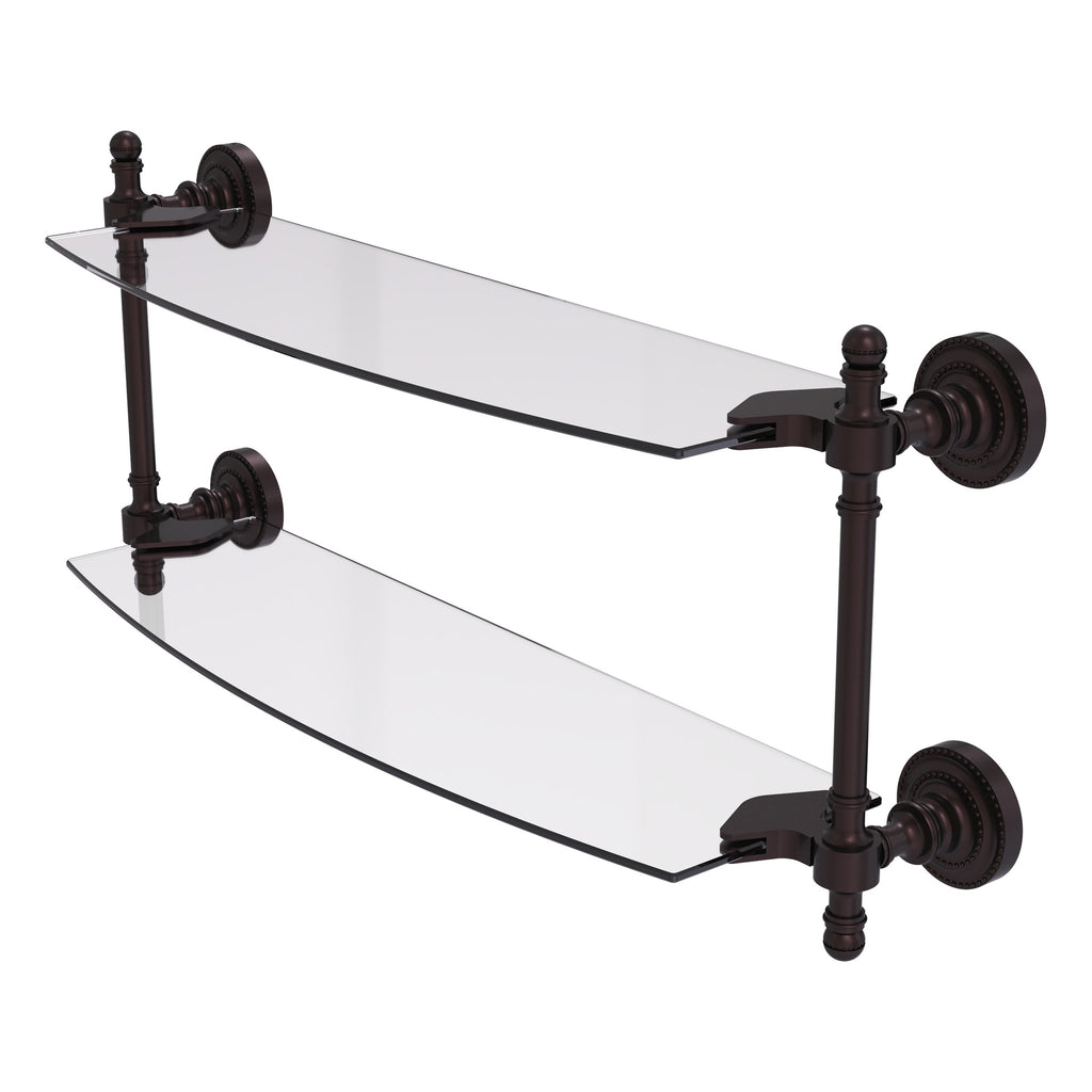 Add space and organization to your bathroom with this simple, contemporary style glass shelf. Featuring tempered, beveled-edged glass and solid brass hardware this shelf is crafted for durability, strength and style. One of the many coordinating accessories in the Allied Brass Collection of products, this subtle glass shelf is the perfect complement to your bathroom decor.