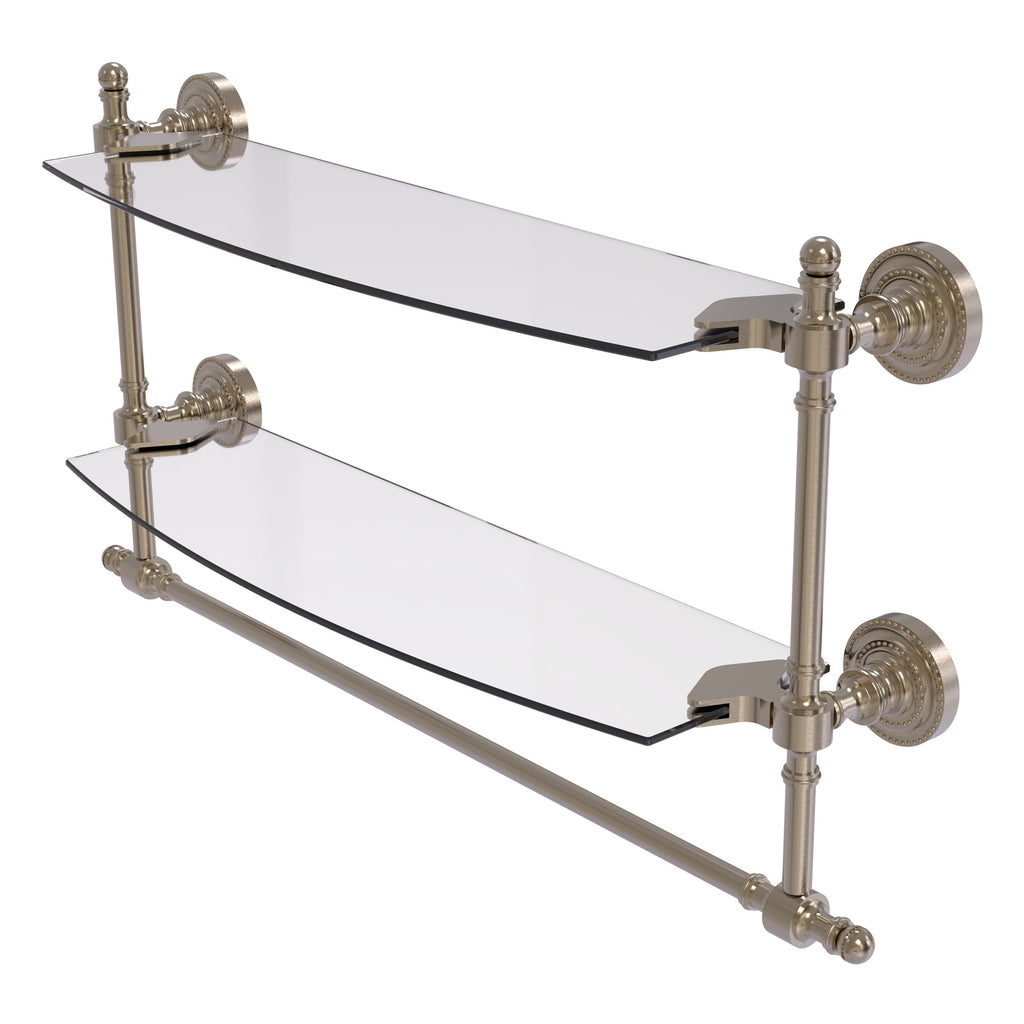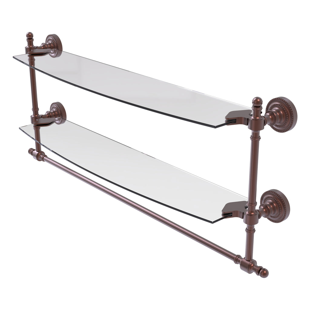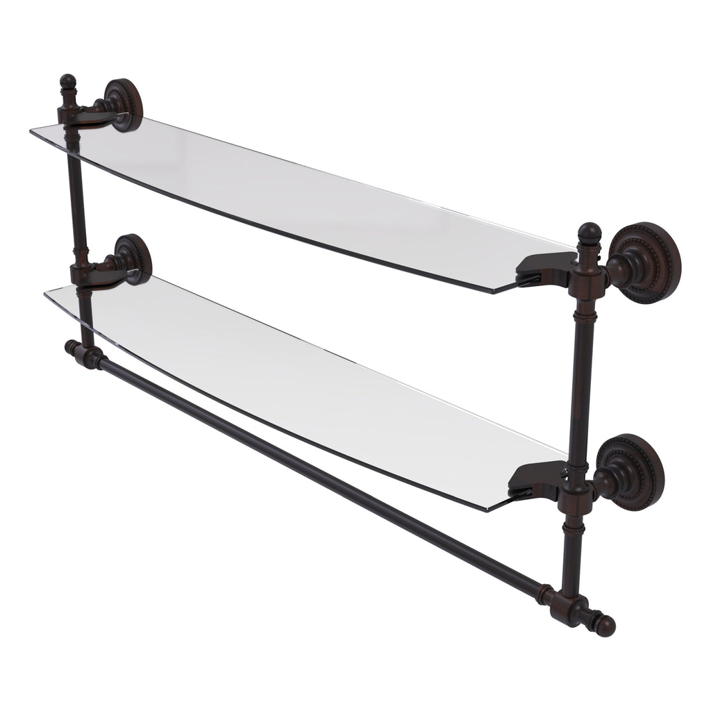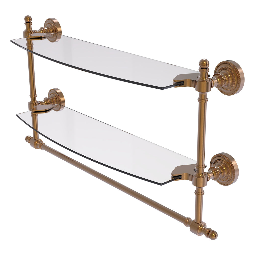Add space and organization to your bathroom with this simple, contemporary style glass shelf. Featuring tempered, beveled-edged glass and solid brass hardware this shelf is crafted for durability, strength and style. Integrated towel bar provides space for your favorite decorative towels or for your everyday use. One of the many coordinating accessories in the Allied Brass Collection of products, this subtle glass shelf is the perfect complement to your bathroom decor.