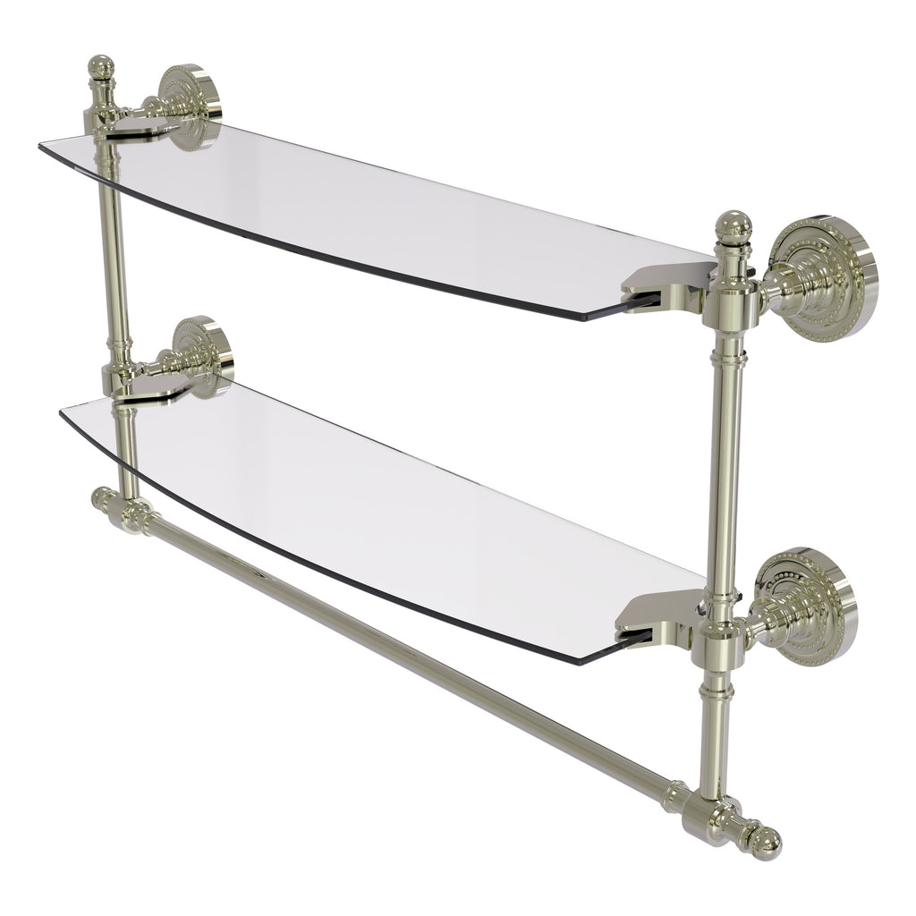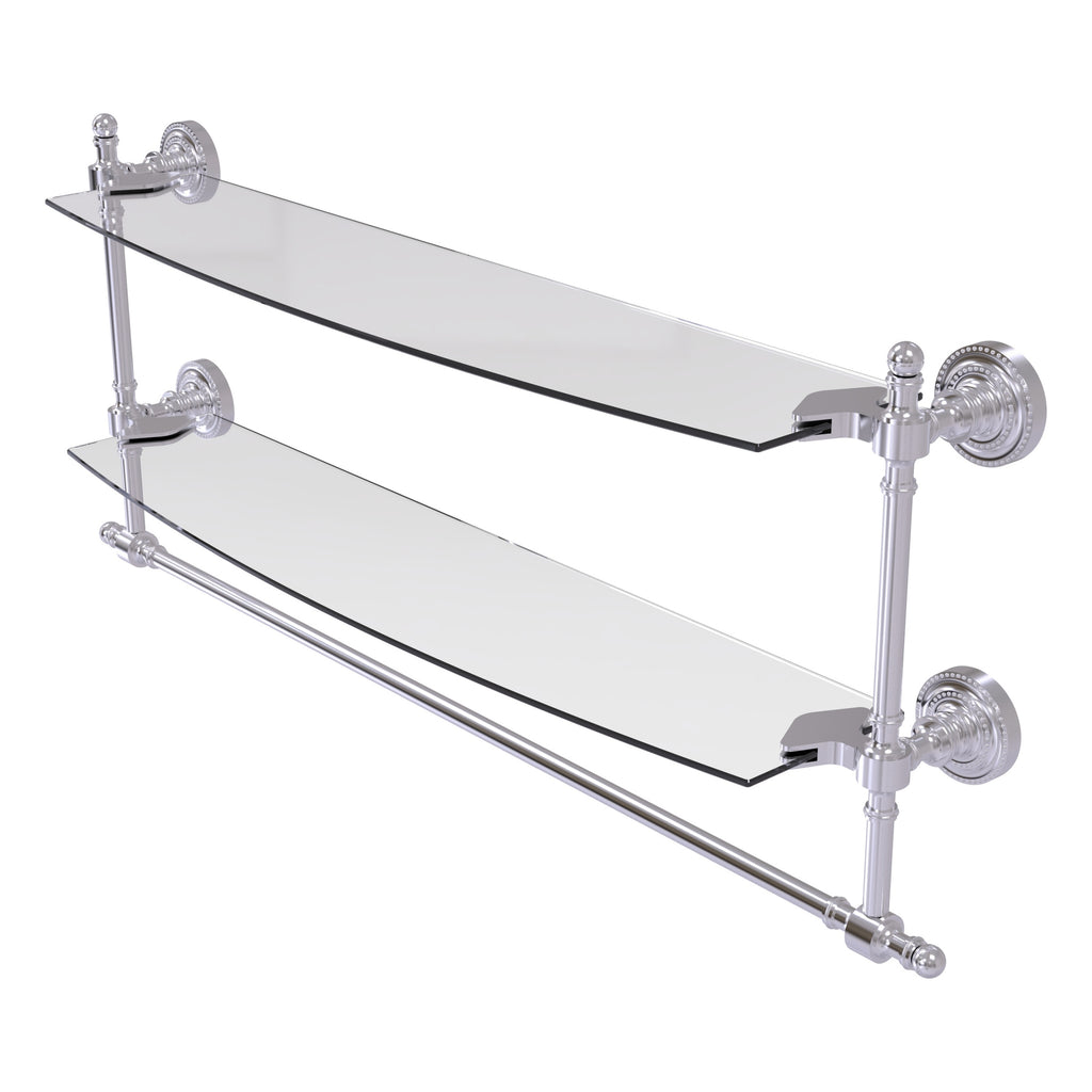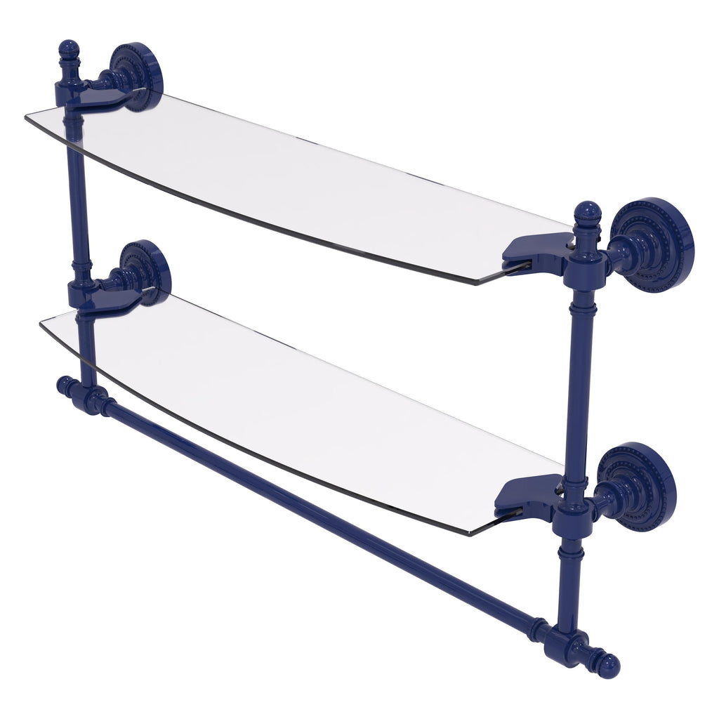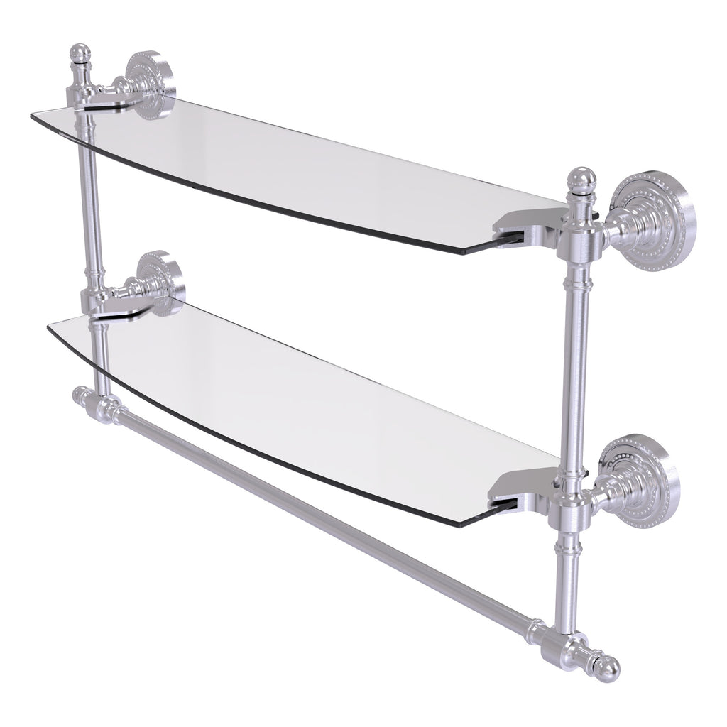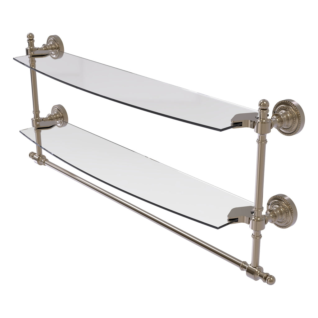 Add space and organization to your bathroom with this simple, contemporary style glass shelf. Featuring tempered, beveled-edged glass and solid brass hardware this shelf is crafted for durability, strength and style. Integrated towel bar provides space for your favorite decorative towels or for your everyday use. One of the many coordinating accessories in the Allied Brass Collection of products, this subtle glass shelf is the perfect complement to your bathroom decor.