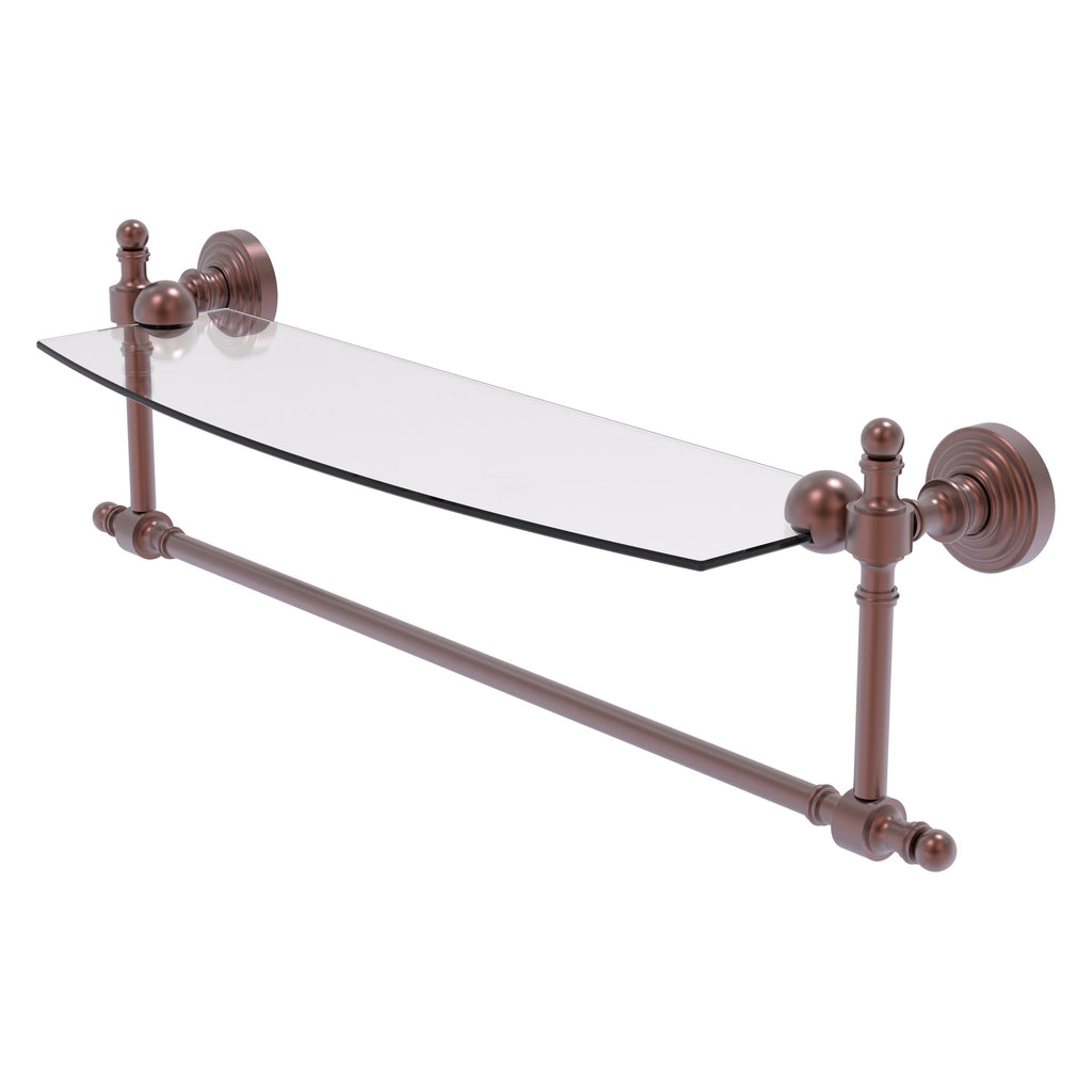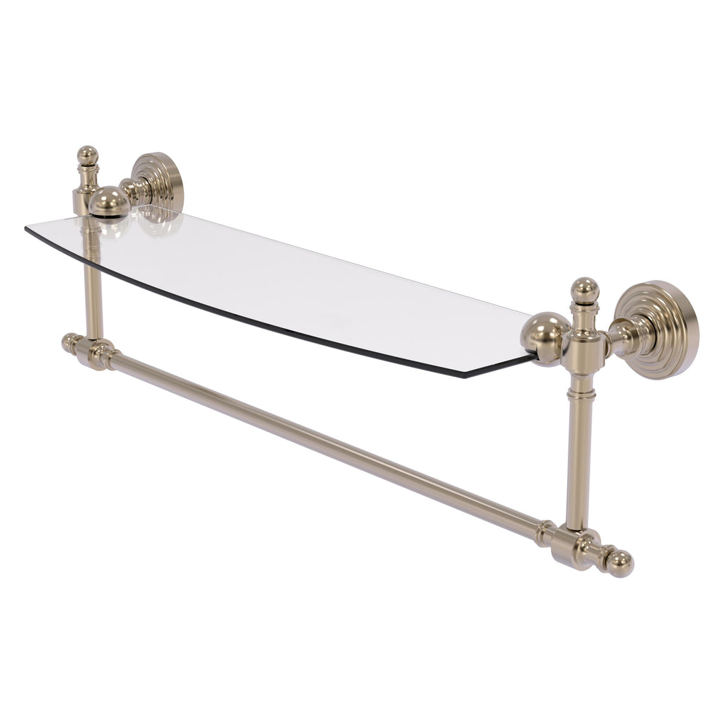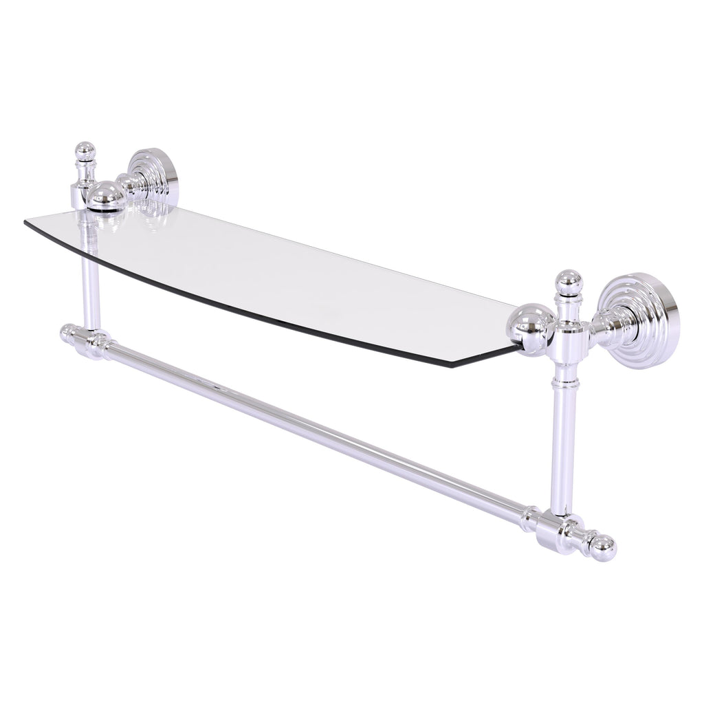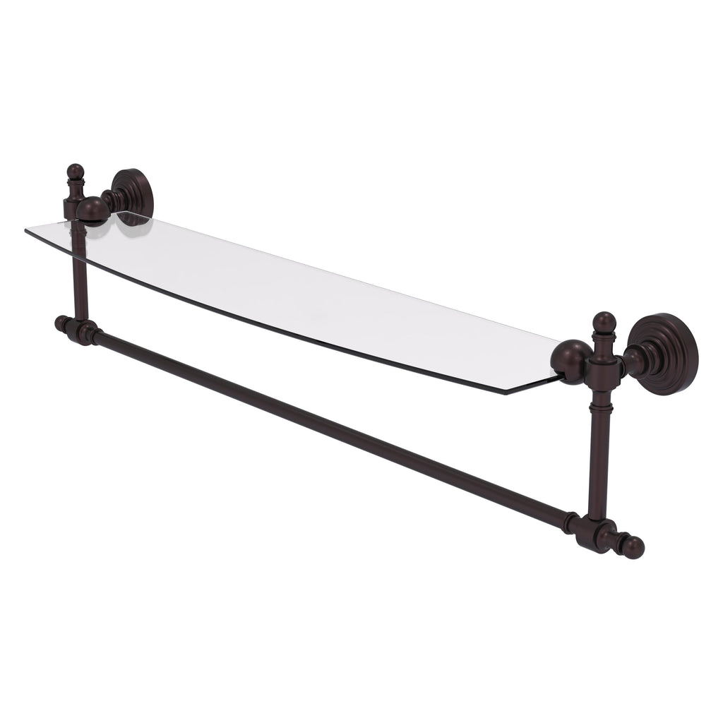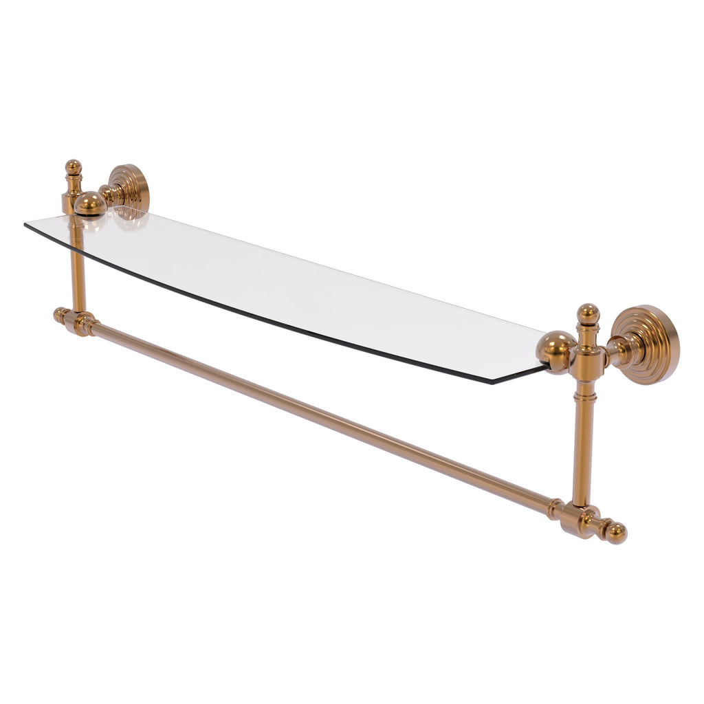 Add space and organization to your bathroom with this simple, contemporary style glass shelf. Featuring tempered, beveled-edged glass and solid brass hardware this shelf is crafted for durability, strength and style. Integrated towel bar provides space for your favorite decorative towels or for your everyday use. One of the many coordinating accessories in the Allied Brass Collection of products, this subtle glass shelf is the perfect complement to your bathroom decor.