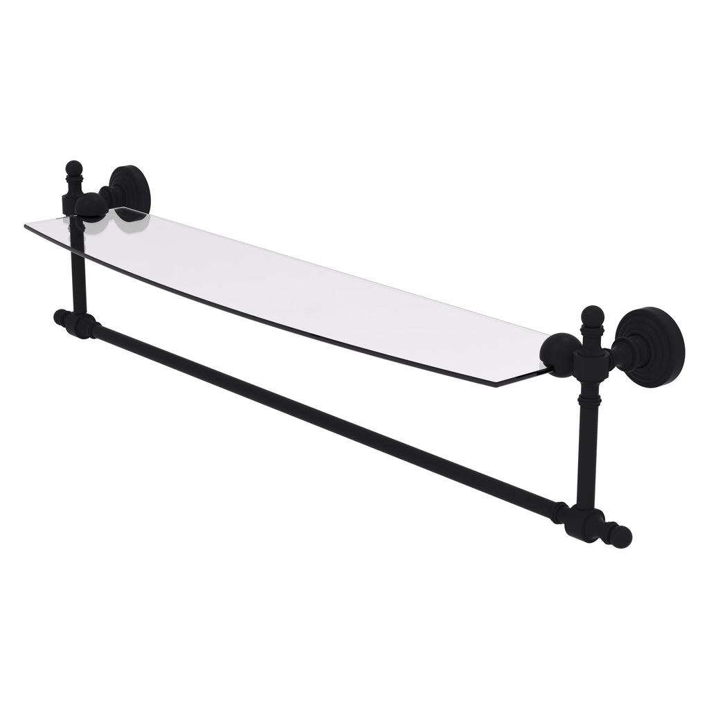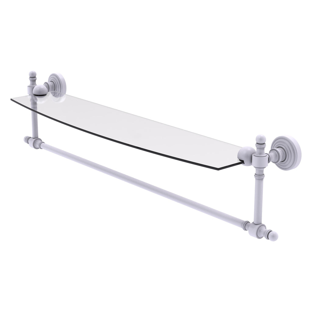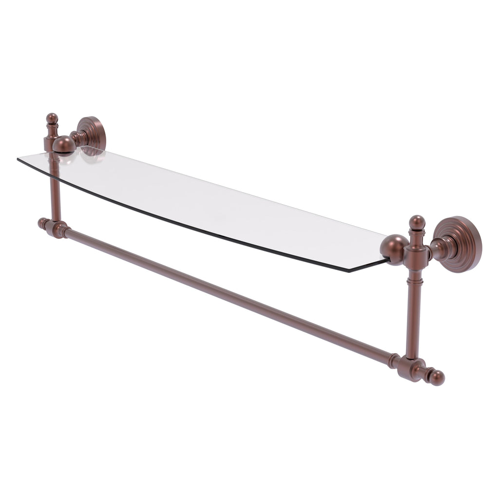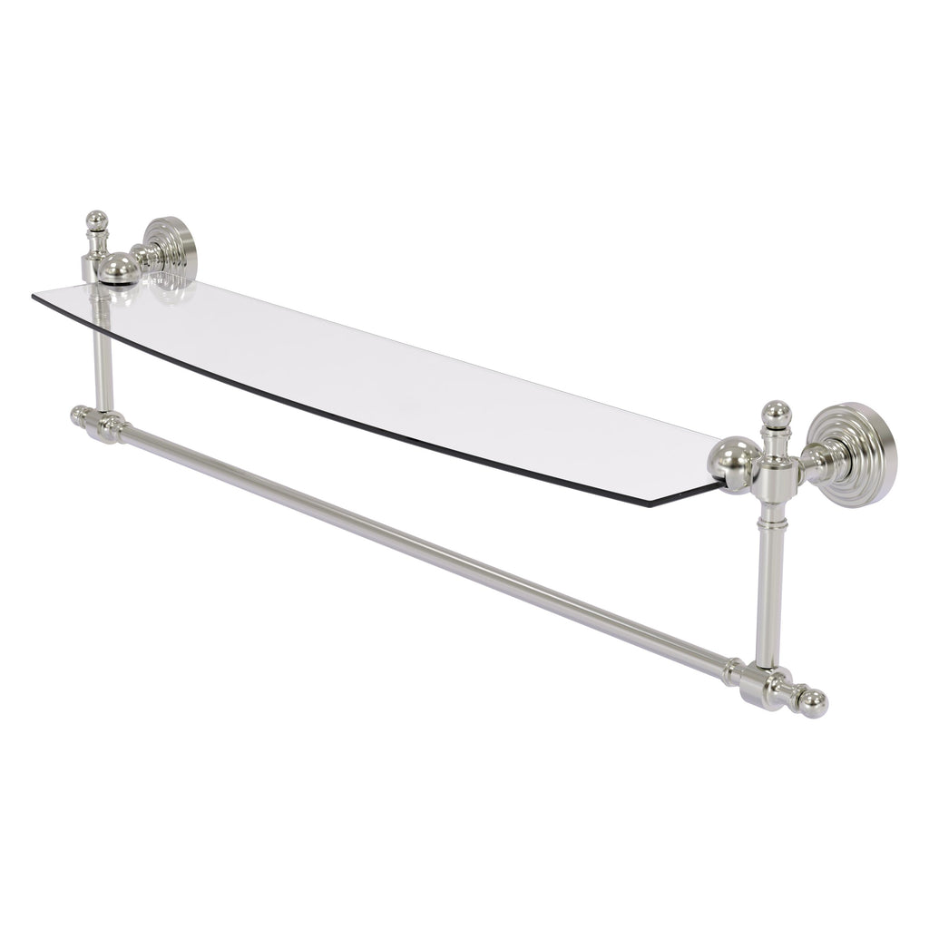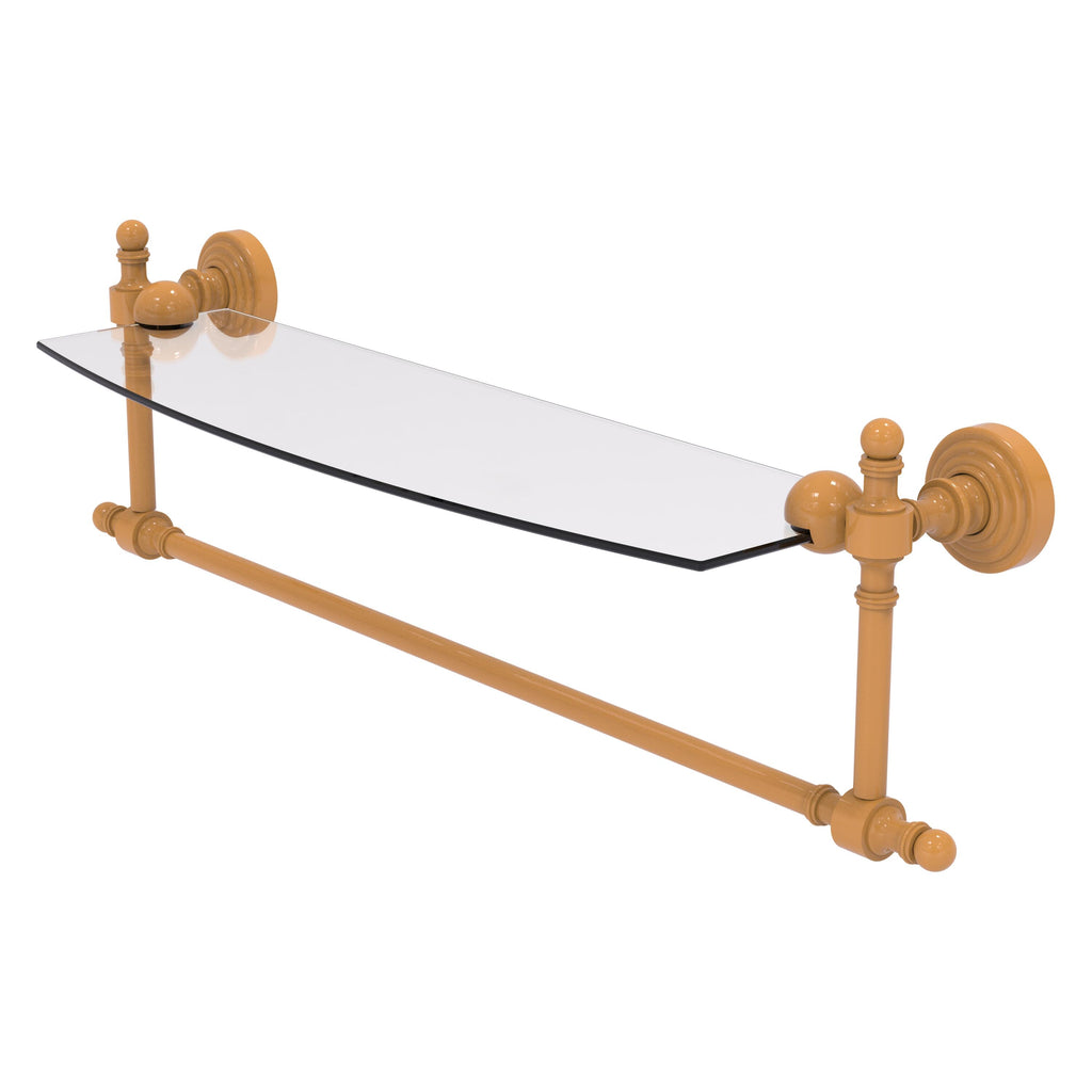 Add space and organization to your bathroom with this simple, contemporary style glass shelf. Featuring tempered, beveled-edged glass and solid brass hardware this shelf is crafted for durability, strength and style. Integrated towel bar provides space for your favorite decorative towels or for your everyday use. One of the many coordinating accessories in the Allied Brass Collection of products, this subtle glass shelf is the perfect complement to your bathroom decor.