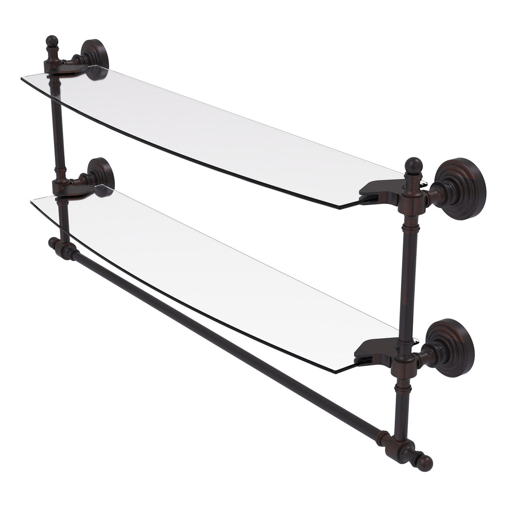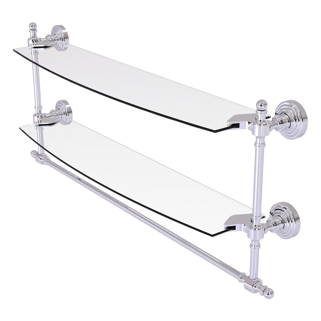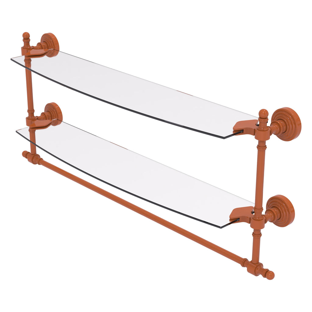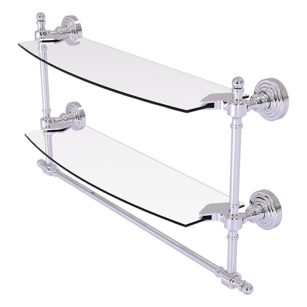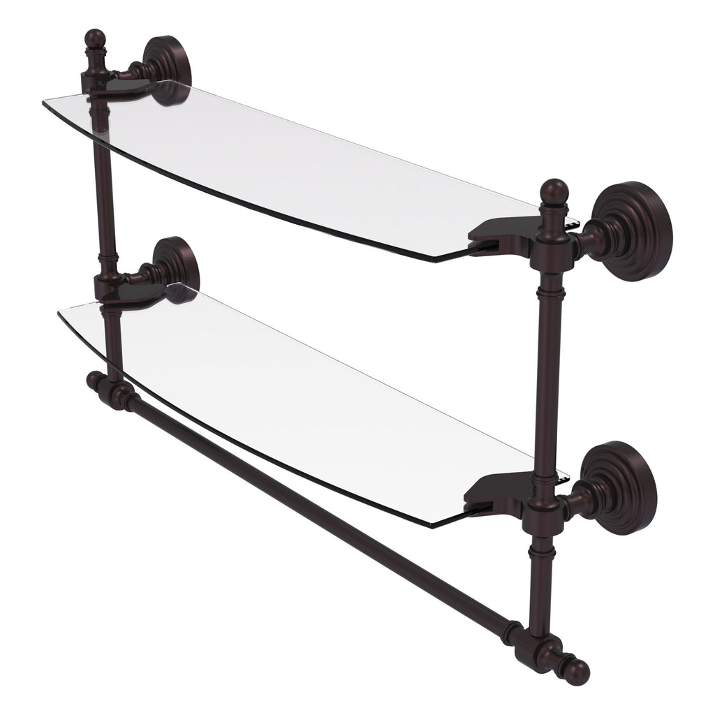 Add space and organization to your bathroom with this simple, contemporary style glass shelf. Featuring tempered, beveled-edged glass and solid brass hardware this shelf is crafted for durability, strength and style. Integrated towel bar provides space for your favorite decorative towels or for your everyday use. One of the many coordinating accessories in the Allied Brass Collection of products, this subtle glass shelf is the perfect complement to your bathroom decor.