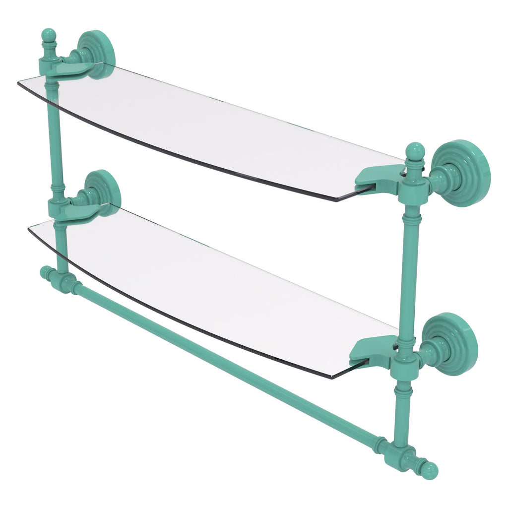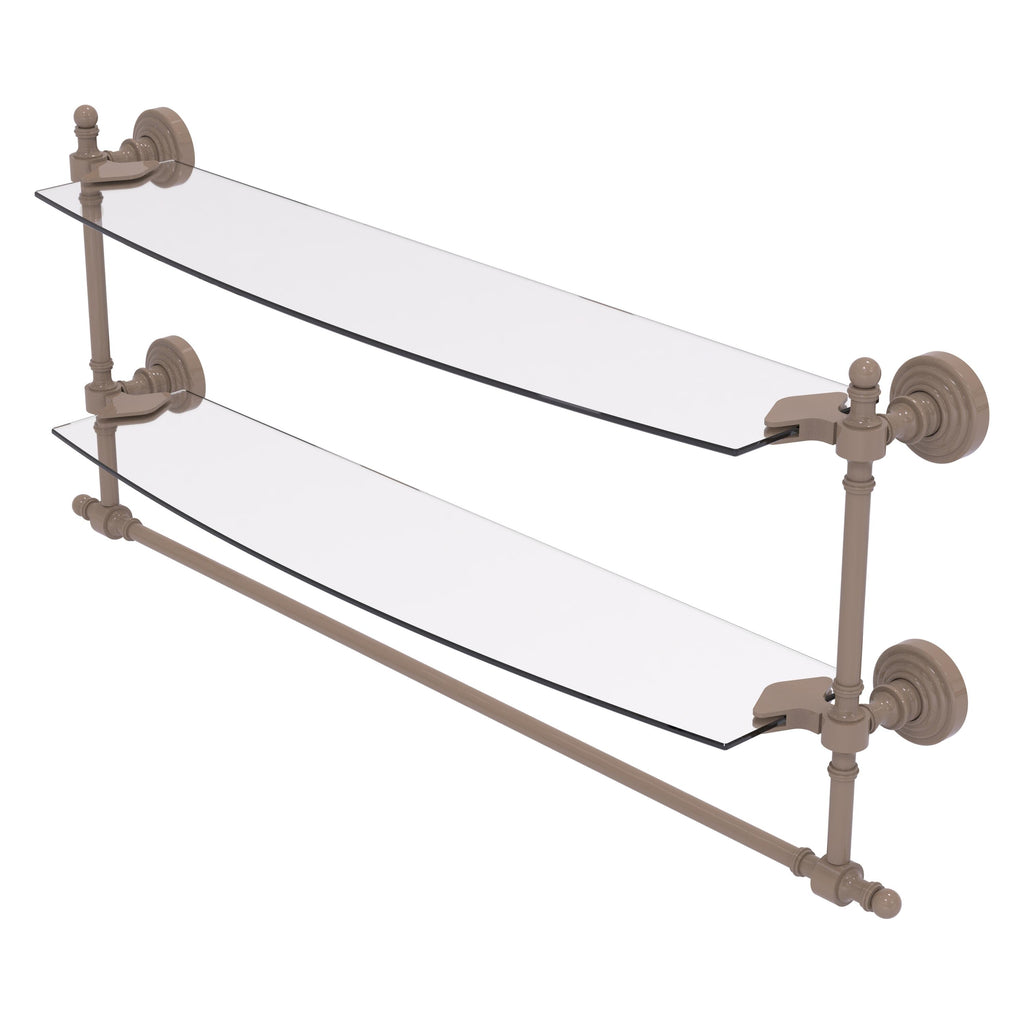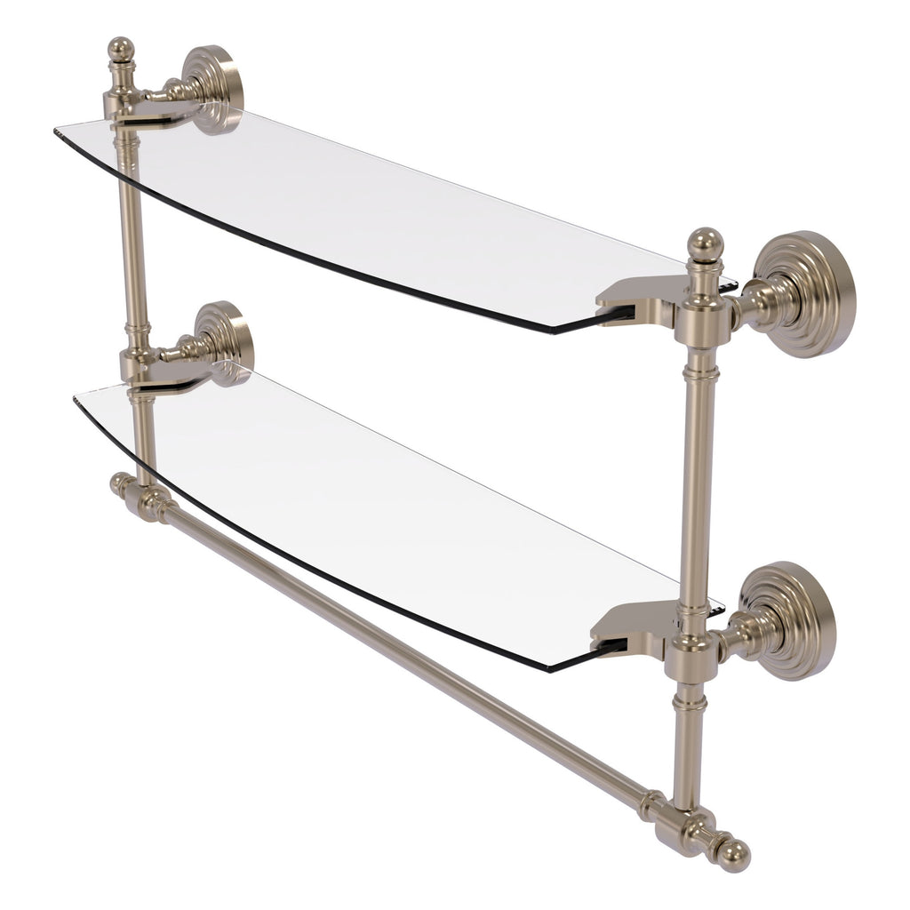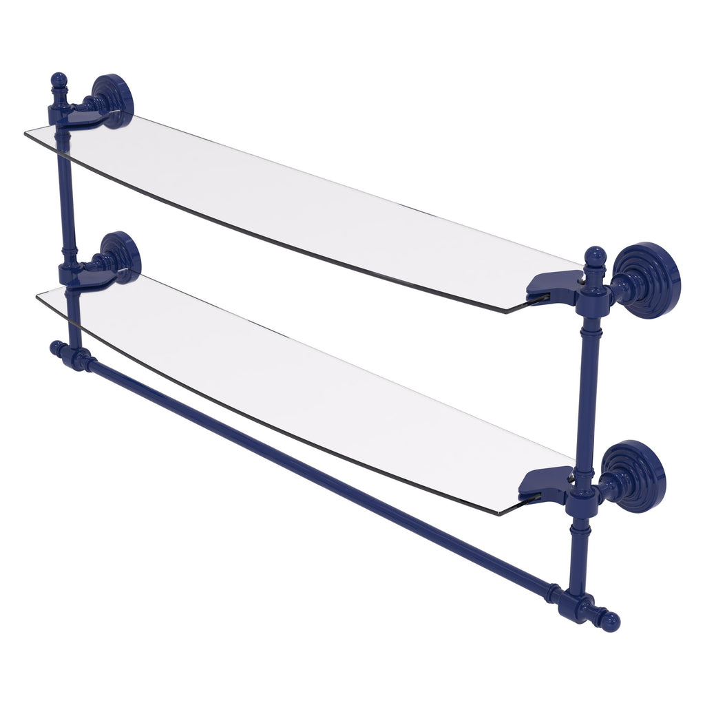 Add space and organization to your bathroom with this simple, contemporary style glass shelf. Featuring tempered, beveled-edged glass and solid brass hardware this shelf is crafted for durability, strength and style. Integrated towel bar provides space for your favorite decorative towels or for your everyday use. One of the many coordinating accessories in the Allied Brass Collection of products, this subtle glass shelf is the perfect complement to your bathroom decor.