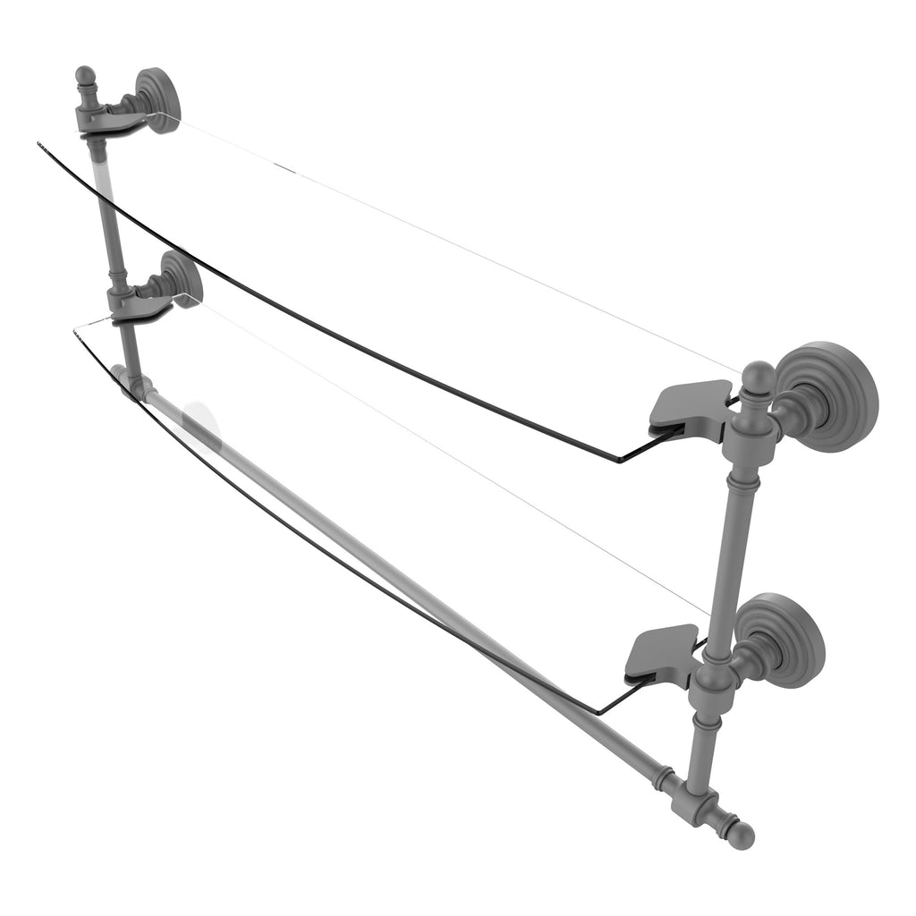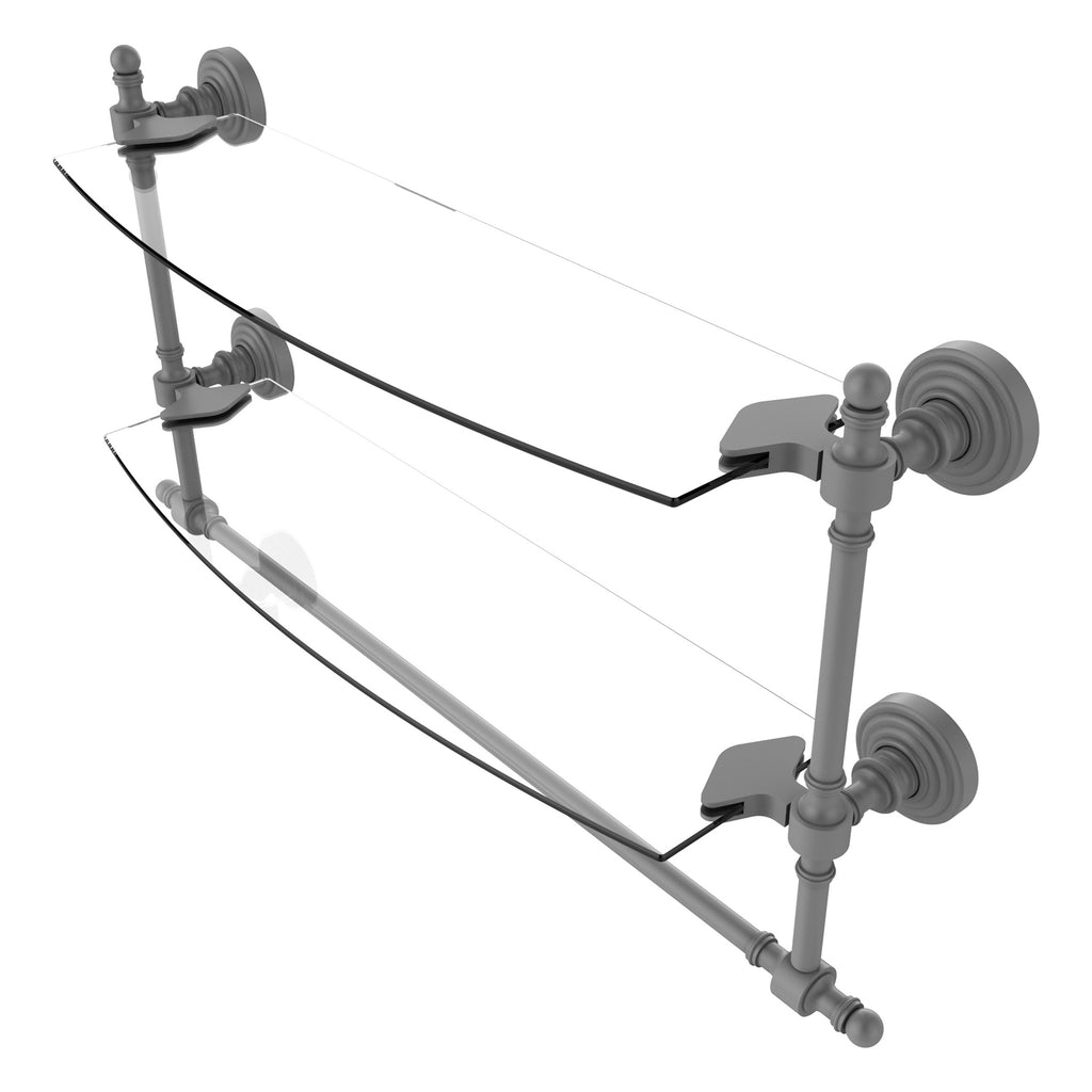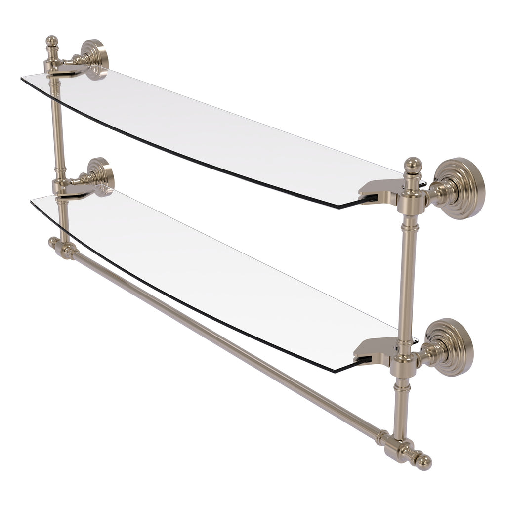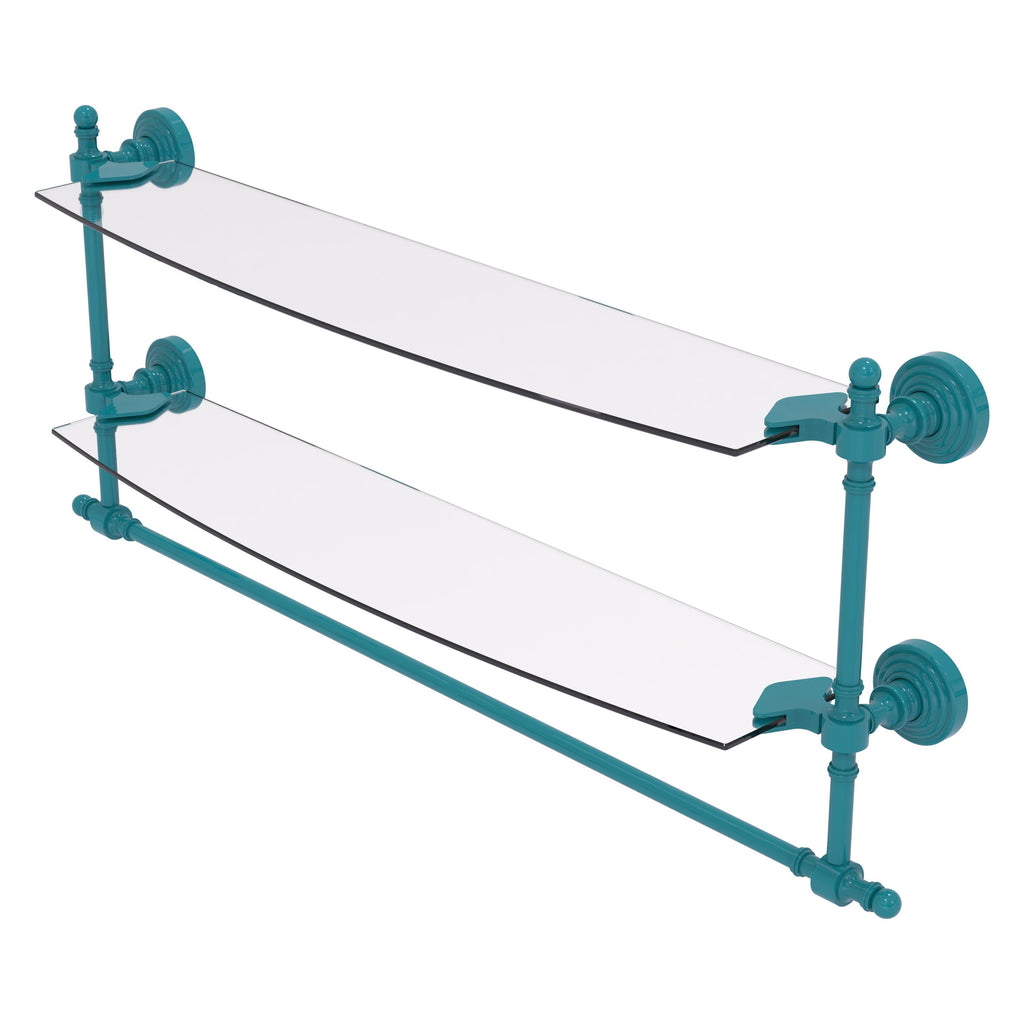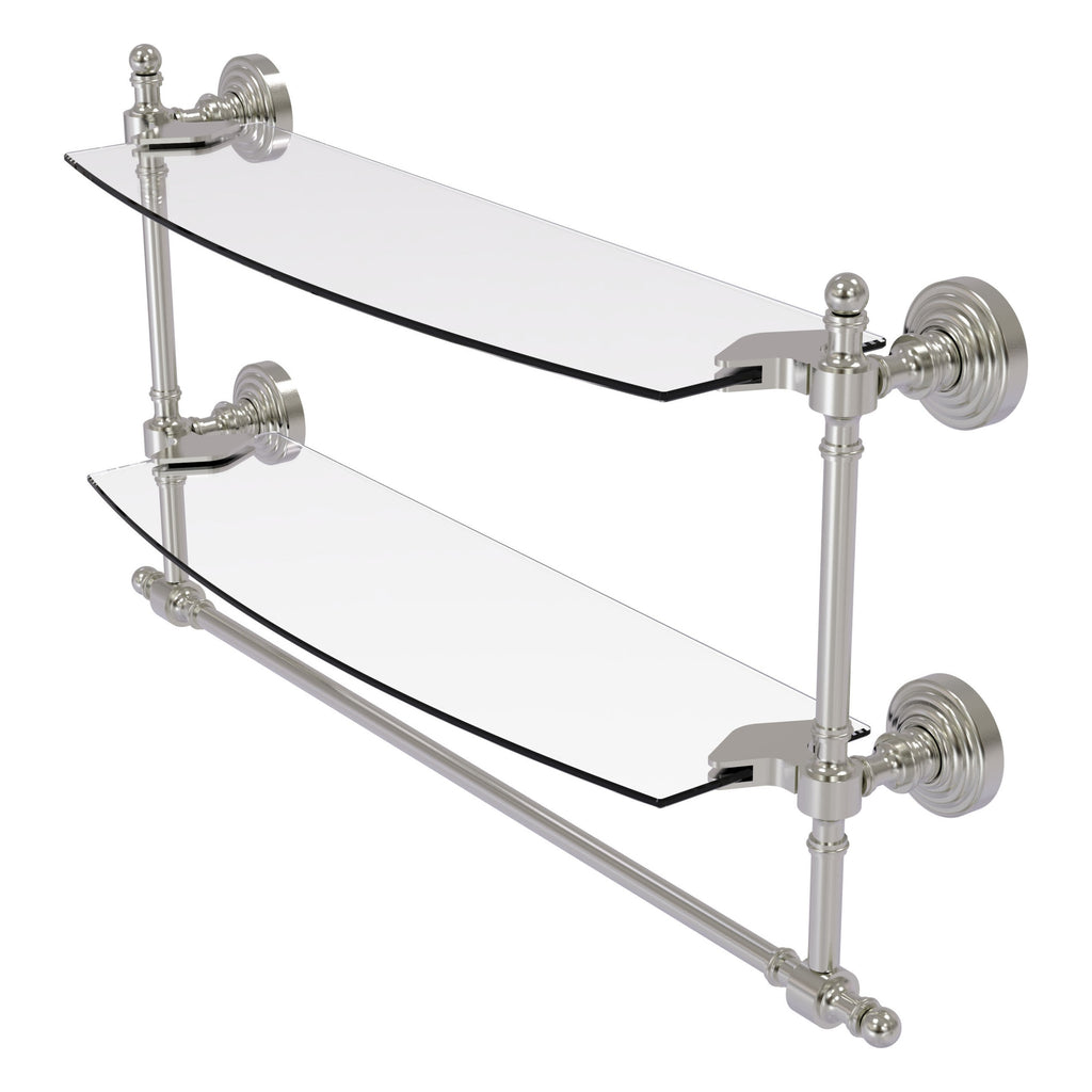 Add space and organization to your bathroom with this simple, contemporary style glass shelf. Featuring tempered, beveled-edged glass and solid brass hardware this shelf is crafted for durability, strength and style. Integrated towel bar provides space for your favorite decorative towels or for your everyday use. One of the many coordinating accessories in the Allied Brass Collection of products, this subtle glass shelf is the perfect complement to your bathroom decor.