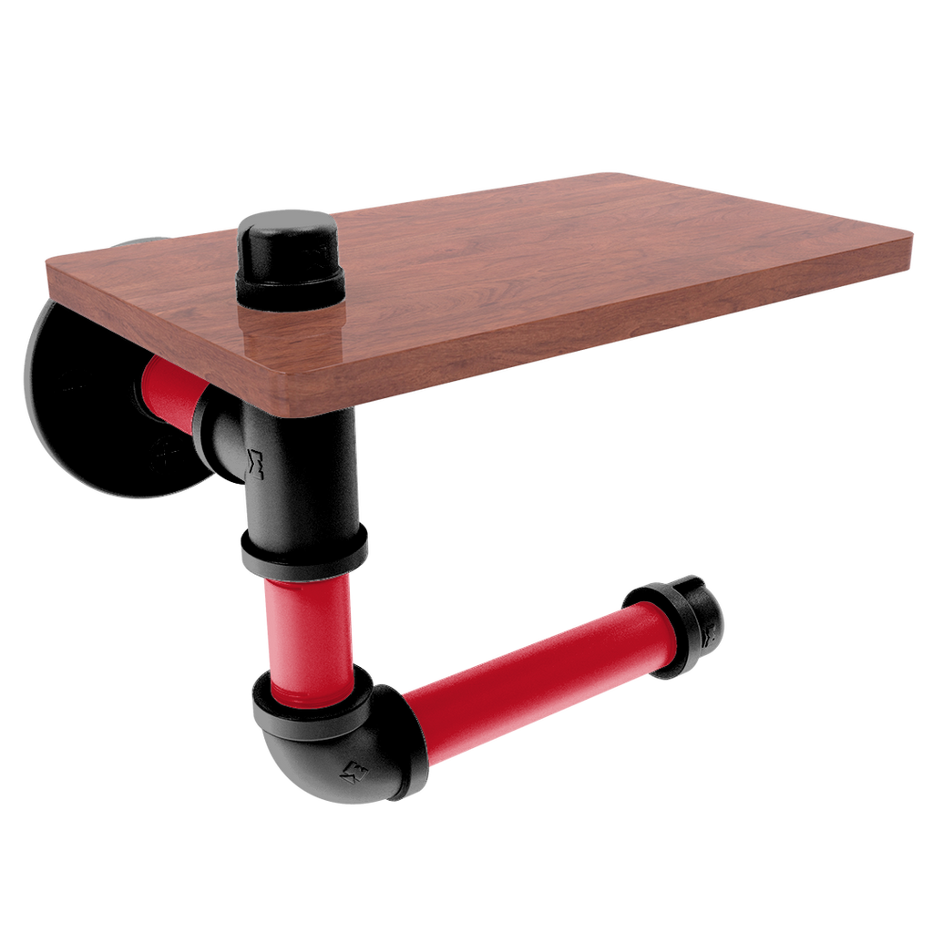 The innovative design includes a wooden shelf situated above the roll, providing a convenient space for personal items or extra toilet paper storage. This added functionality makes it an indispensable fixture for fans who value efficiency and flair. The wood's rich texture compliments the industrial aesthetic of the powder-coated pipe, blending modern and traditional elements seamlessly.