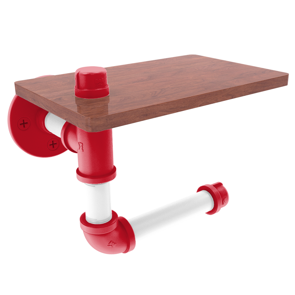 The innovative design includes a wooden shelf situated above the roll, providing a convenient space for personal items or extra toilet paper storage. This added functionality makes it an indispensable fixture for fans who value efficiency and flair. The wood's rich texture compliments the industrial aesthetic of the powder-coated pipe, blending modern and traditional elements seamlessly.