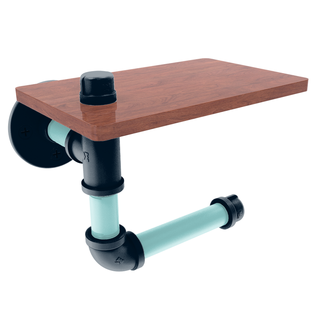 The innovative design includes a wooden shelf situated above the roll, providing a convenient space for personal items or extra toilet paper storage. This added functionality makes it an indispensable fixture for fans who value efficiency and flair. The wood's rich texture compliments the industrial aesthetic of the powder-coated pipe, blending modern and traditional elements seamlessly.