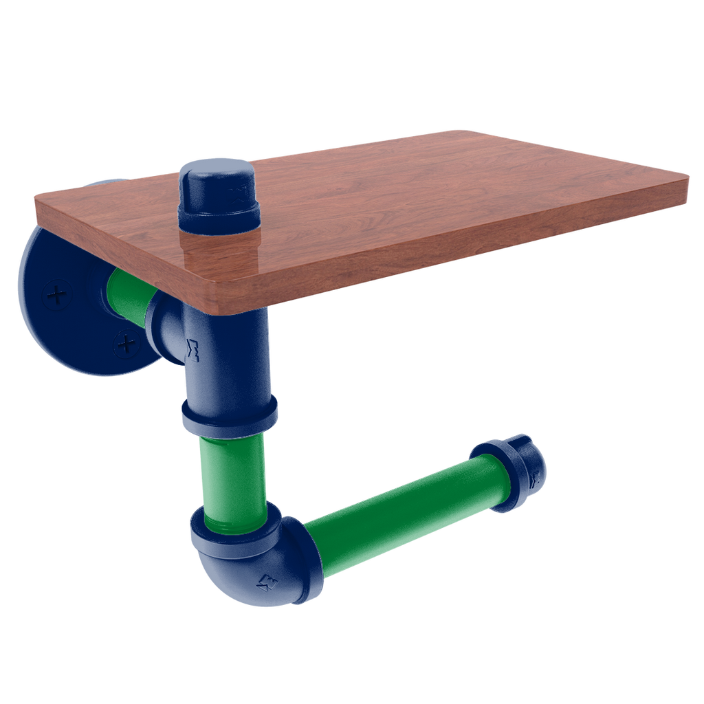 The innovative design includes a wooden shelf situated above the roll, providing a convenient space for personal items or extra toilet paper storage. This added functionality makes it an indispensable fixture for fans who value efficiency and flair. The wood's rich texture compliments the industrial aesthetic of the powder-coated pipe, blending modern and traditional elements seamlessly.