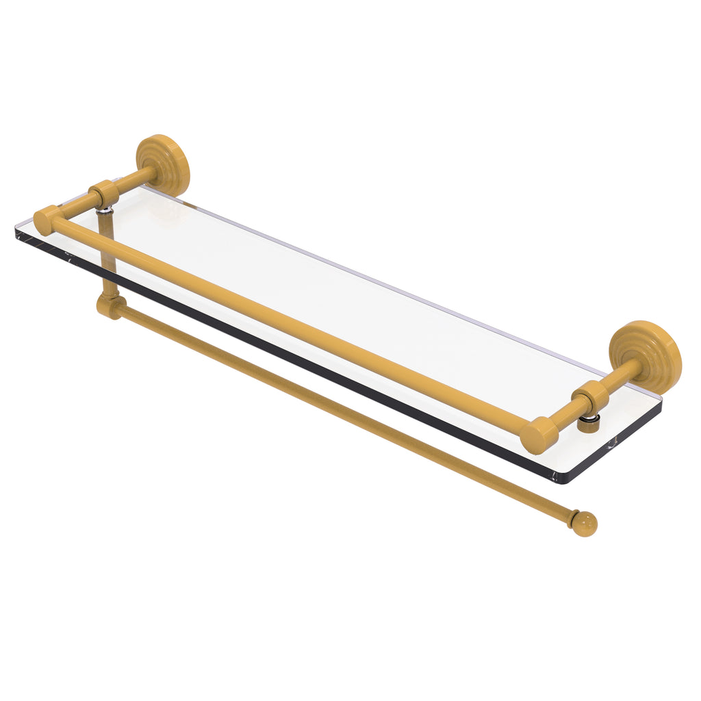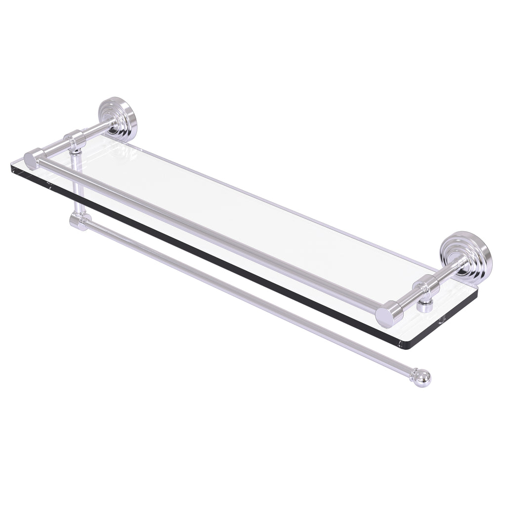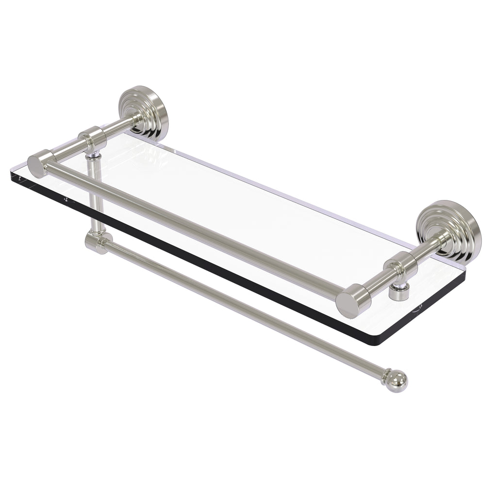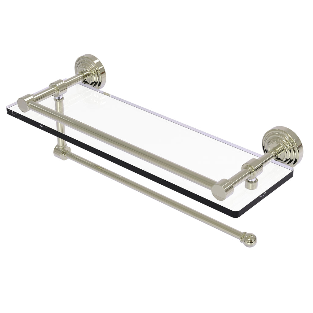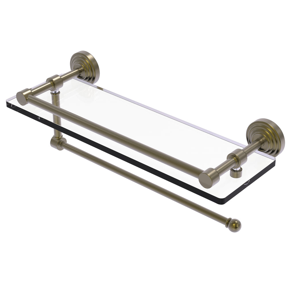 Maximize space and efficiency with this beautiful glass shelf and paper towel holder combination. Gallery rail will keep your items secure while the integrated paper towel holder provides a creative space for your roll. Made of solid brass and tempered