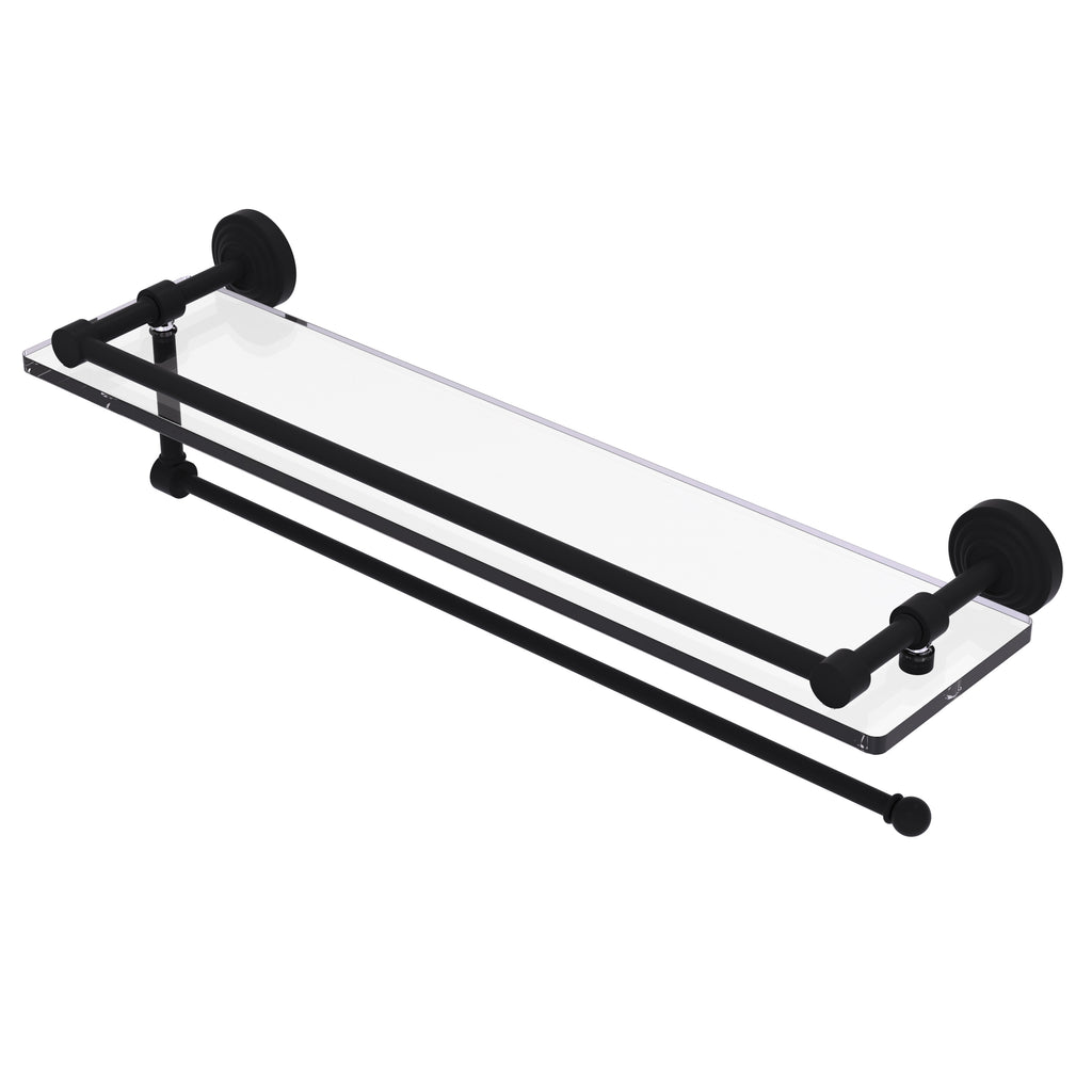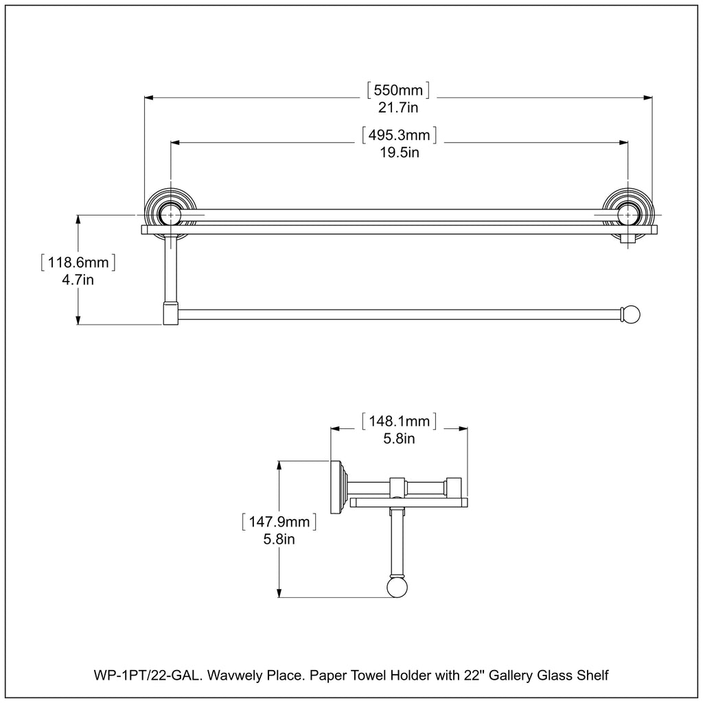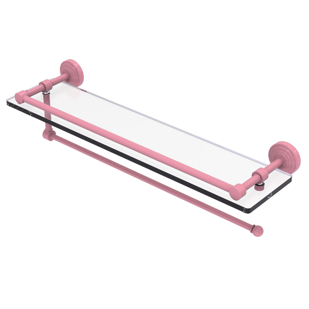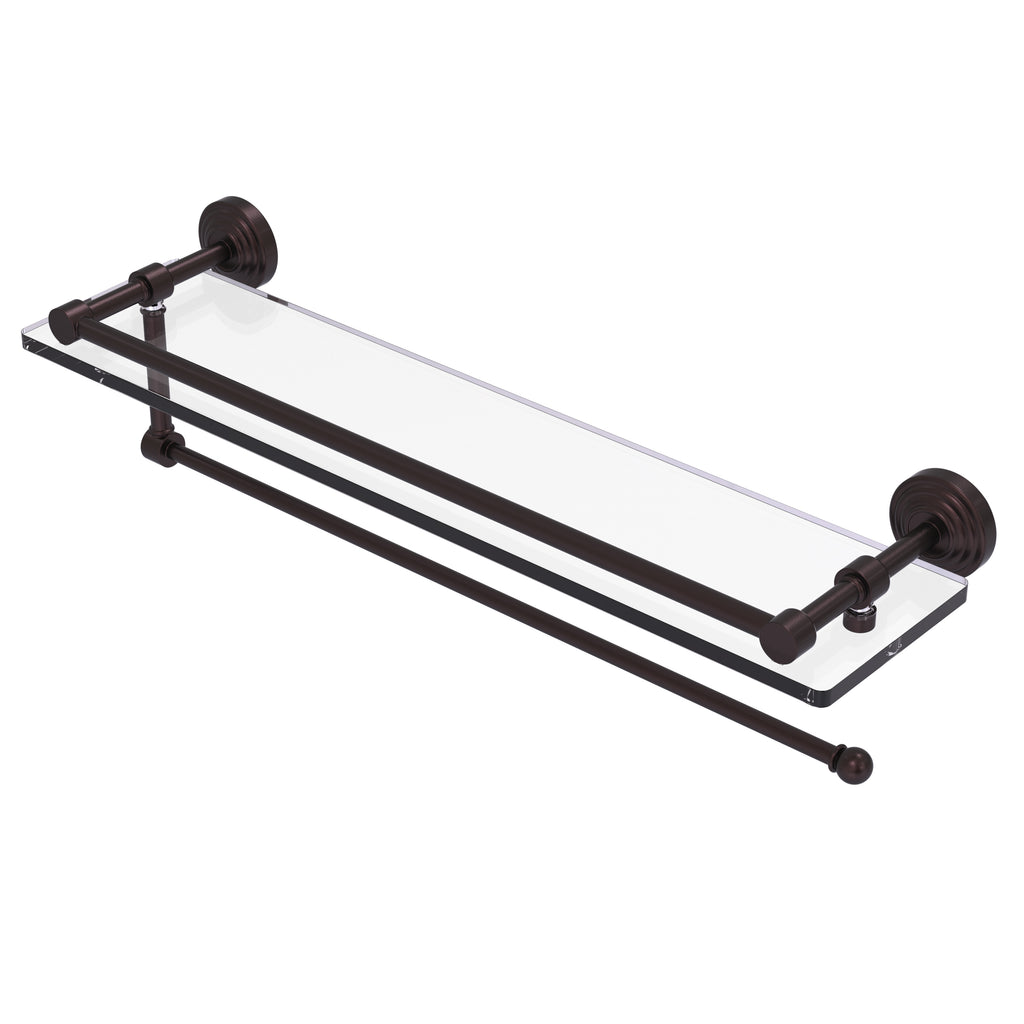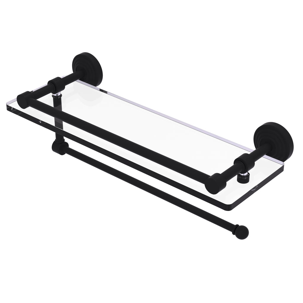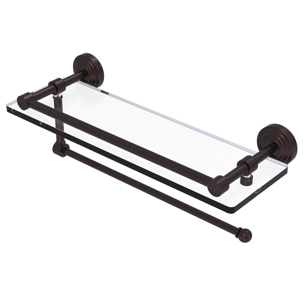 Maximize space and efficiency with this beautiful glass shelf and paper towel holder combination. Gallery rail will keep your items secure while the integrated paper towel holder provides a creative space for your roll. Made of solid brass and tempered