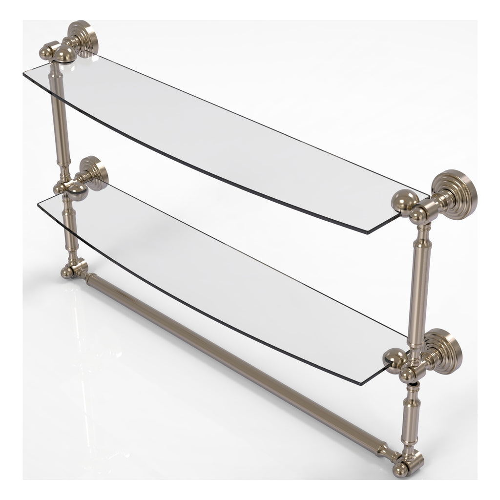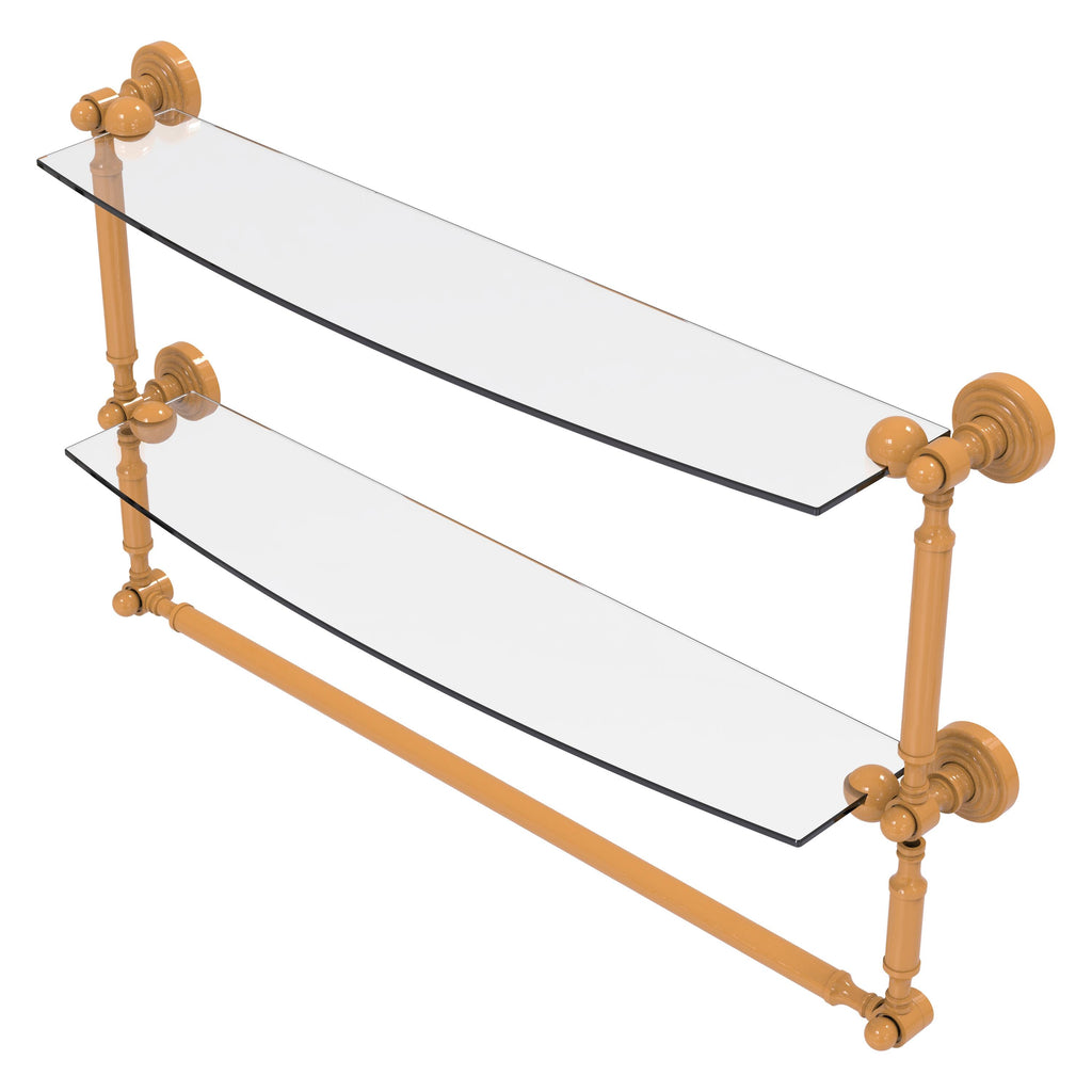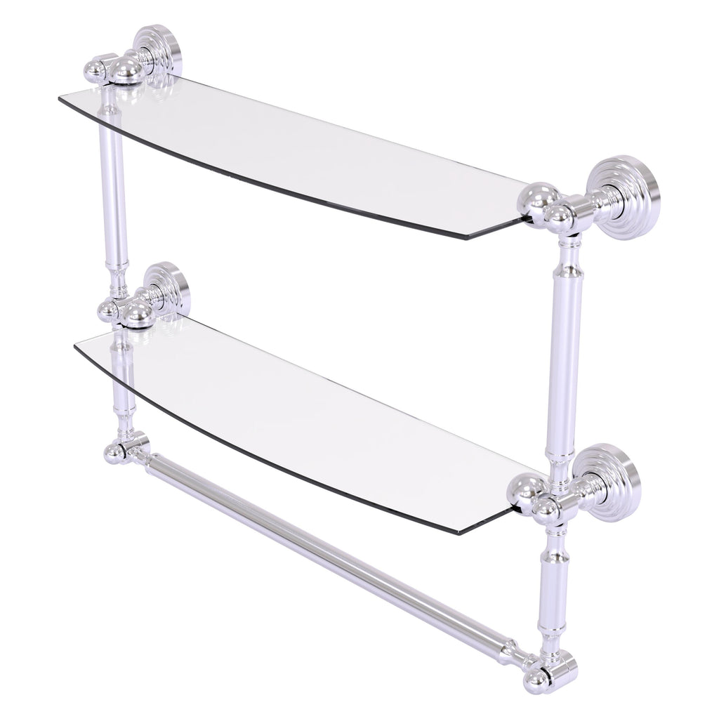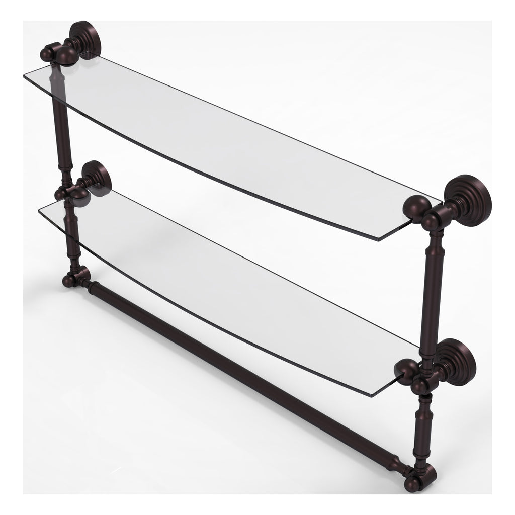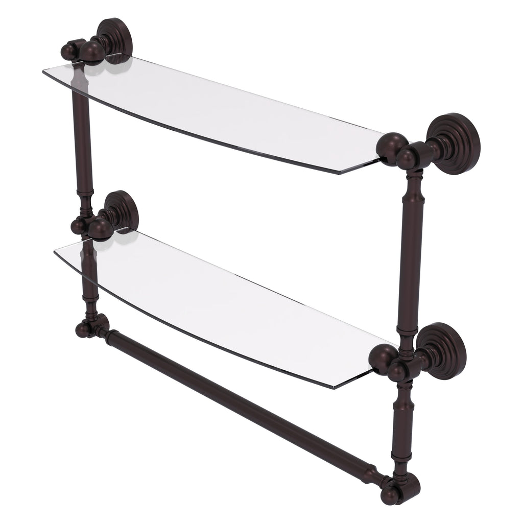 Add space and organization to your bathroom with this simple, contemporary style glass shelf. Featuring tempered, beveled-edged glass and solid brass hardware this shelf is crafted for durability, strength and style. Integrated towel bar provides space for your favorite decorative towels or for your everyday use. One of the many coordinating accessories in the Allied Brass Collection of products, this subtle glass shelf is the perfect complement to your bathroom decor.