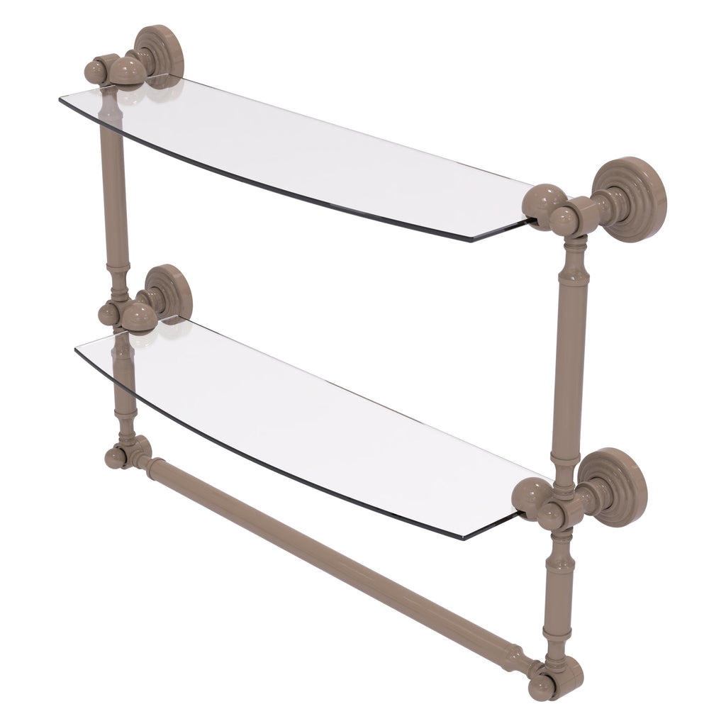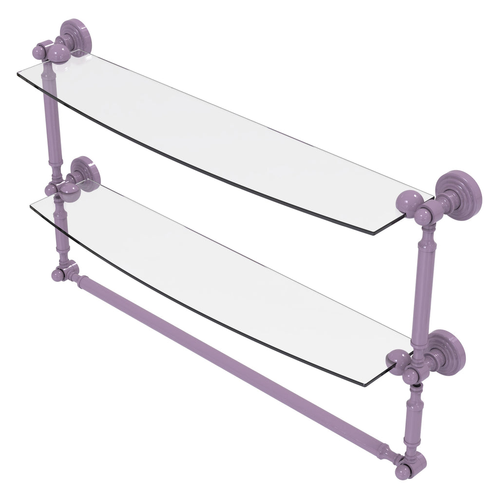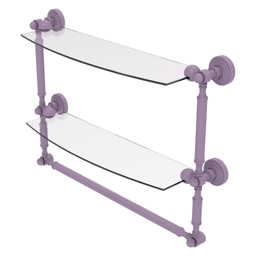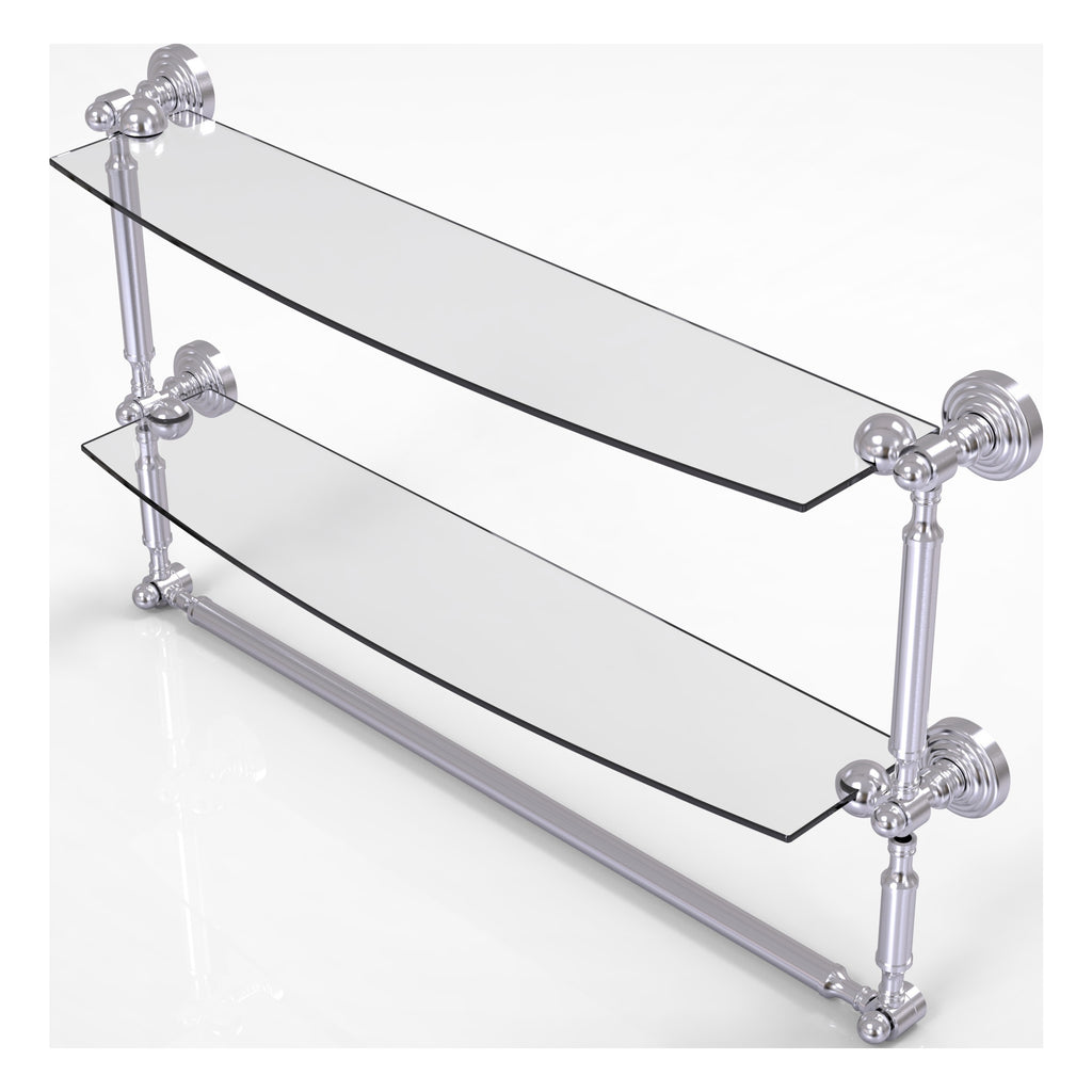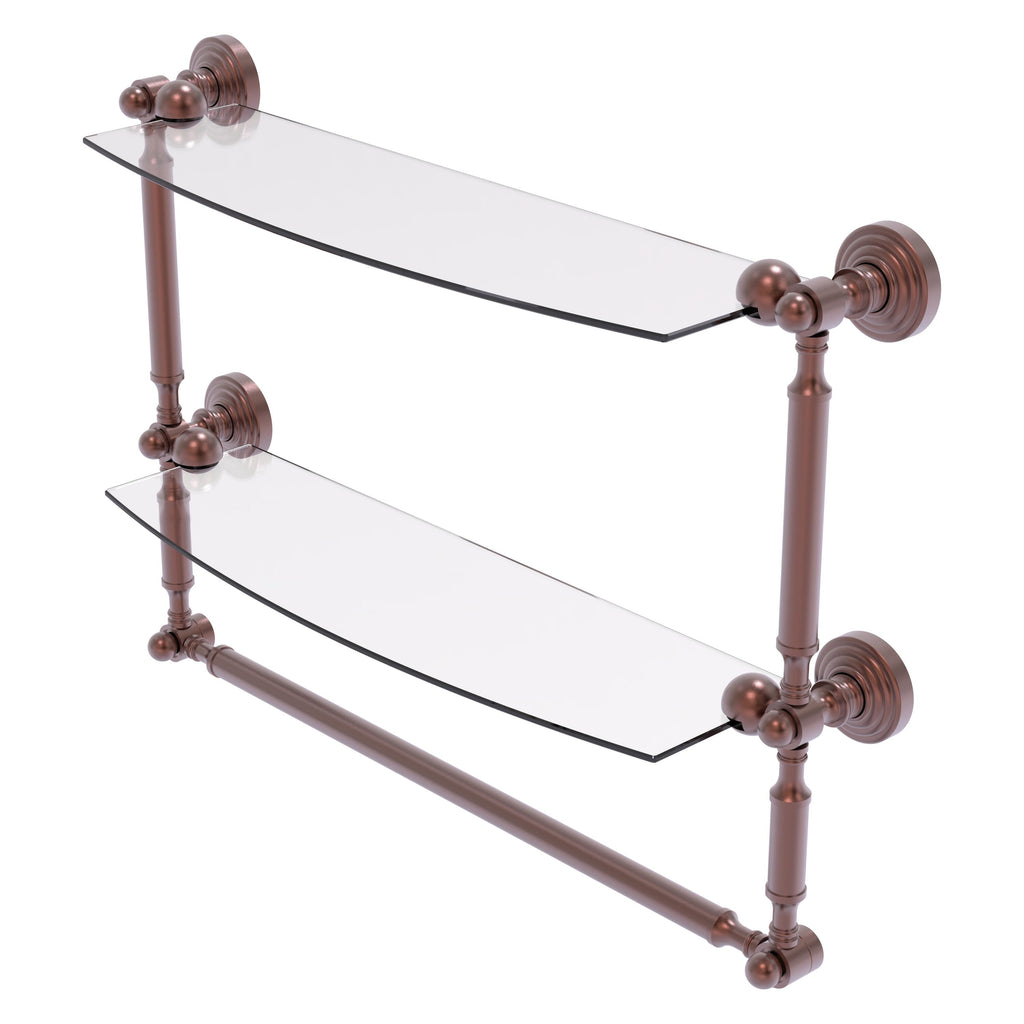Add space and organization to your bathroom with this simple, contemporary style glass shelf. Featuring tempered, beveled-edged glass and solid brass hardware this shelf is crafted for durability, strength and style. Integrated towel bar provides space for your favorite decorative towels or for your everyday use. One of the many coordinating accessories in the Allied Brass Collection of products, this subtle glass shelf is the perfect complement to your bathroom decor.