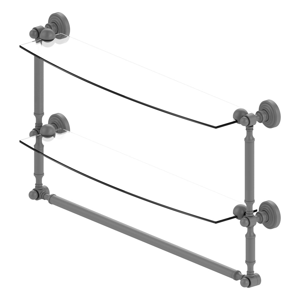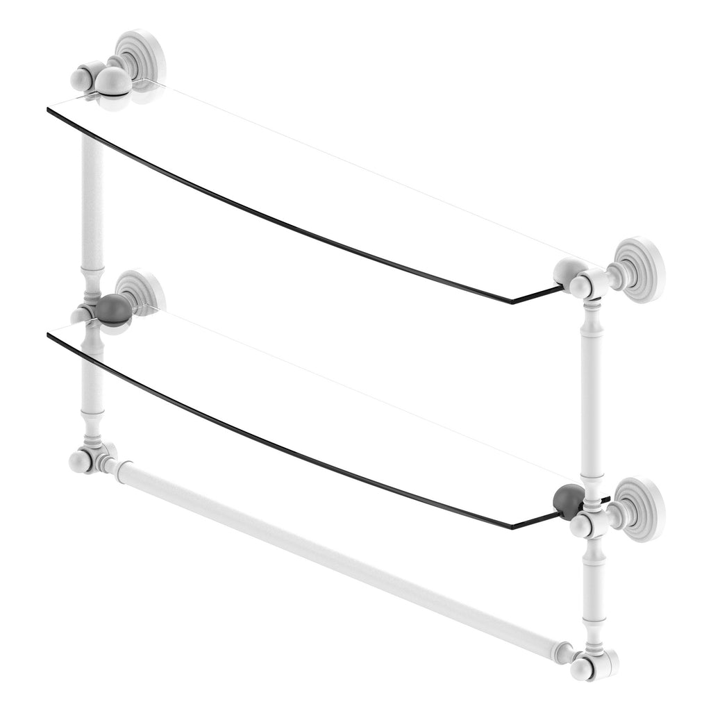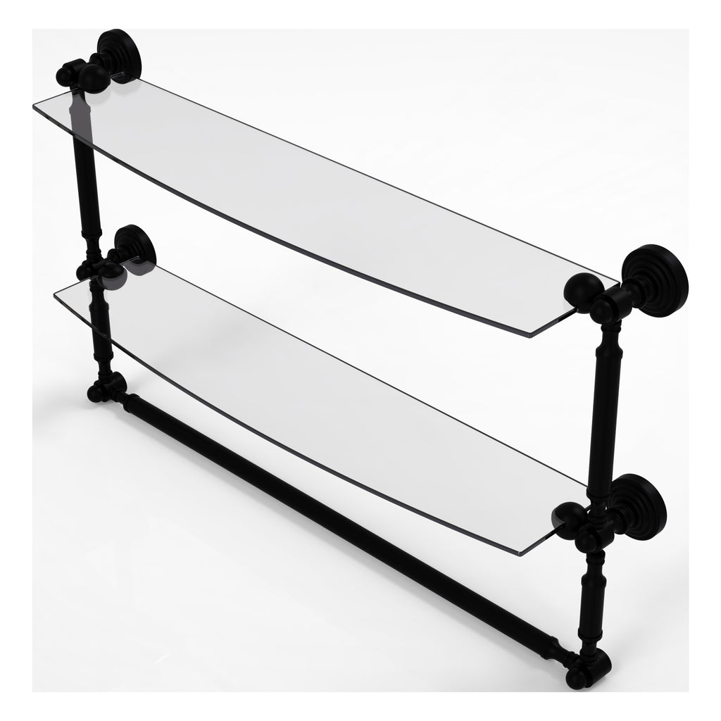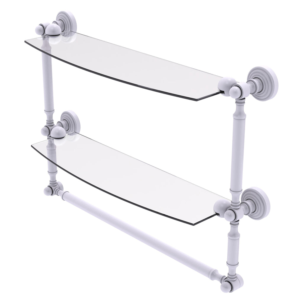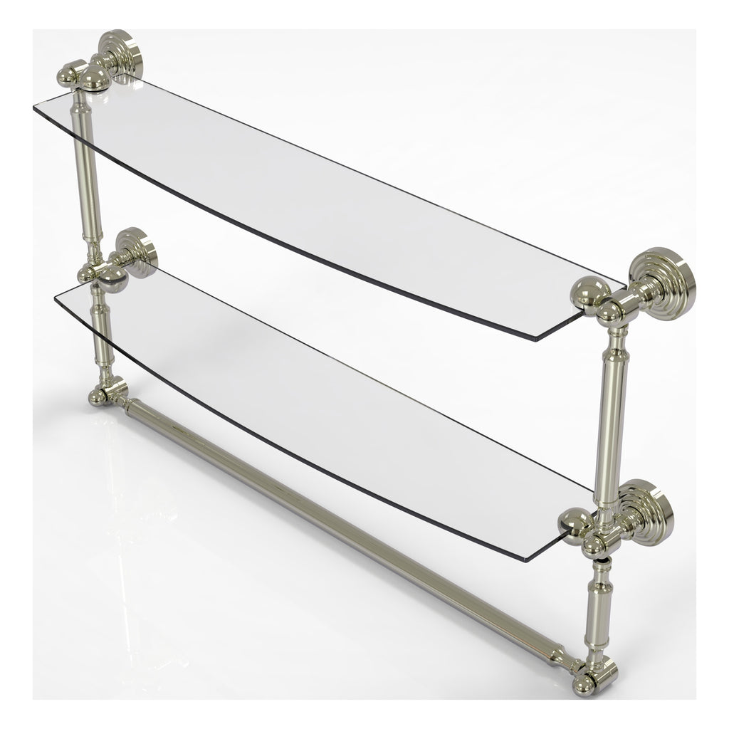 Add space and organization to your bathroom with this simple, contemporary style glass shelf. Featuring tempered, beveled-edged glass and solid brass hardware this shelf is crafted for durability, strength and style. Integrated towel bar provides space for your favorite decorative towels or for your everyday use. One of the many coordinating accessories in the Allied Brass Collection of products, this subtle glass shelf is the perfect complement to your bathroom decor.